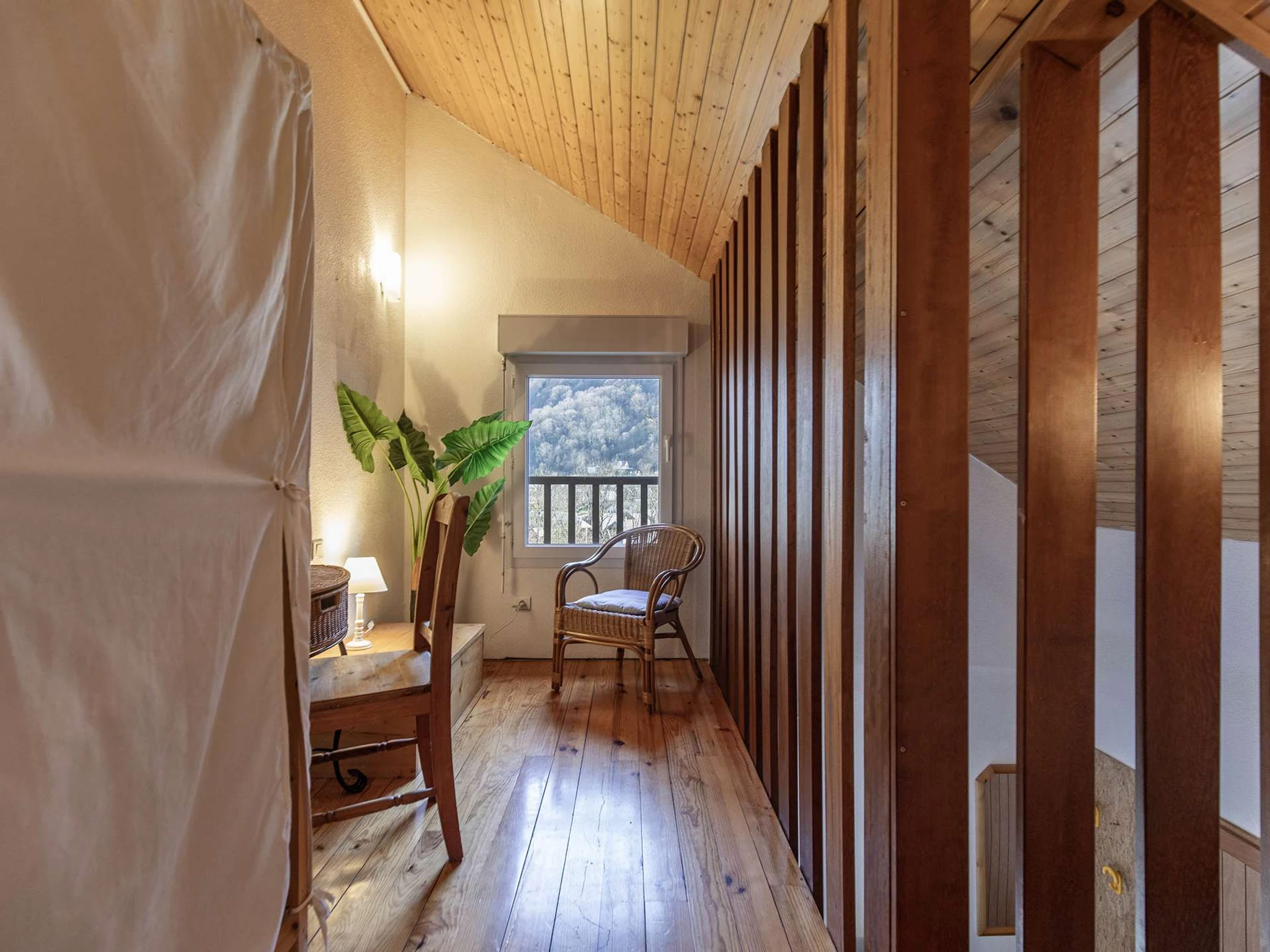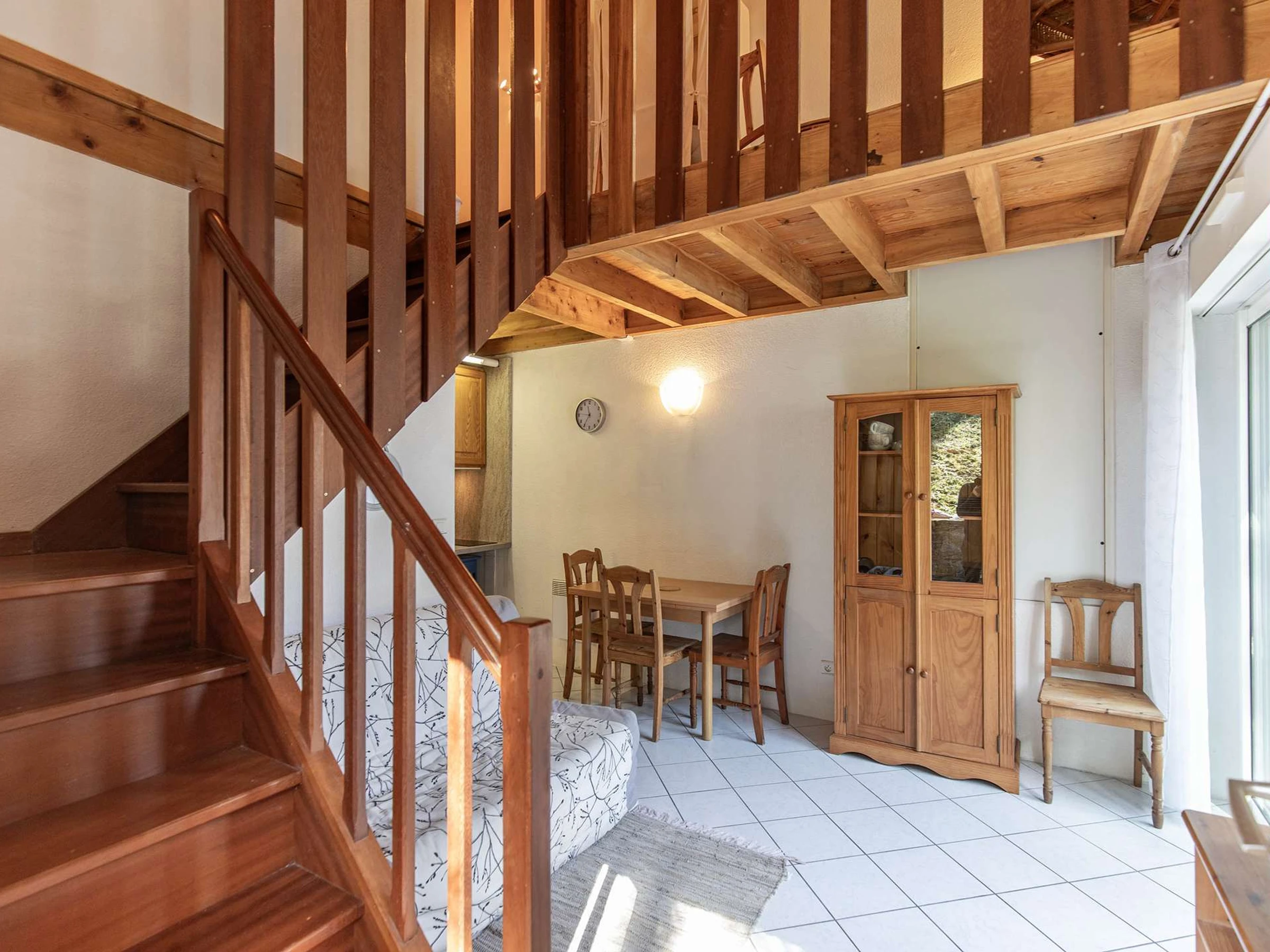 Arriba, un salón de relajación con un ventanal con una vista extraordinaria acogerá sus momentos de relajación, el dormitorio tiene una cama de 140 cm y espacio de almacenamiento.
