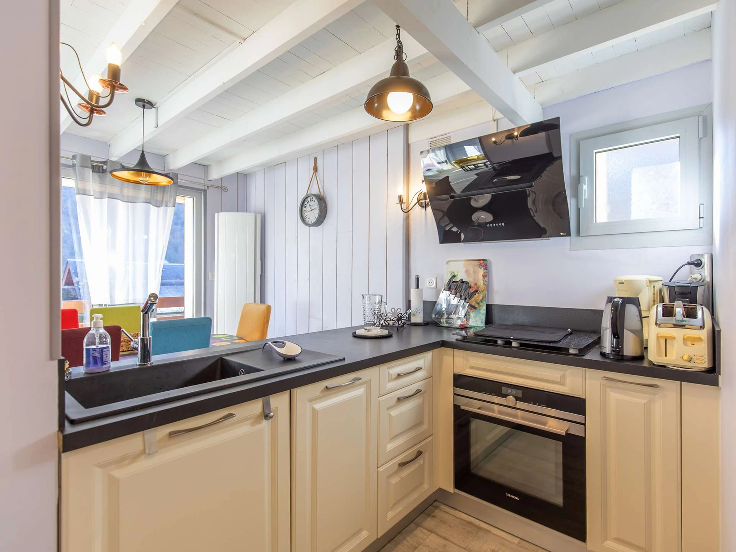 Manténgase equipado con televisor, sofá cama para 2 personas, área de comedor y cocina abierta equipada con: placa de inducción, horno, nevera con congelador, cafetera de filtro, cafetera Senseo, lavavajillas, horno de microondas.