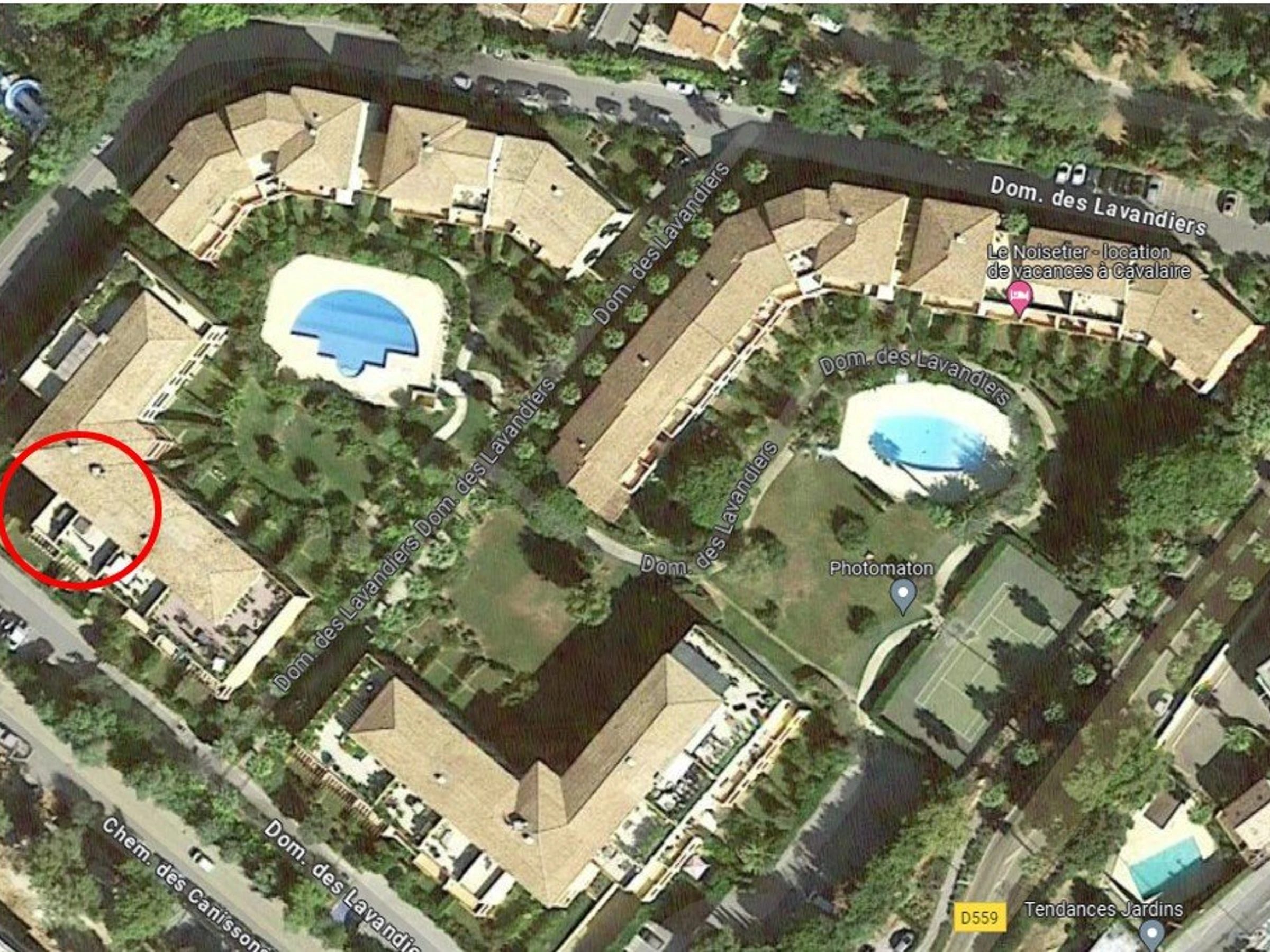 En una residencia segura con dos piscinas y una pista de tenis.