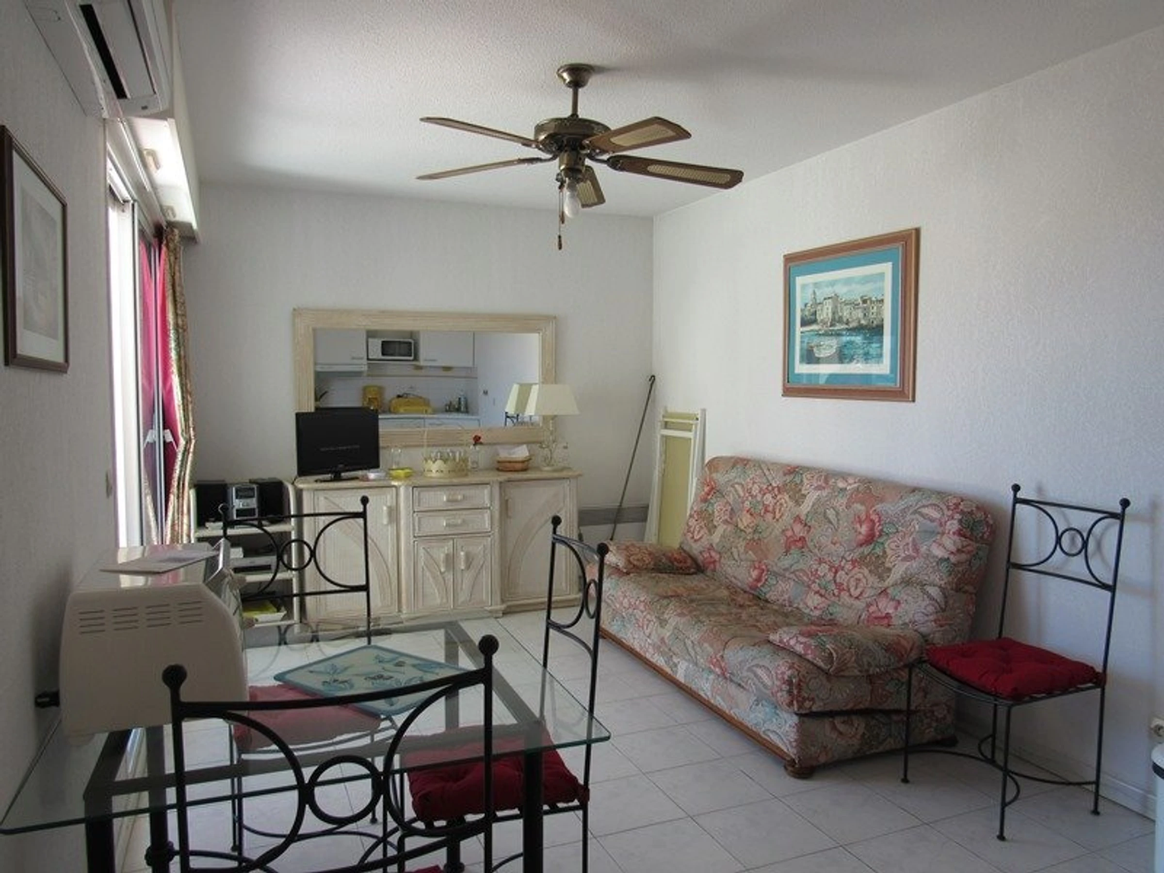 Salón: 1 sofá cama, 1 televisor, 1 mesa y 4 sillas, TV, aire acondicionado, trastero.