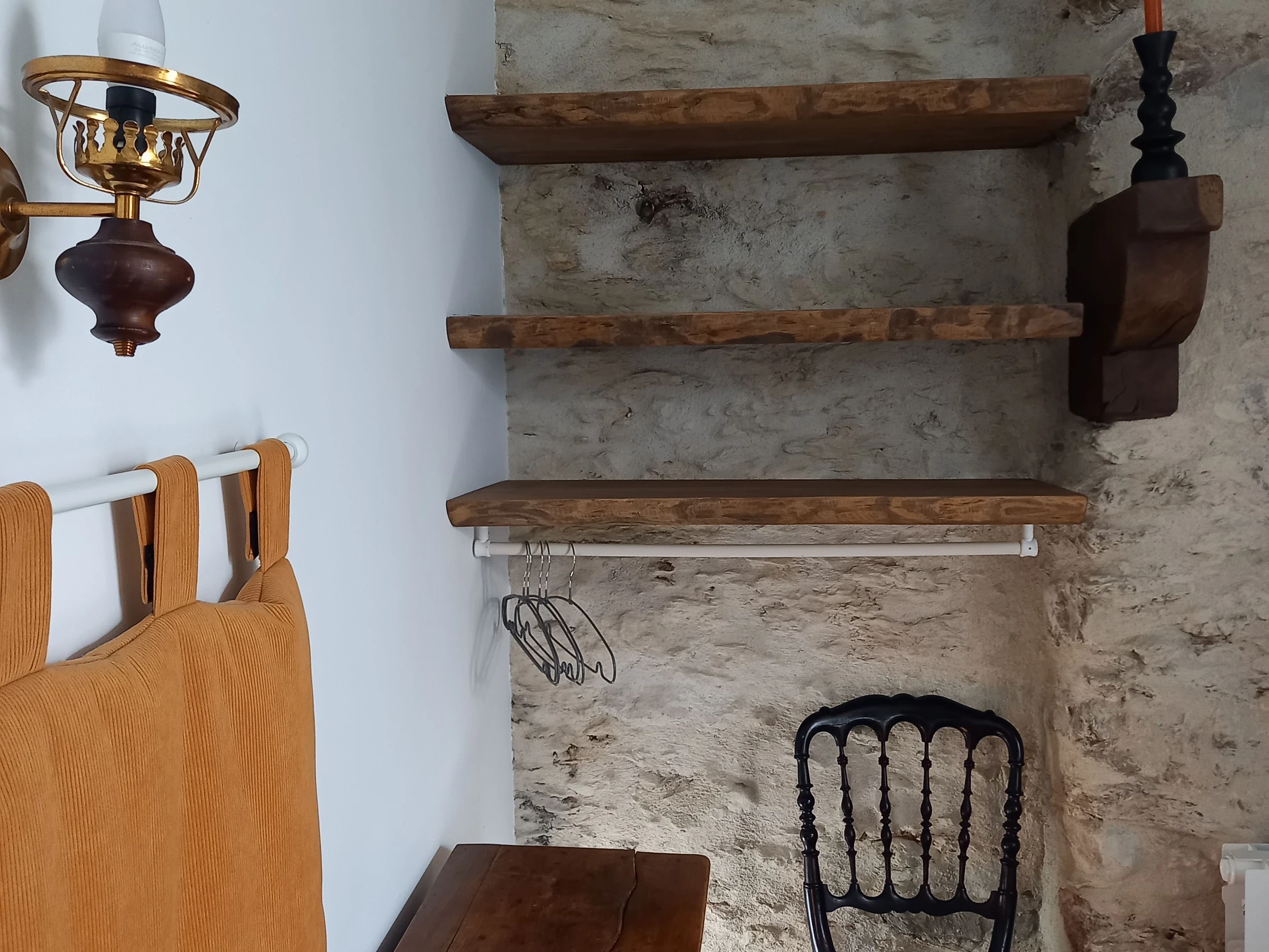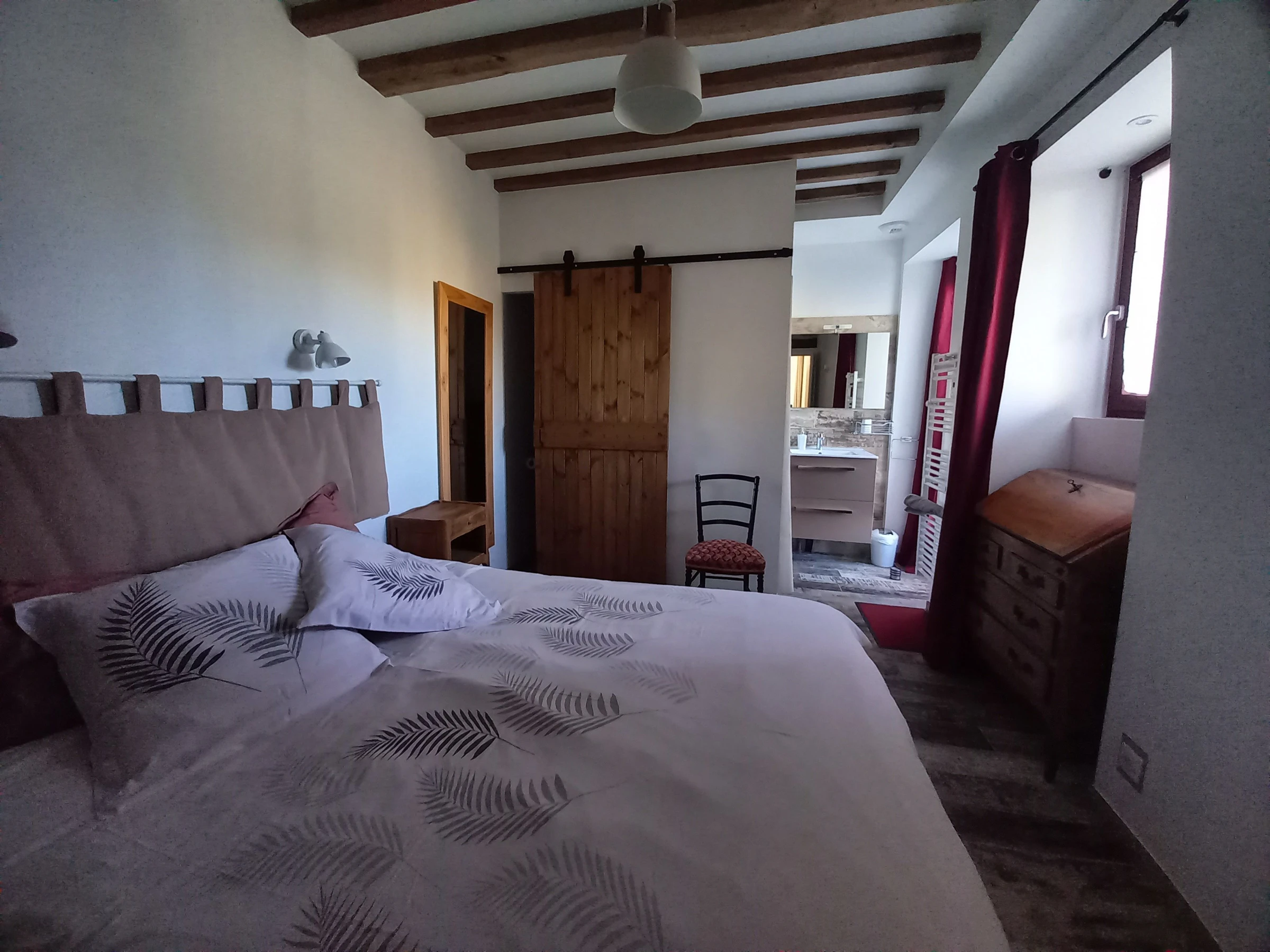 La casa, contigua a la casa de los propietarios, consta de un salón-comedor-cocina en la planta baja, un primer dormitorio (una cama doble) con ducha y aseo, y un segundo dormitorio (una cama queen-size) con baño y aseo. En la planta superior, una escalera cubierta situada en la terraza de entrada conduce a un tercer dormitorio (una cama queen-size + dos camas individuales nido) con baño y aseo.