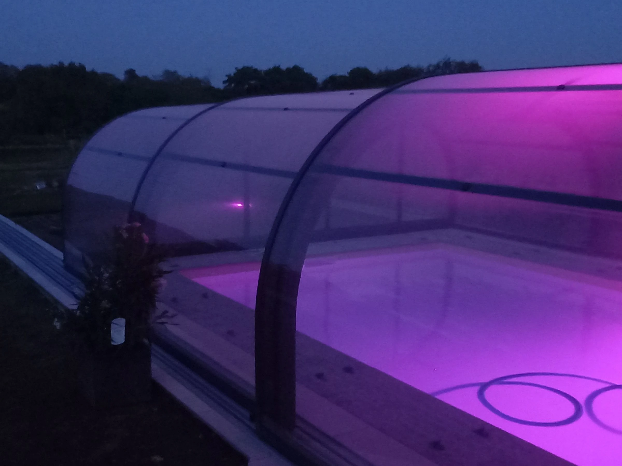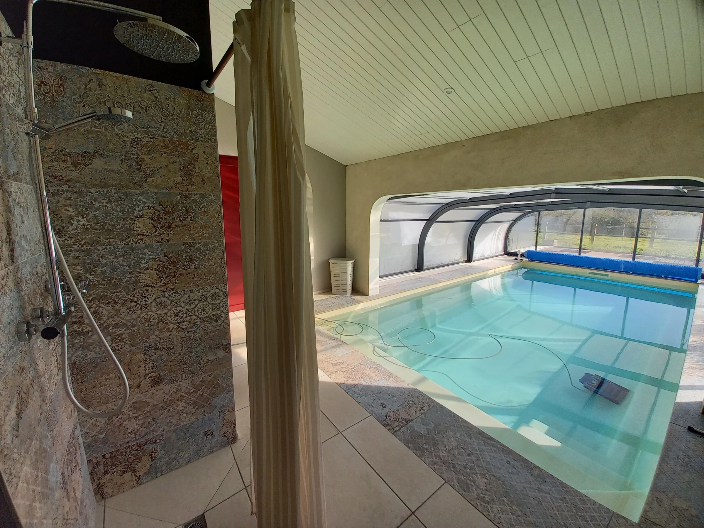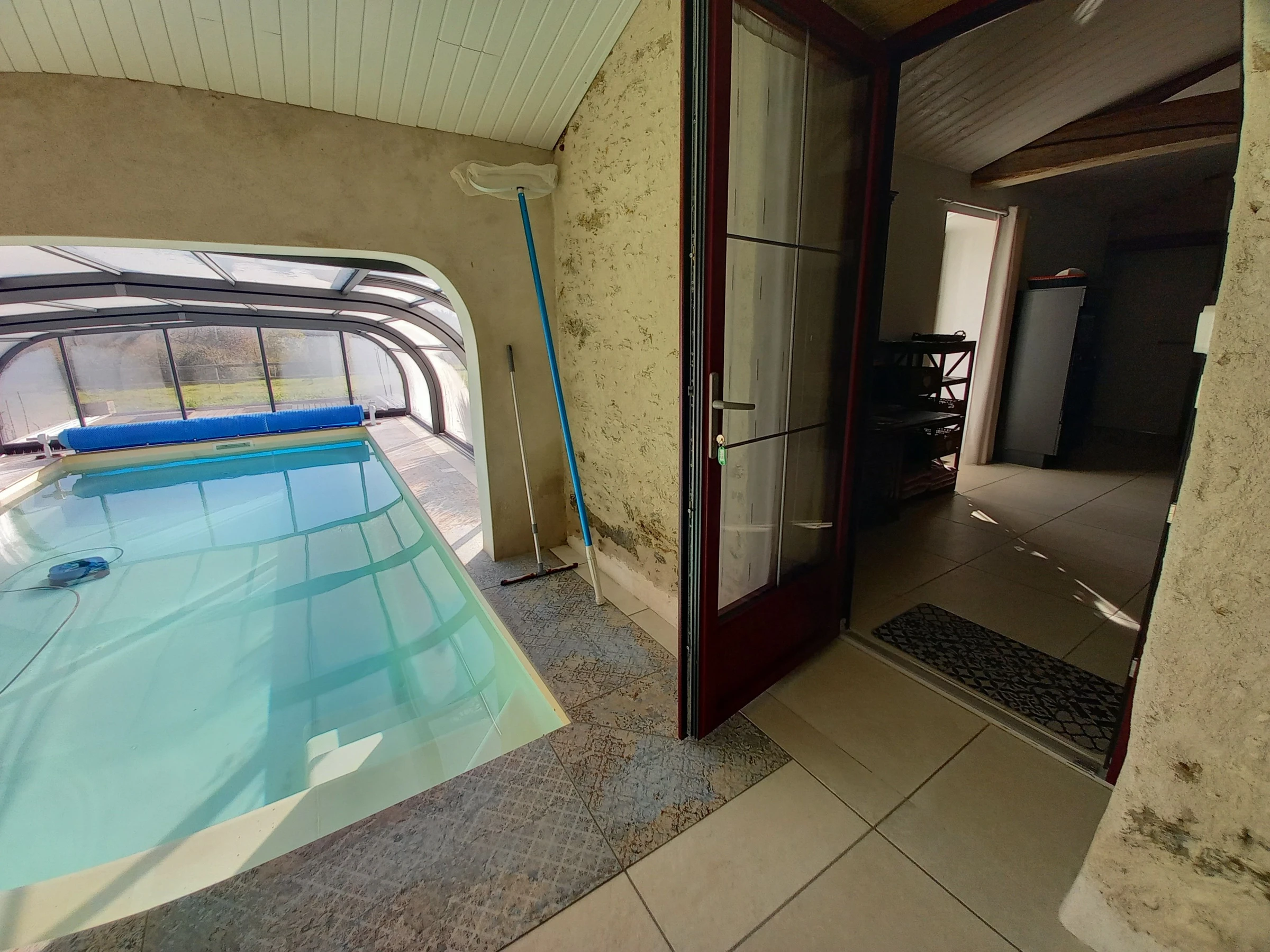 Una puerta acristalada en el salón da acceso a la piscina cubierta y climatizada (3,20 x 7,20 m), abierta todo el año. La zona de la piscina incluye ducha y da acceso a un cuarto aseo independiente. El agua de la piscina está tratada con sal.