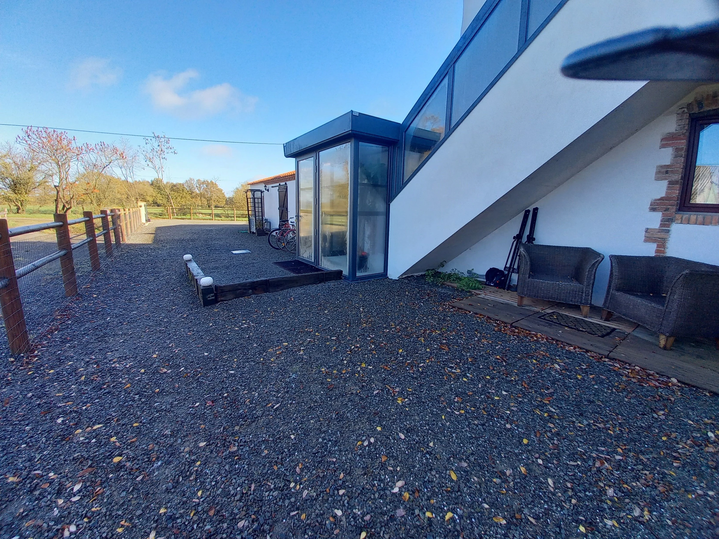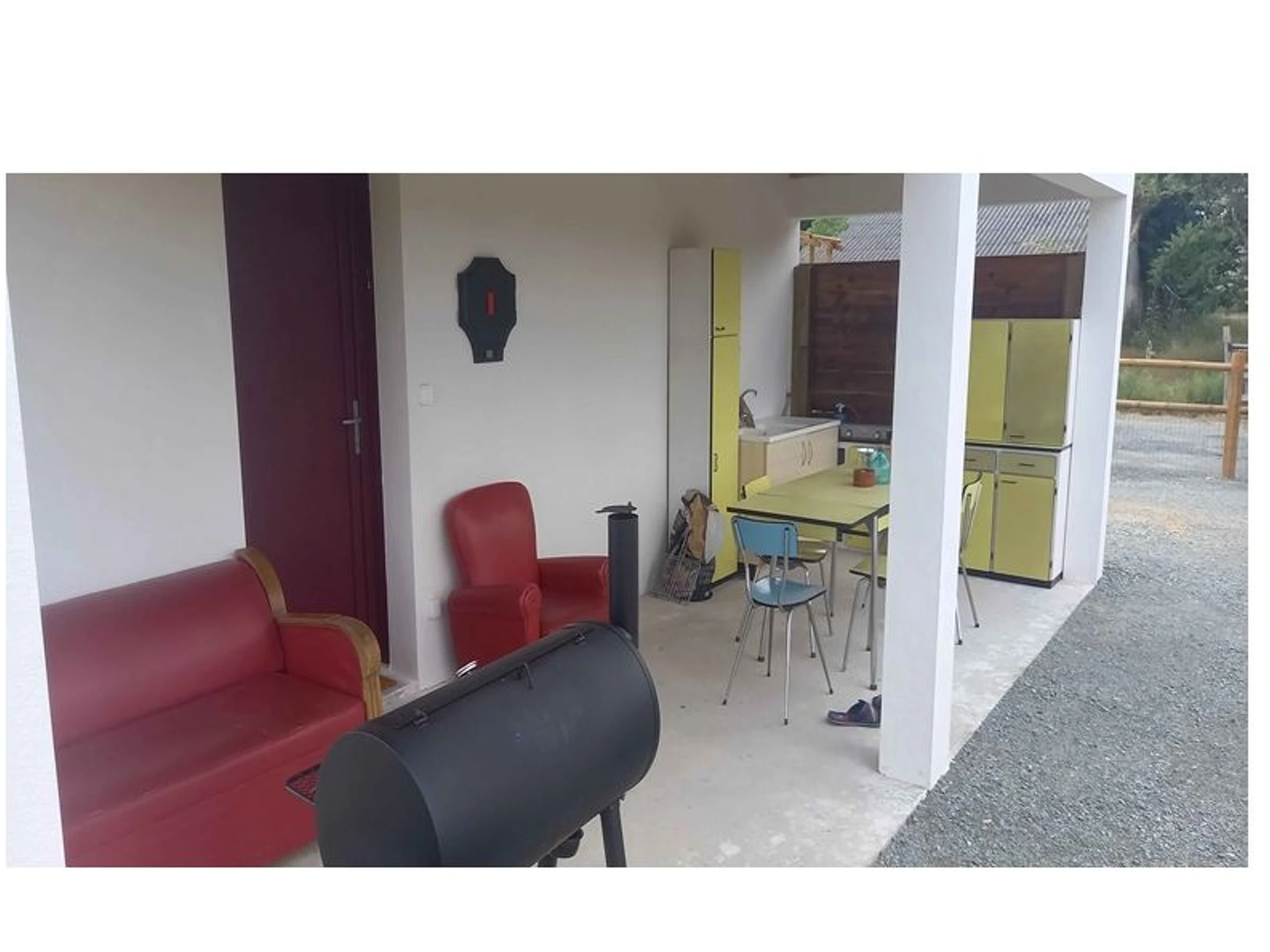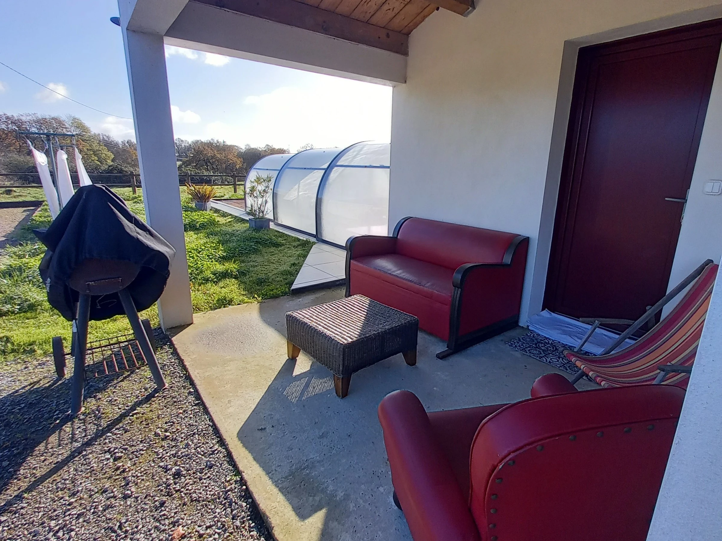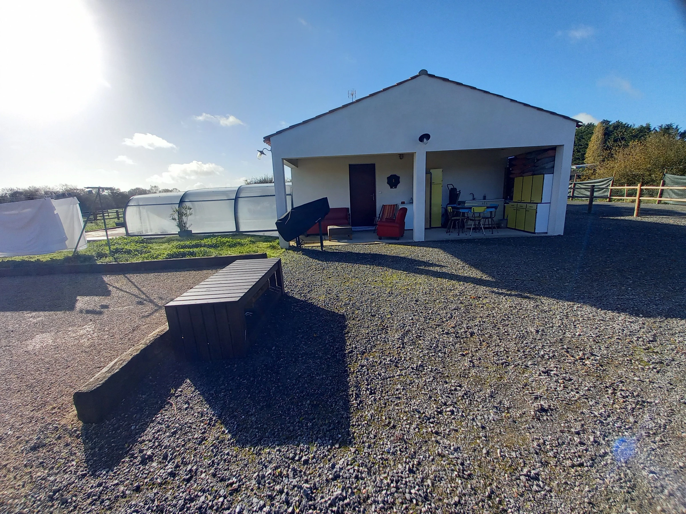 En el exterior, hay un jardín completamente cerrado, un patio de grava con aparcamiento para varios coches, una terraza cubierta (cocina de verano con barbacoa y juegos al aire libre), una terraza descubierta (mesas, sillas y tumbonas) y una pista de petanca.