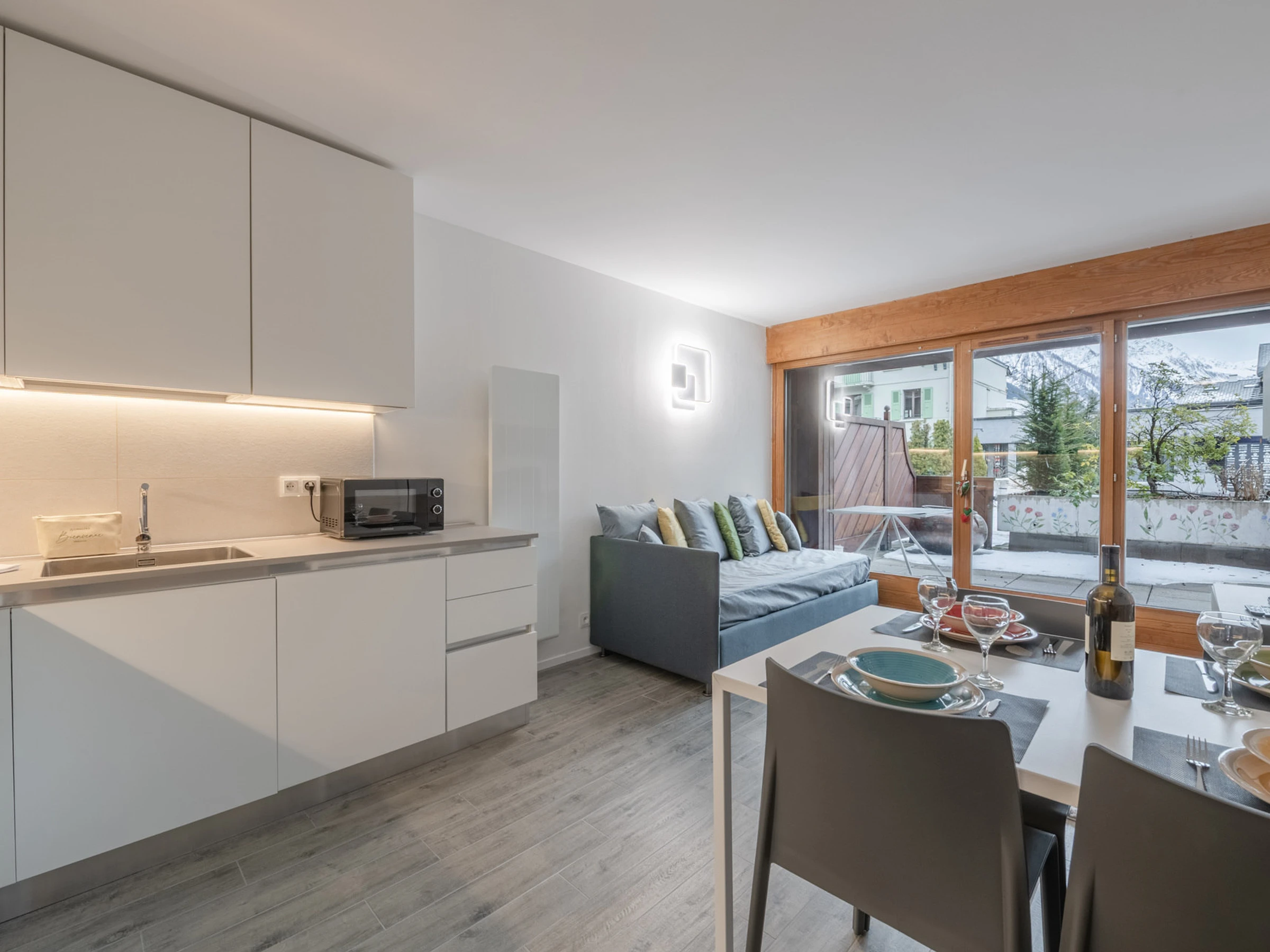 Podrá disfrutar del espacio exterior en la terraza orientada al sur y de sus vistas al Mont Blanc.