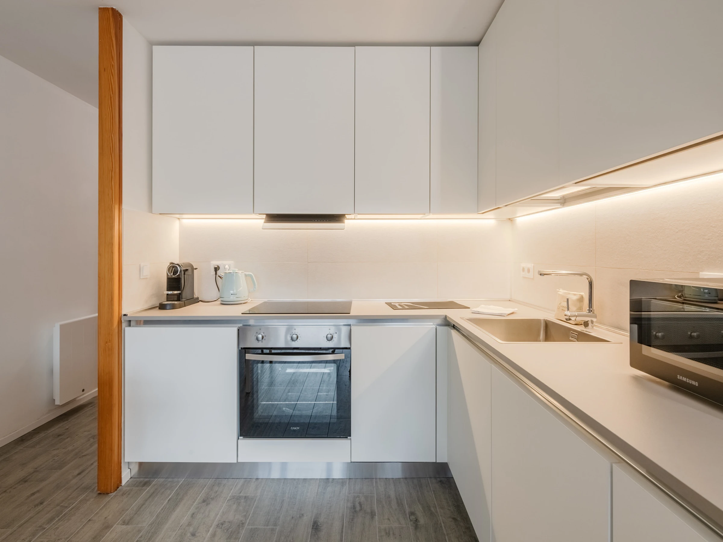 - Cocina americana totalmente equipada (placa de inducción, horno, frigorífico, lavavajillas, microondas, cafetera Nespresso, hervidor de agua, tostadora y lavadora).