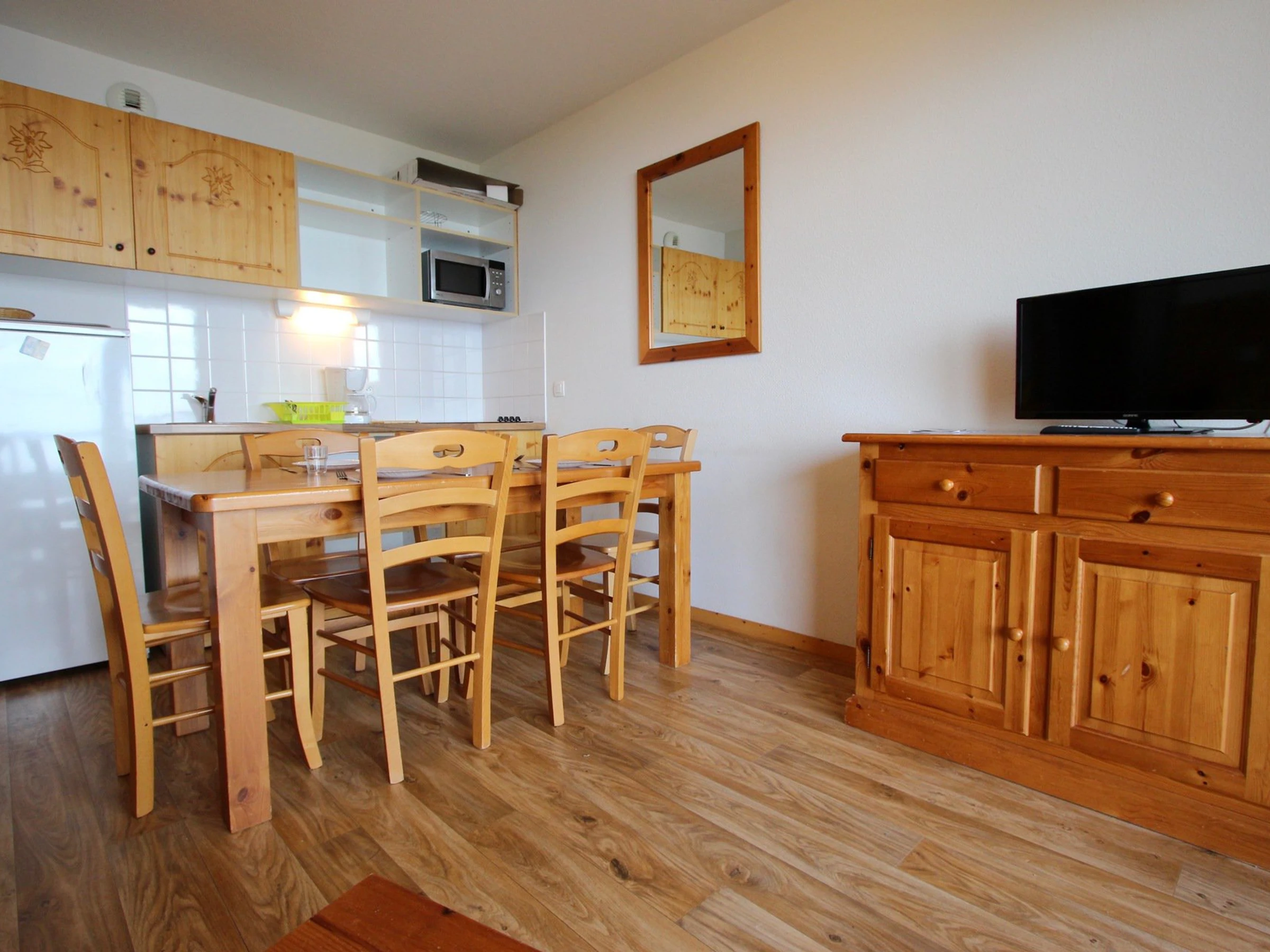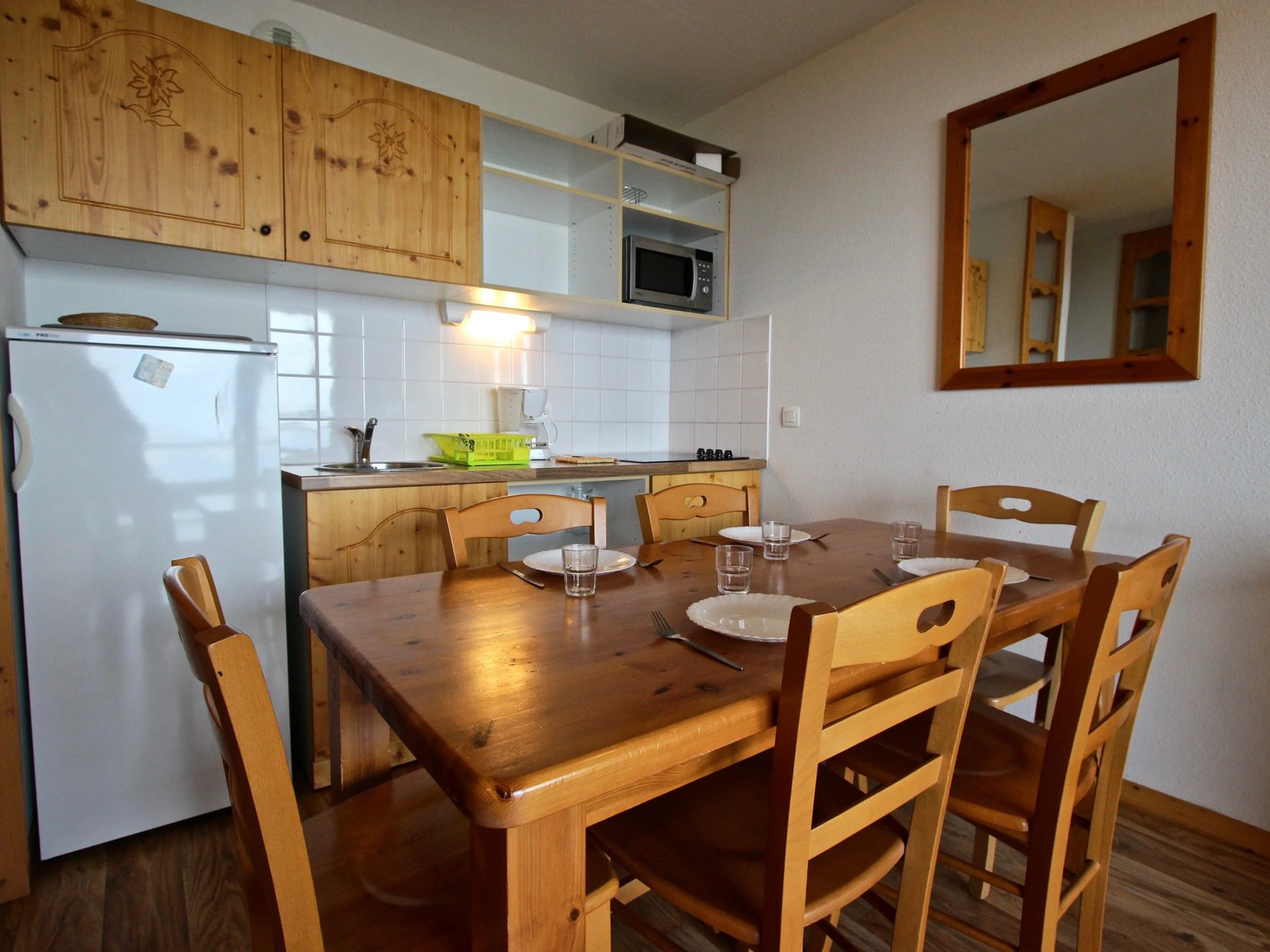 Equipée d'un réfrigérateur, de 4 placas vitrocéramiques y d'un micro ondes-grill.