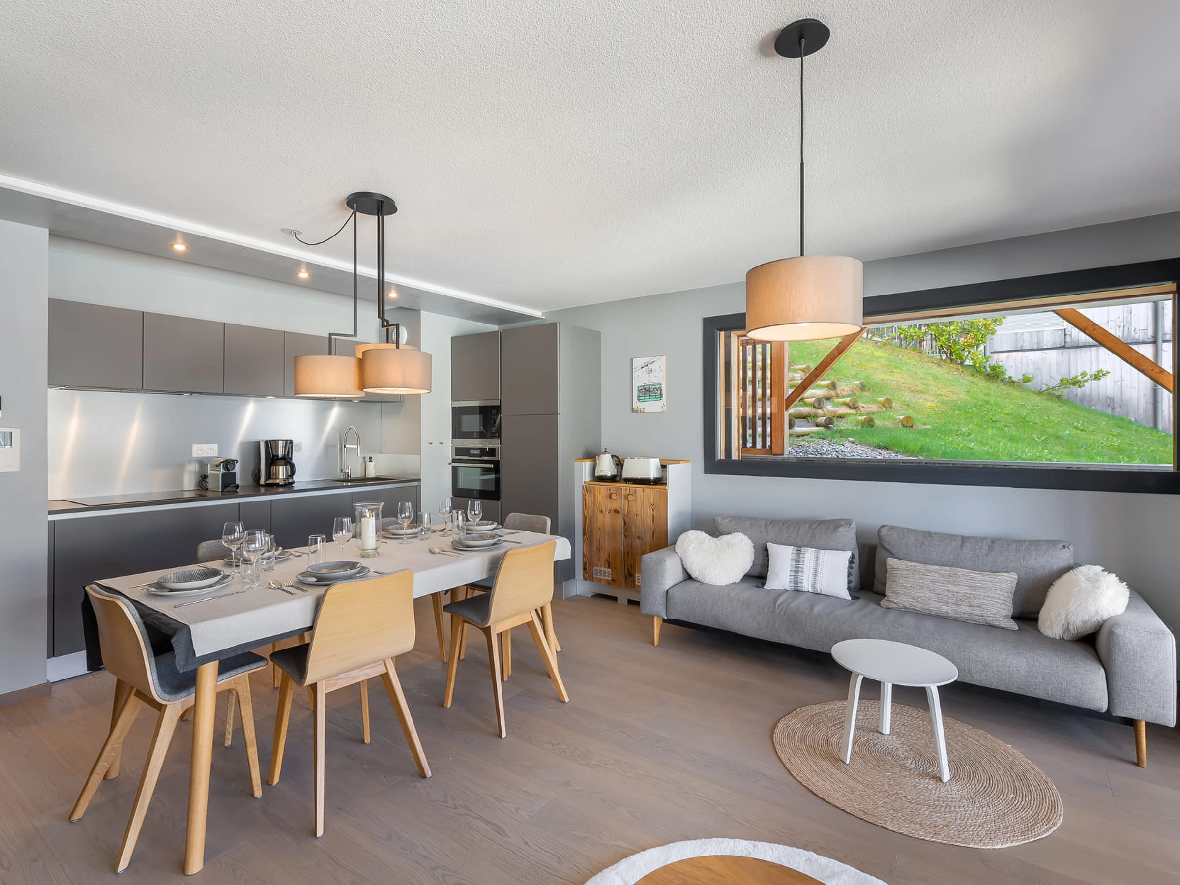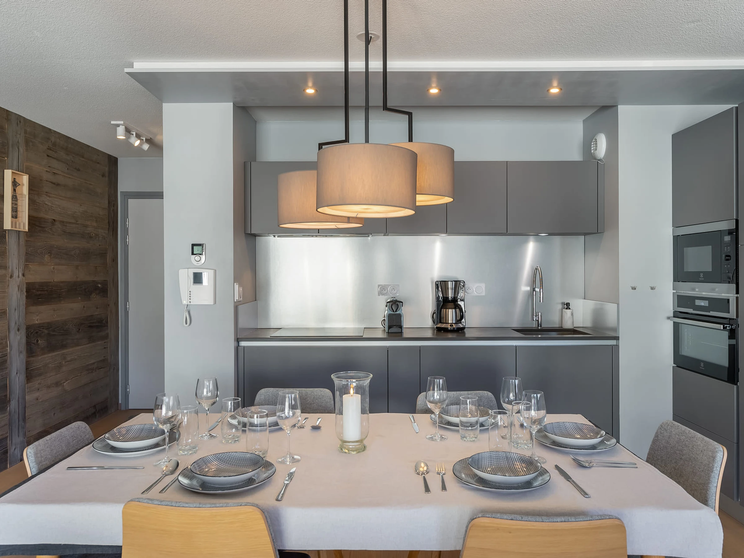 Cocina abierta al salón, Frigorífico con congelador, Horno, Placa de inducción, Microondas, Lavavajillas, Tostadora, Cafetera de filtro, Cafetera NESPRESSO