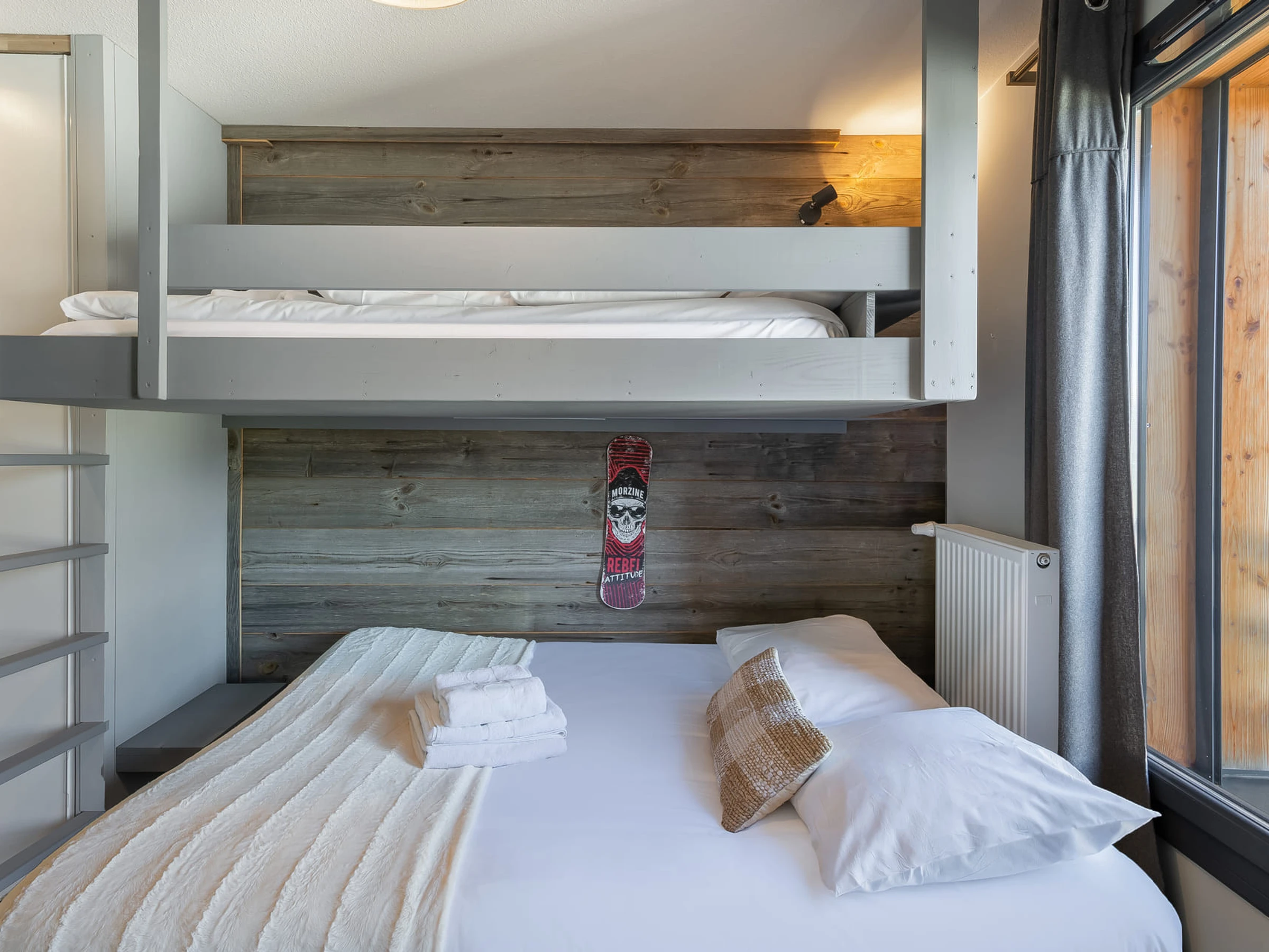 1 dormitorio(s) con 1 cama doble (160 x 200) y baño con ducha/WC, dormitorio con 1 litera individual + 1 sofá cama individual, 1 dormitorio(s) con 1 cama nido Cama (2 x 1 persona) separada por una mampara corredera