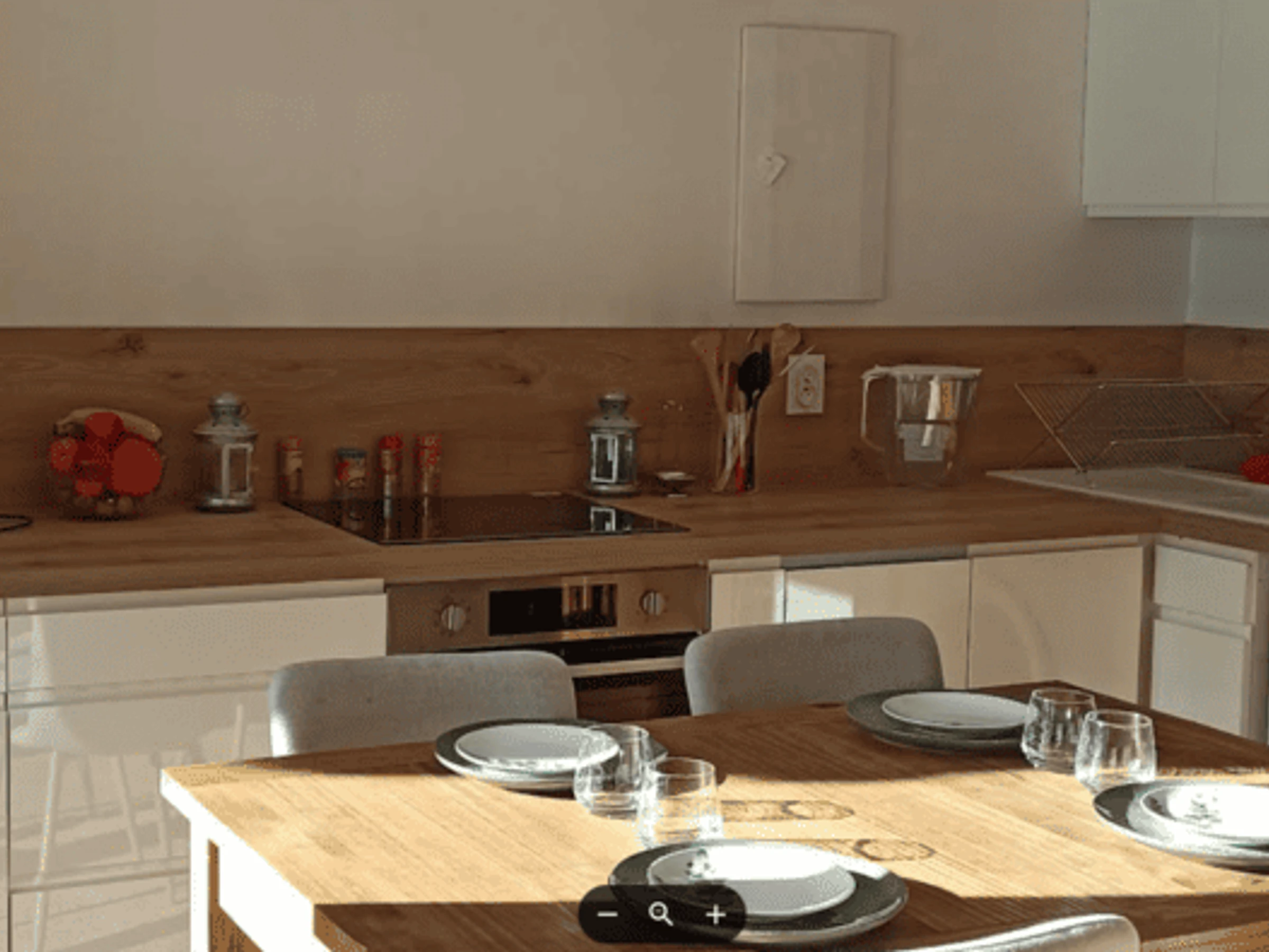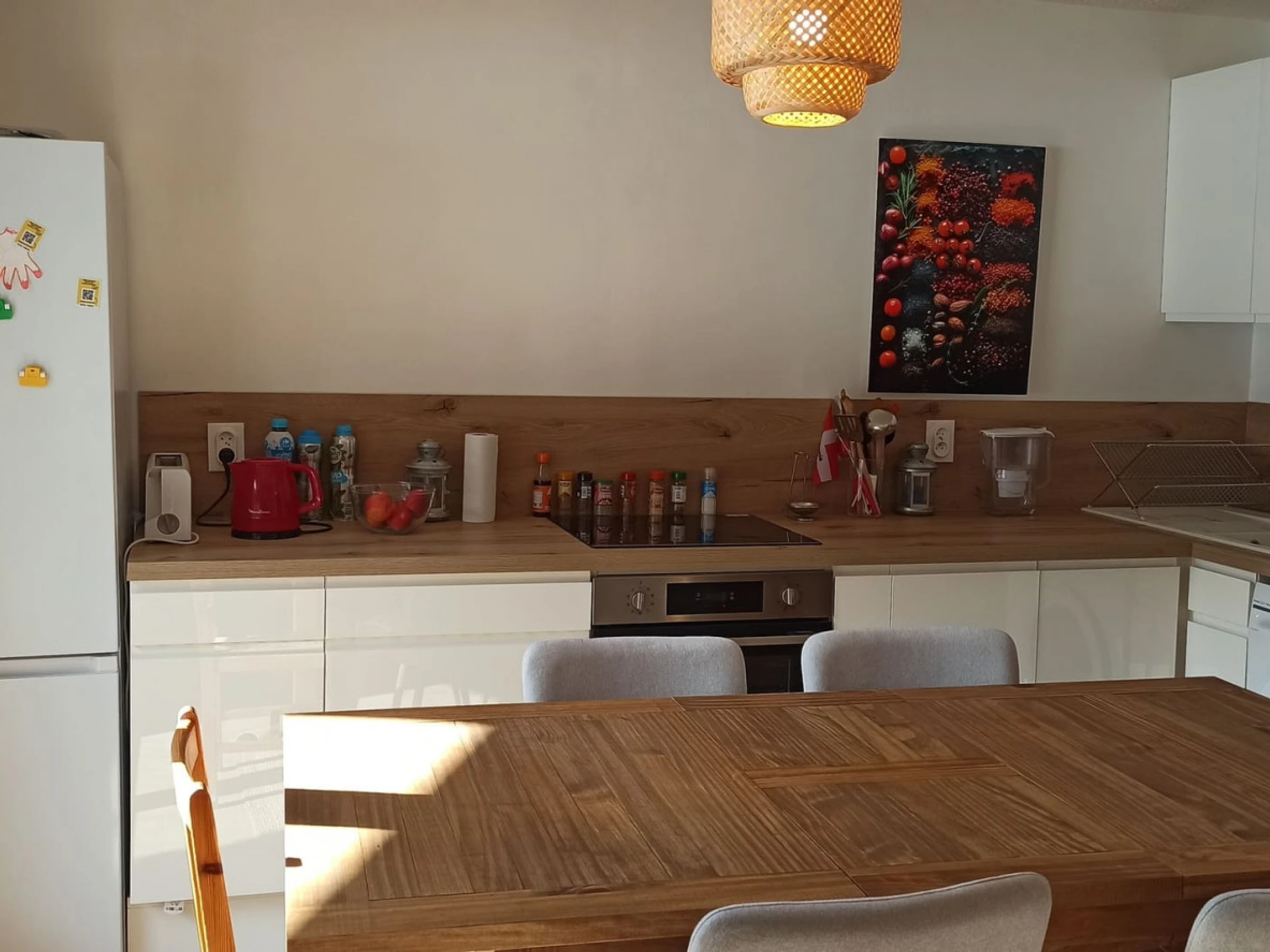Cocina abierta, 1 refrigerador con congelador, 1 horno, 1 microondas, 1 placa de inducción, 1 parrilla raclette, 1 hervidor eléctrico, 1 tostadora, 1 cafetera de filtro