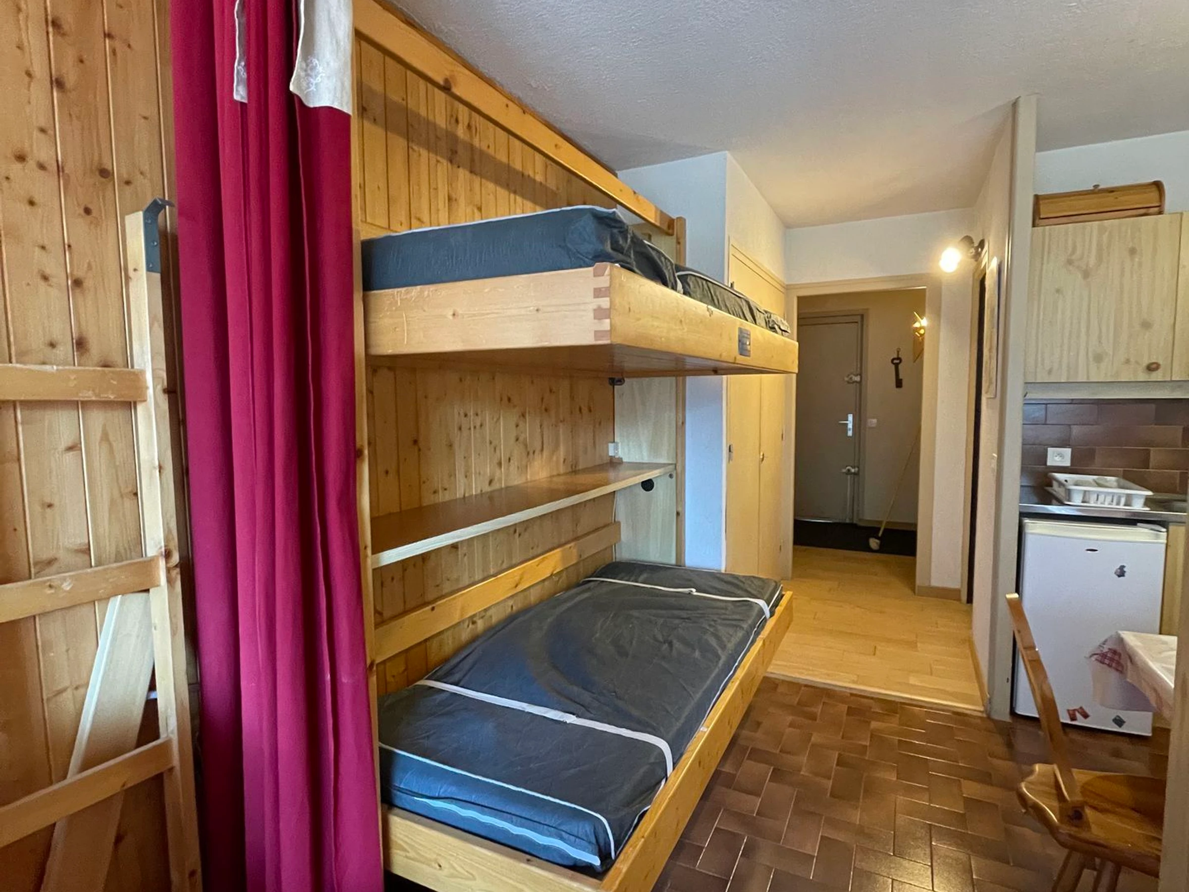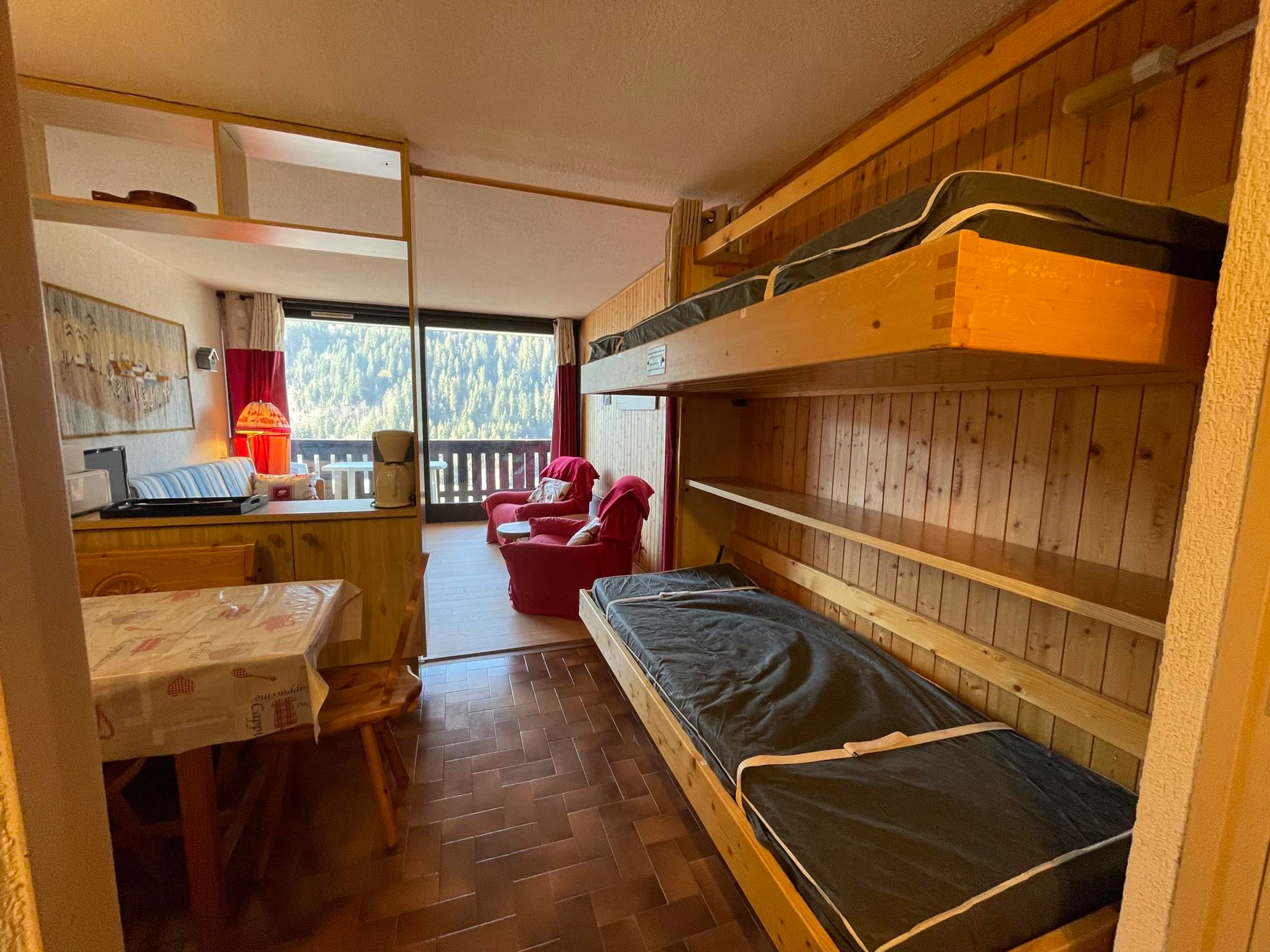 Apartamento en planta baja (en relación con la entrada de la residencia), en el segundo piso. Incluye entrada, baño con bañera, aseo independiente, amplio salón con cocina americana y zona de dormitorio, literas plegables (90x190), salón con sofá cama extraíble (2x 90x190) y balcón orientado al sur/oeste.