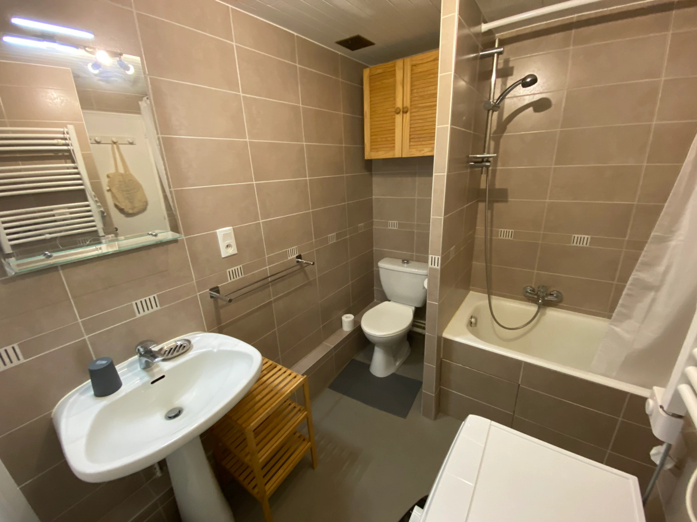 Apartamento en la 1.ª planta con entrada, baño con bañera, lavabo, lavadora e inodoro, cabina con literas (90x190) y amplio espacio de almacenamiento, salón con sofá cama (140x190) y cocina totalmente equipada.