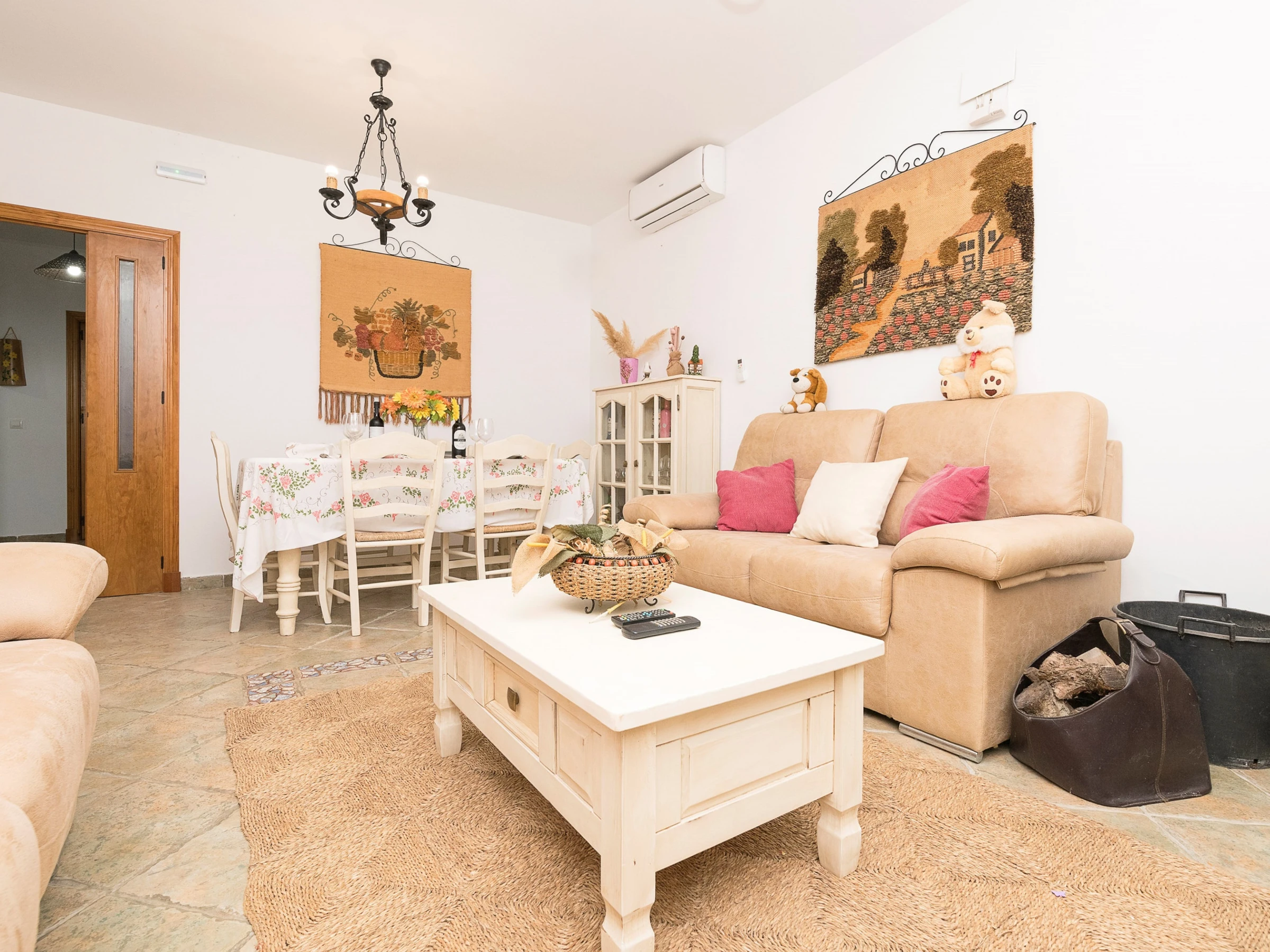 El interior de esta casa de una sola planta está diseñado para ofrecer comodidad y entretenimiento. El salón cuenta con una acogedora chimenea, aire acondicionado y Smart TV, creando un espacio perfecto para relajarse. La zona del comedor, abierta al salón, permite disfrutar de comidas agradables en buena compañía. La cocina, equipada con vitrocerámica, tiene todo lo necesario para preparar deliciosas comidas caseras. Cuatro dormitorios, todos equipados con camas dobles, ventiladores y armarios, ofrecen un sueño reparador. Además, hay una cuna disponible bajo petición. La vivienda cuenta con un baño completo con ducha. Cuatro ventiladores y un aire acondicionado en el salón garantizan un ambiente fresco en los días cálidos.