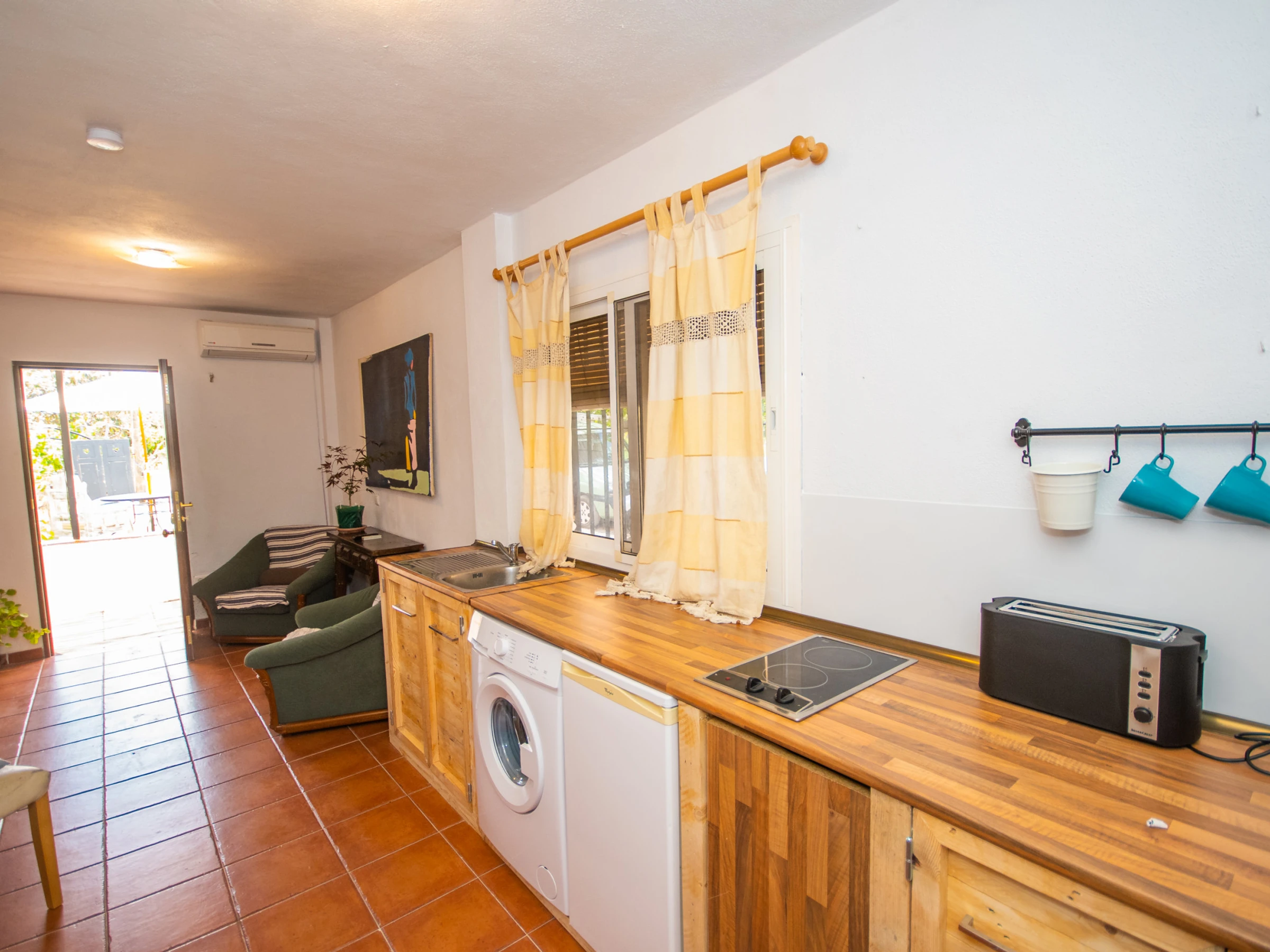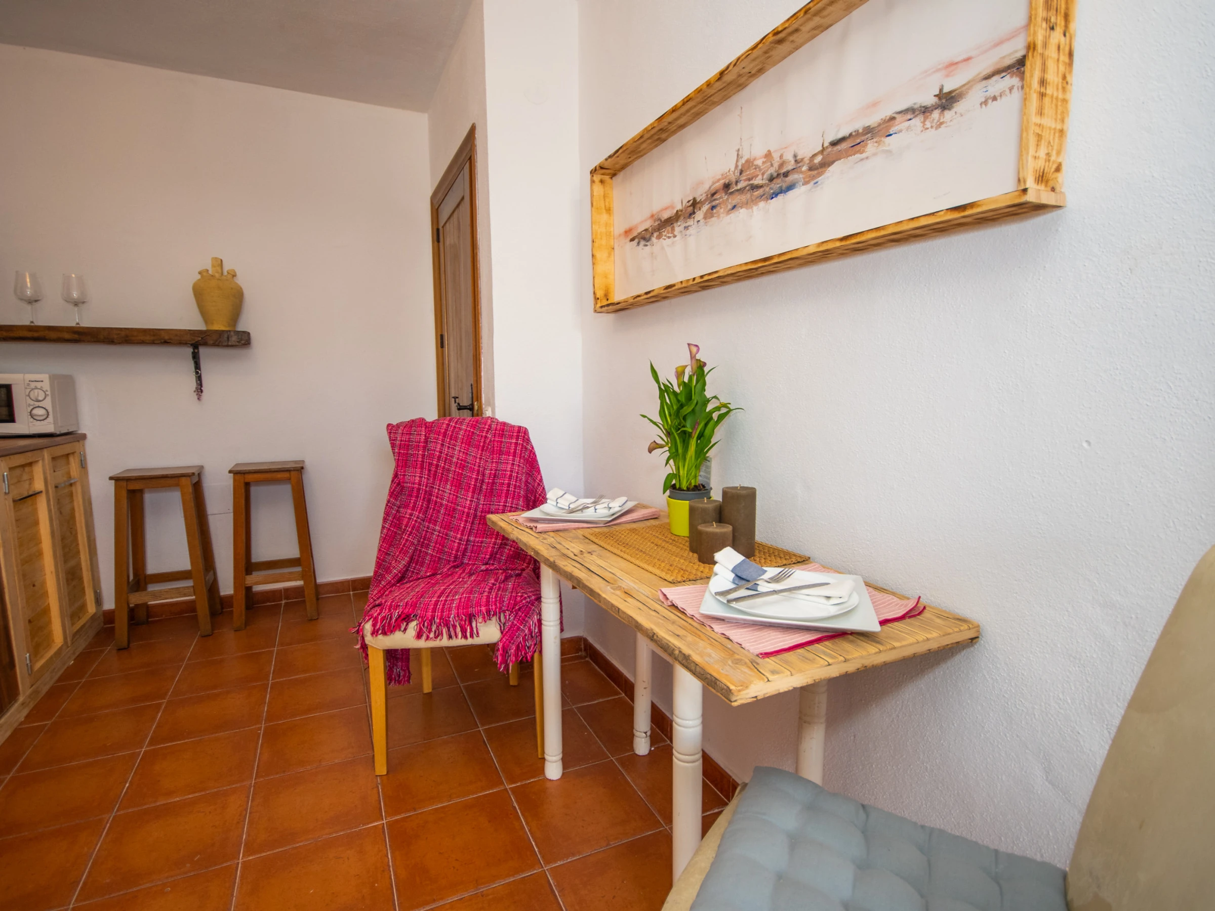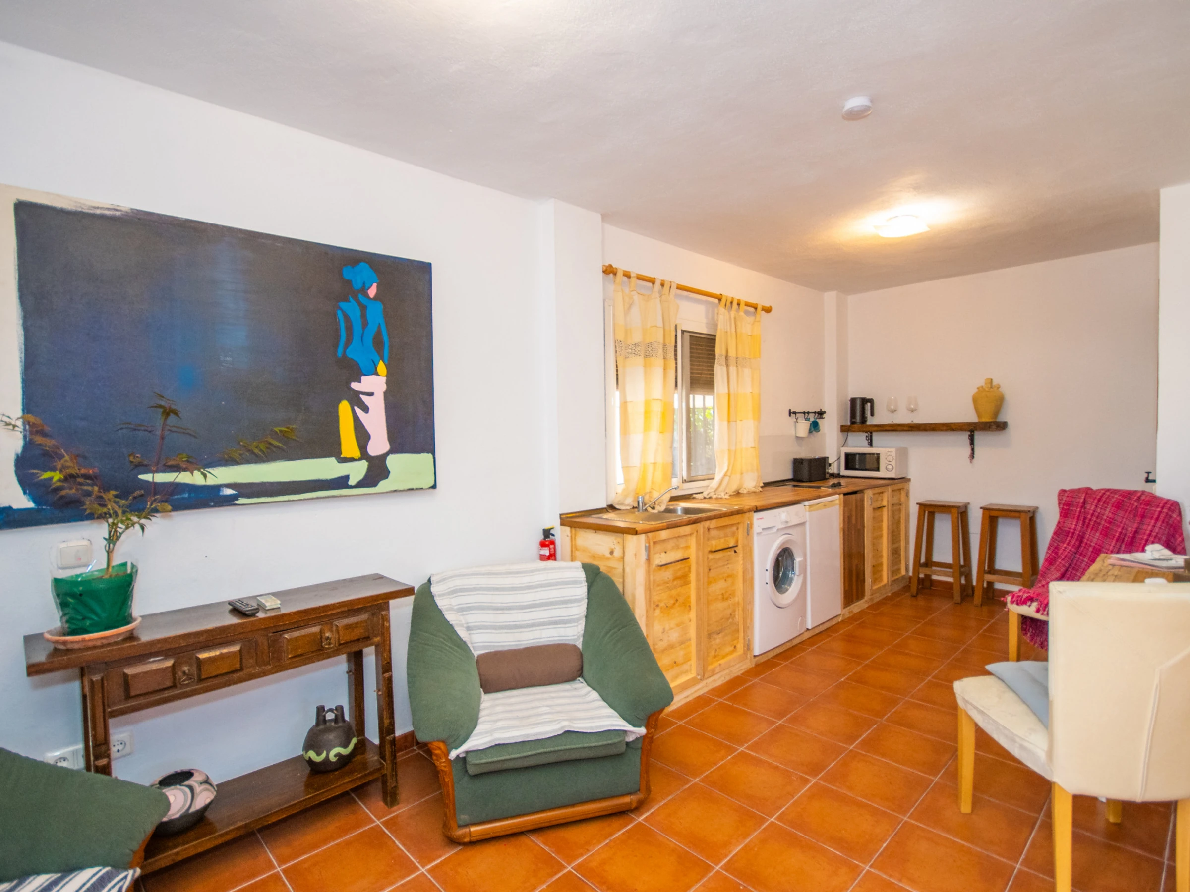 El estudio dispone de una cocina americana equipada con vitrocerámica, nevera, microondas, tostadora, hervidor y lavadora, perfecta para preparar desayunos, almuerzos o cenas a tu ritmo. Además, cuenta con un equipo de ósmosis en el grifo para asegurar agua de calidad. El espacio de estar incluye televisión para que disfrutes de tu serie favorita en total confort.