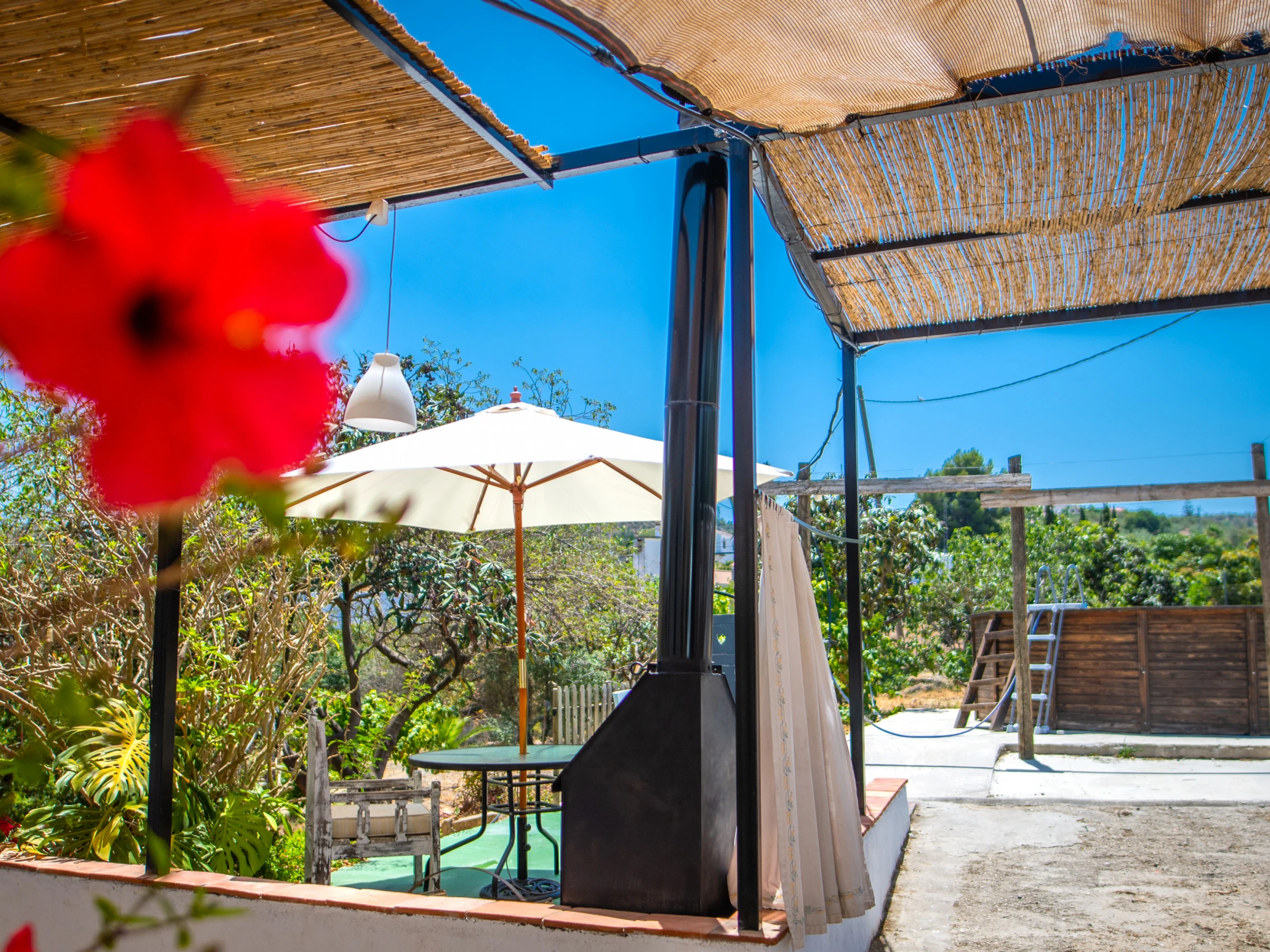 El baño privado está equipado con plato de ducha y bañera, garantizando comodidad. La piscina privada revestida en madera (4,6 m de diámetro y 1,2 m de profundidad) está disponible de junio a septiembre, acompañada de un amplio espacio para relajarse con una chimenea de leña al aire libre. También encontrarás un porche a media sombra con cañizos naturales, zona de barbacoa y terraza para disfrutar momentos inolvidables al aire libre.