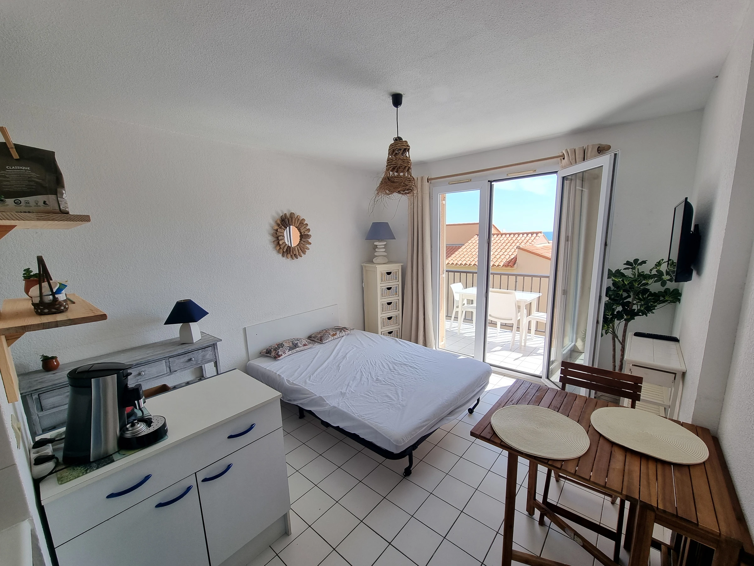 Con capacidad para cuatro personas, consta de un dormitorio, un baño y una cocina totalmente equipada que da a un luminoso salón organizado alrededor de un comedor y un sofá cama que da a una terraza con vistas al mar donde podrá relajarse al estilo catalán.