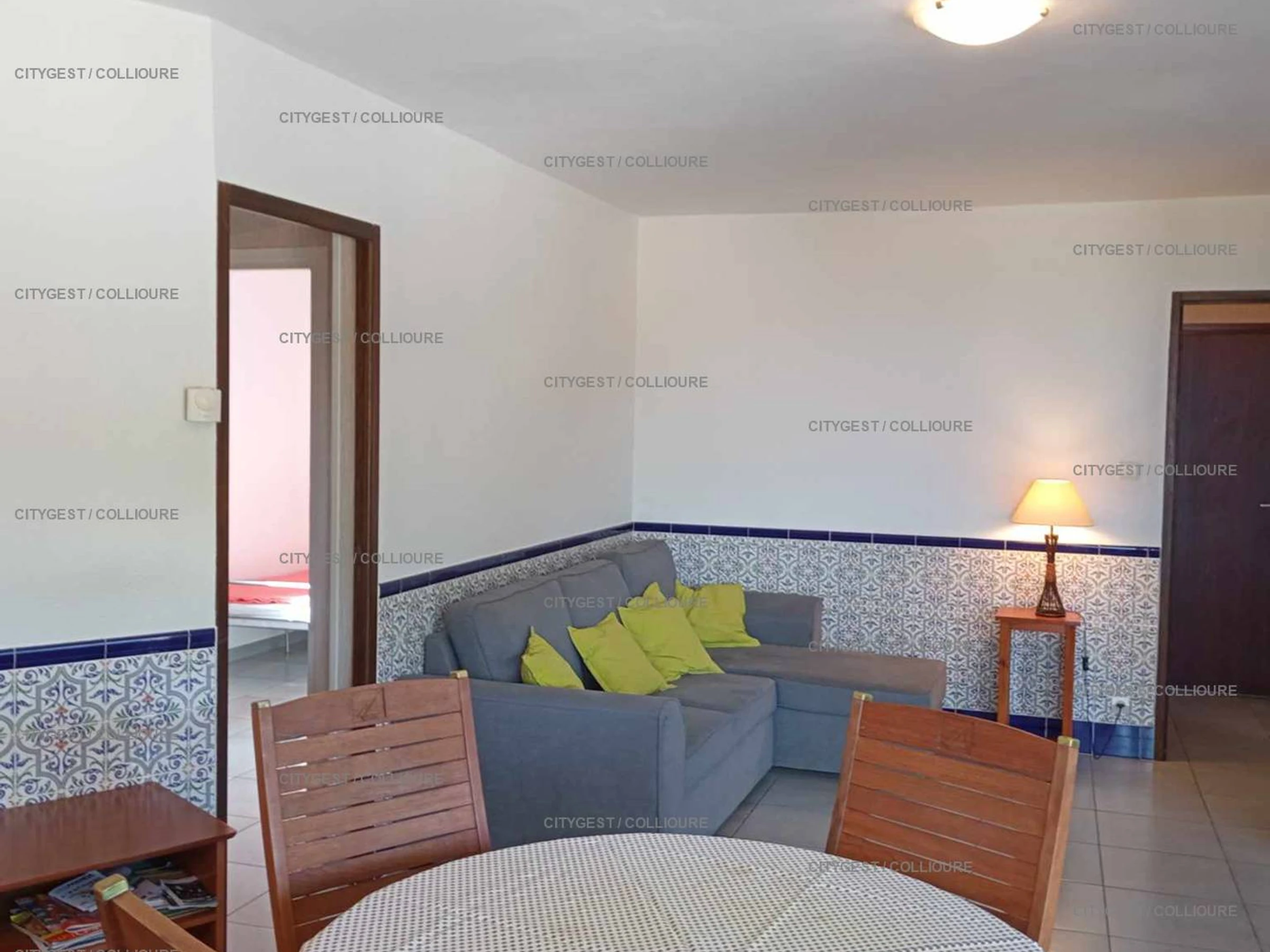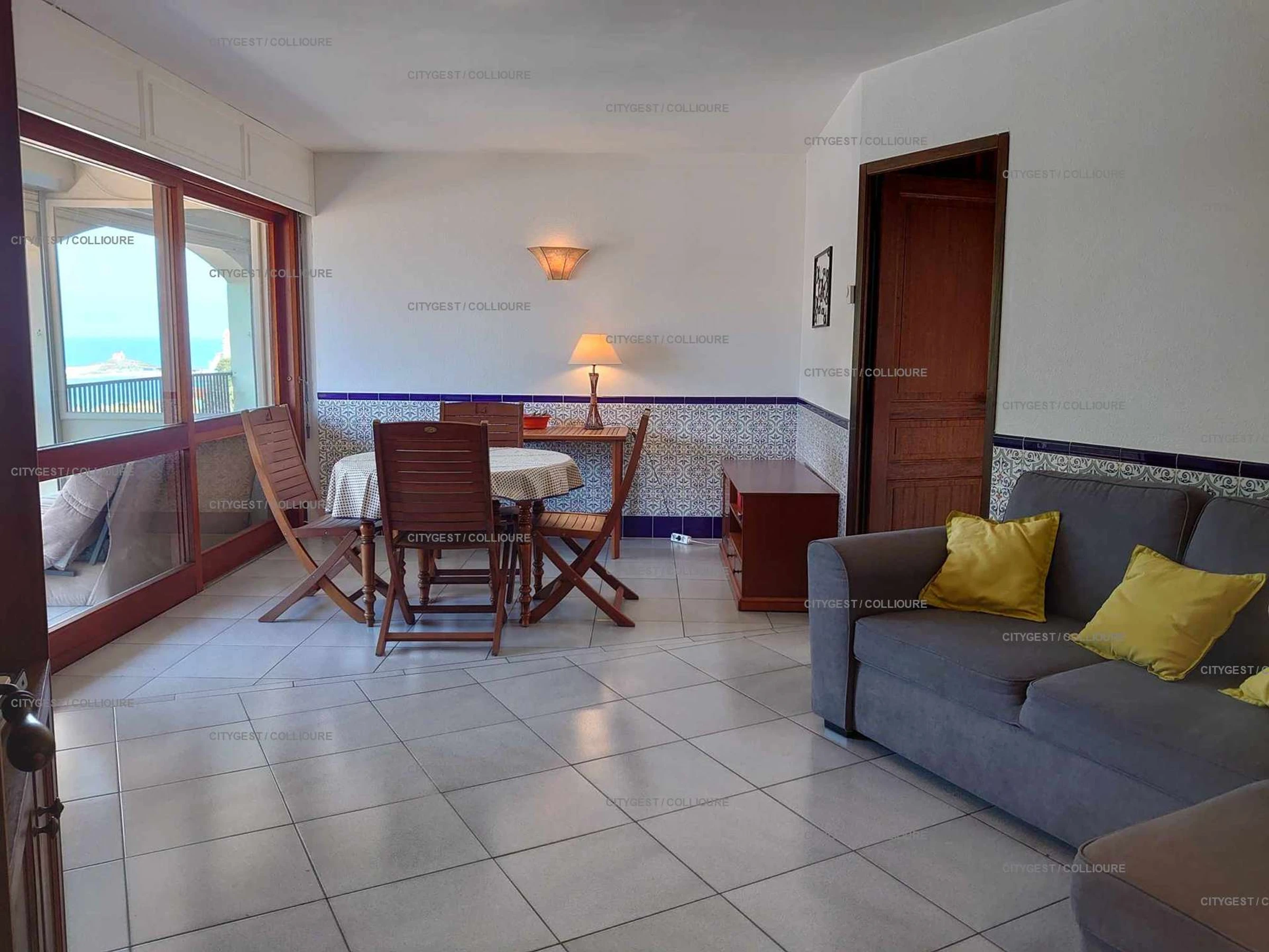 Tipo F2 equipado para 4 personas, con vista al mar y a la bahía de Collioure, al molino y al Fuerte St. Elme. Consta de entrada, cocina independiente (placa de gas, horno, lavadora), un dormitorio (2 camas de 90 cm), cuarto de ducha/WC, salón (sofá esquinero convertible de 140 cm), una terraza. Residencia con barrera eléctrica y posibilidad de aparcamiento en los accesos de la residencia.