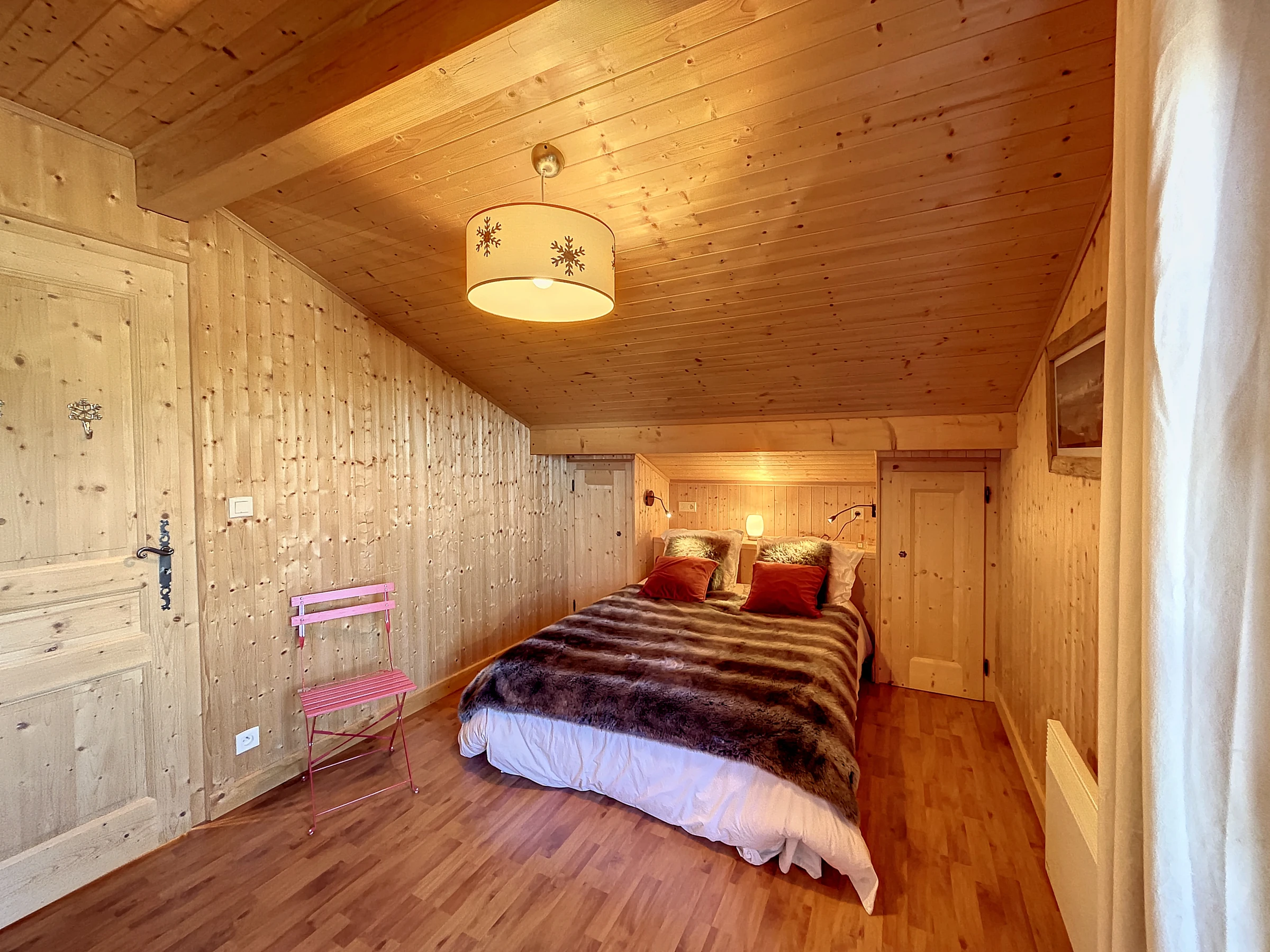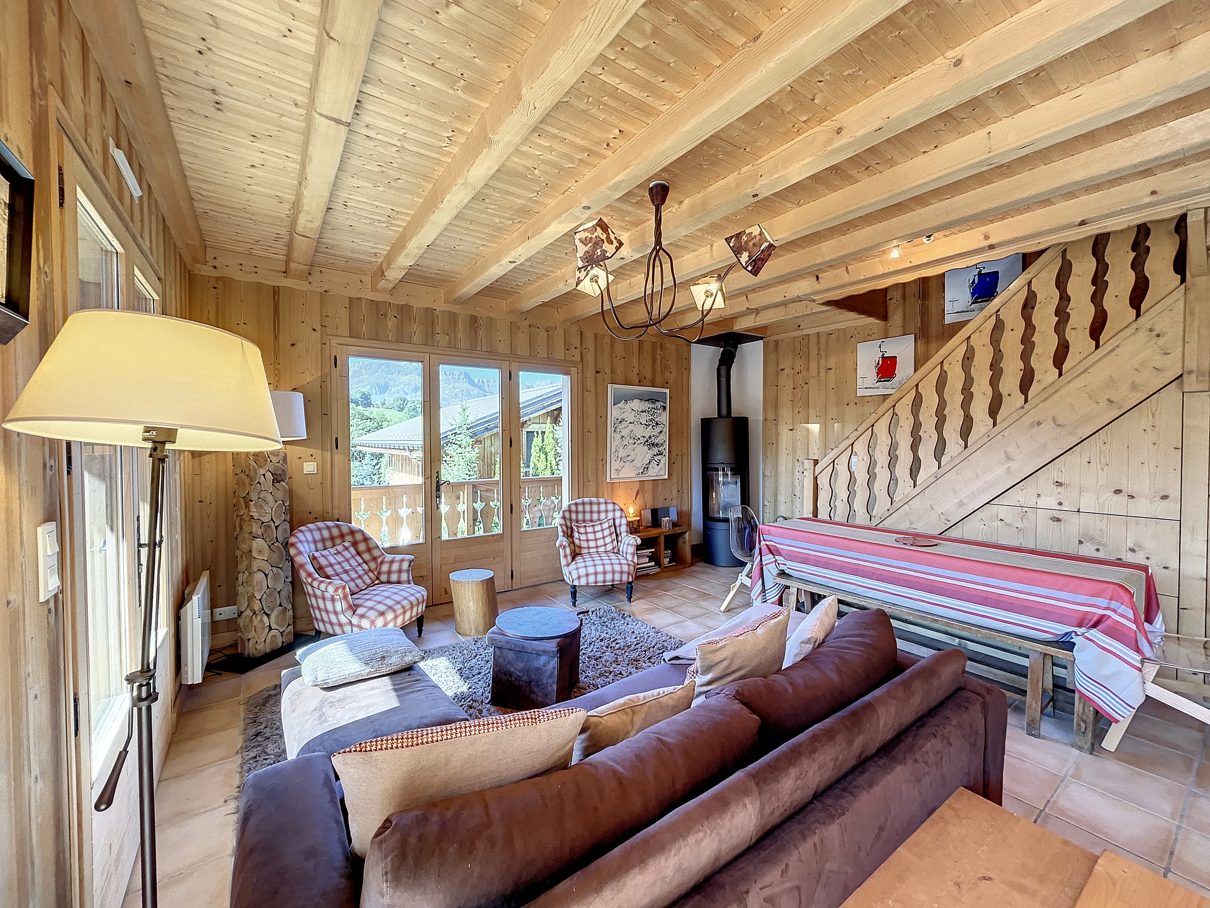 Situado a 2 km del centro de Combloux y a 500 m del teleférico Princess: Chalet semidúplex de 75 m2 con wifi compuesto por: Salón con zona de cocina equipada (horno, lavavajillas, frigorífico, placa de inducción, microondas, etc.) dormitorio -salón TV con convertible (140) con ducha contigua WC separado Arriba: un dormitorio con una cama de 140 y una cama de 80 Otro dormitorio con un baño de 140 camas con WC Guardaesquís y lavadora en la planta baja. (Este apartamento está equipado con edredones).