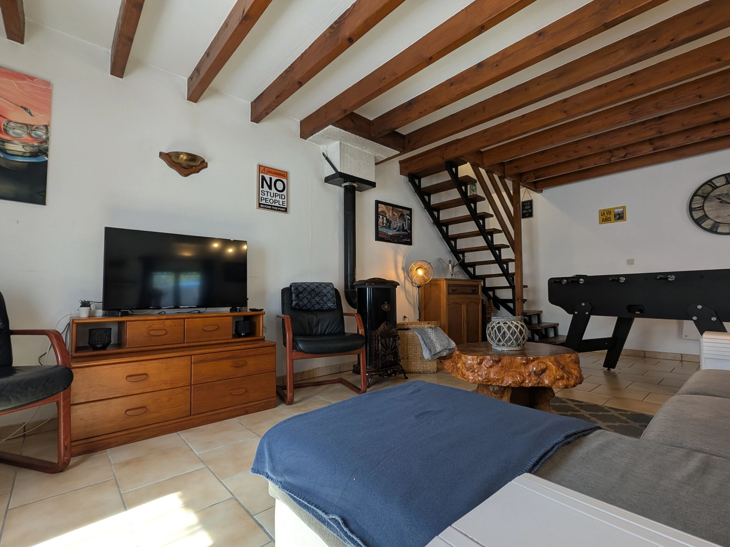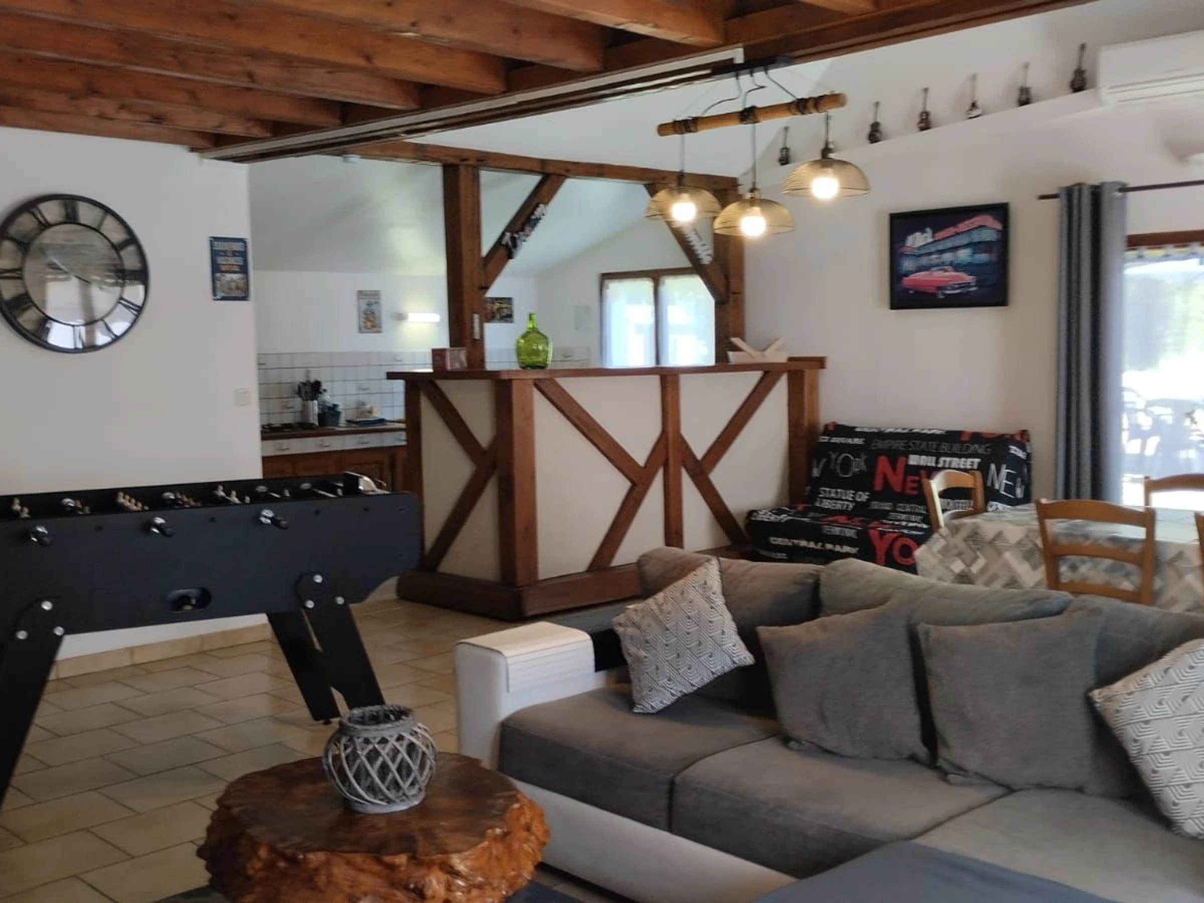 Cómoda sala de estar: televisión, sofá, mesa de comedor, futbolín, sofá cama, estufa de leña y aire acondicionado para mayor comodidad durante todo el año.