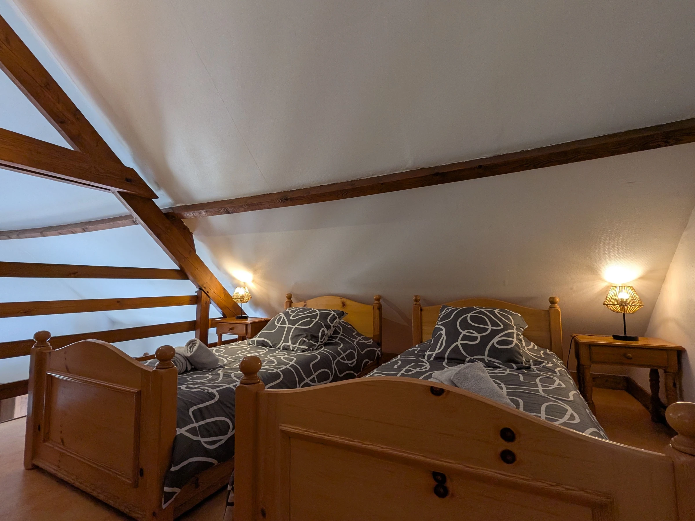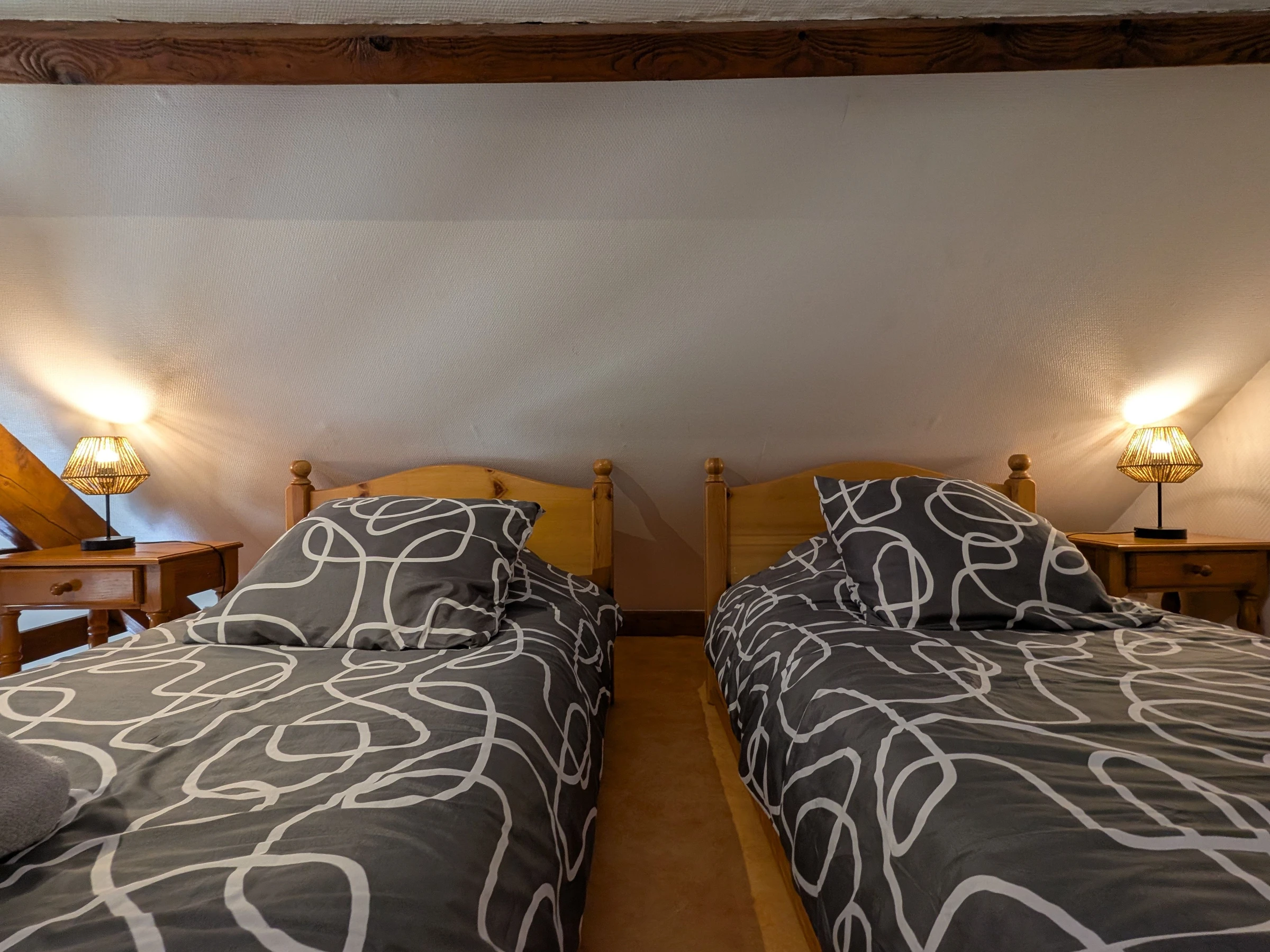Altillo: una cama doble (140 cm) y dos camas individuales (90 cm). Tenga cuidado con la luz de cruce en la zona de dormir.