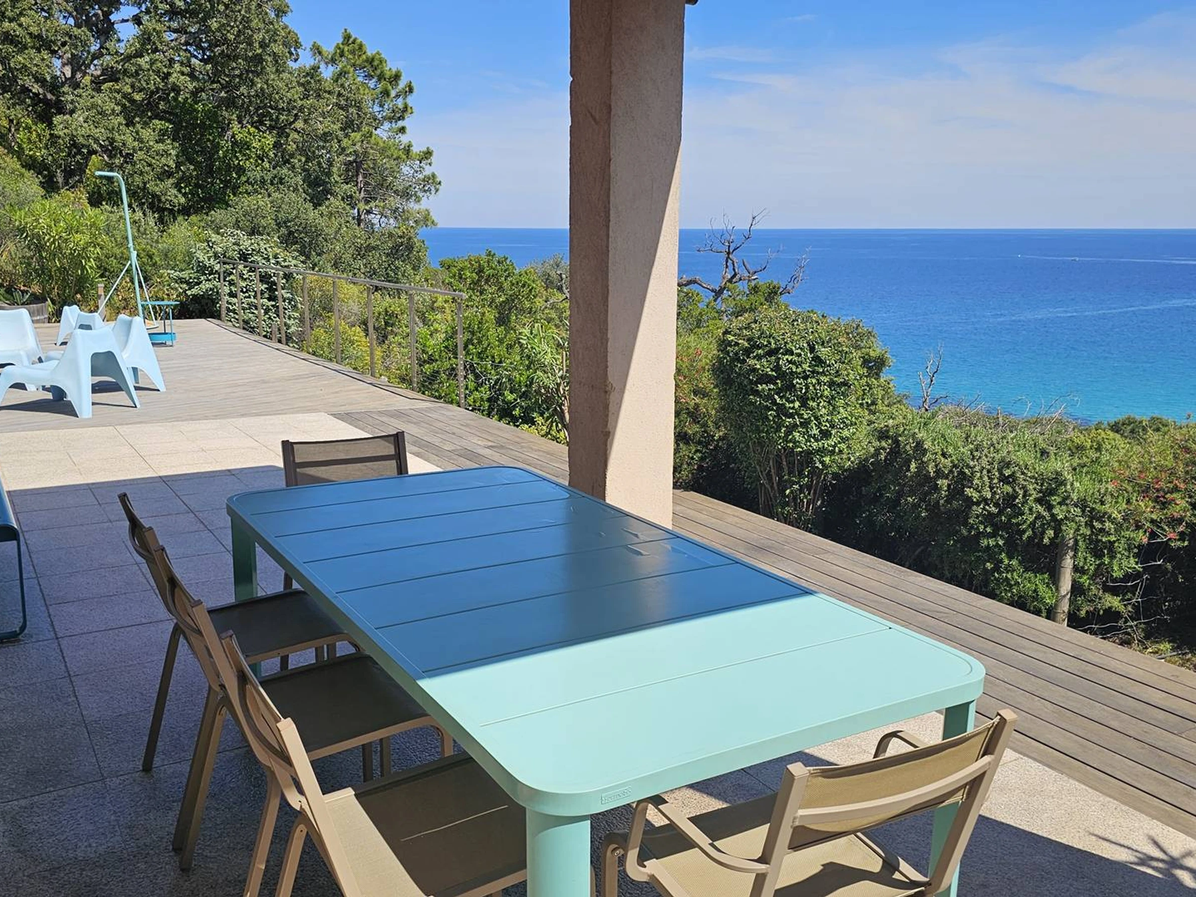 Terraza (35 m2) semicubierta - vista panorámico sobre el mar: salón(feria) de jardín en teca, tumbonas, jardinillo con ducha exterior, cocina de verano con plancha de gas