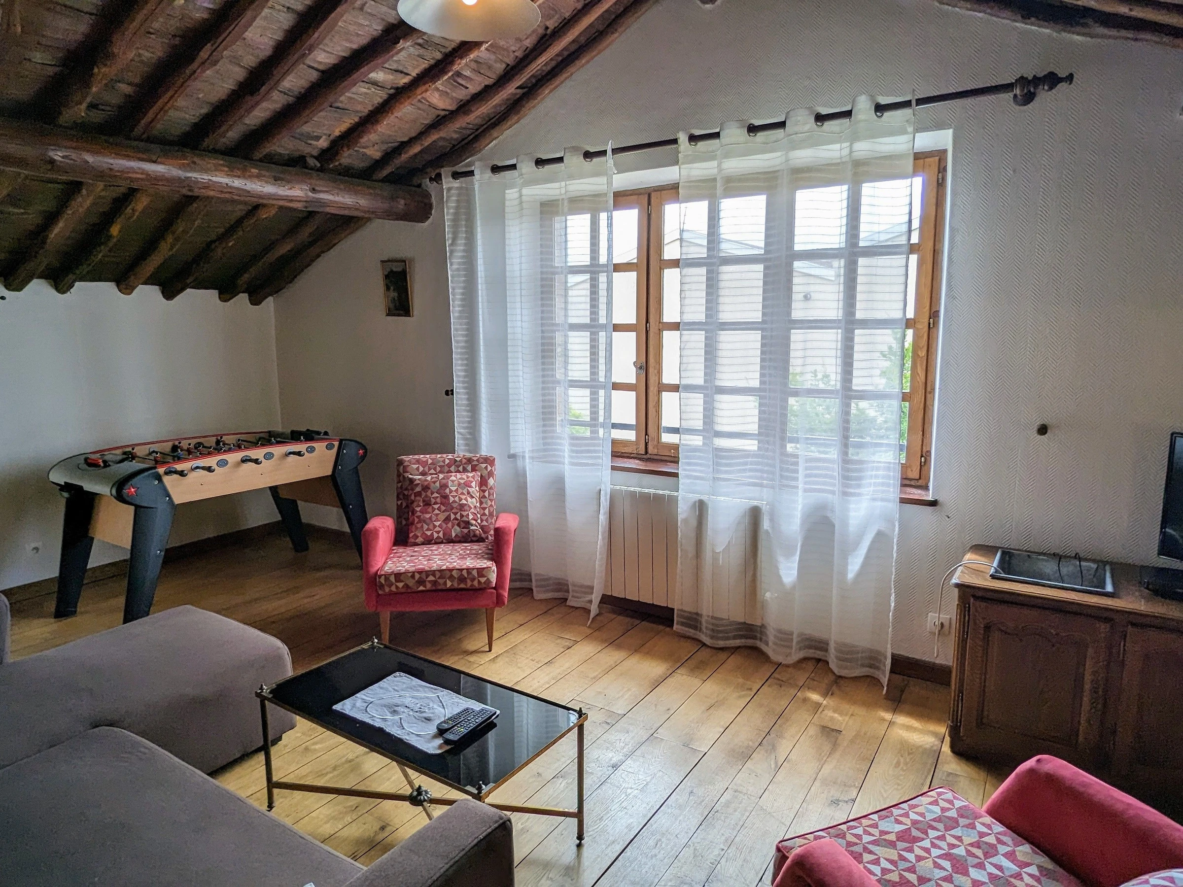 1er piso: Gran entrepiso con salón y futbolín, 1 dormitorio con cama de 140x190 y 1 dormitorio con 2 camas de 90x190, cuarto de ducha con WC.