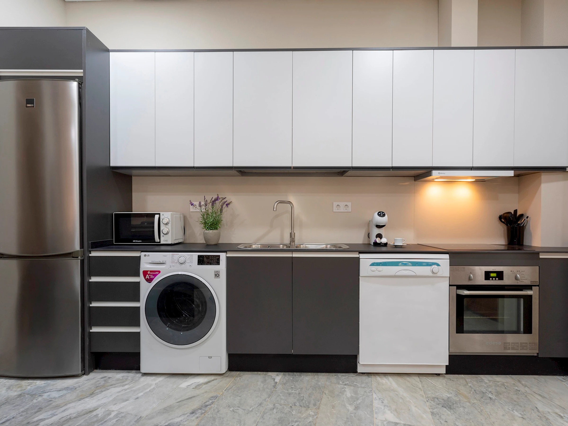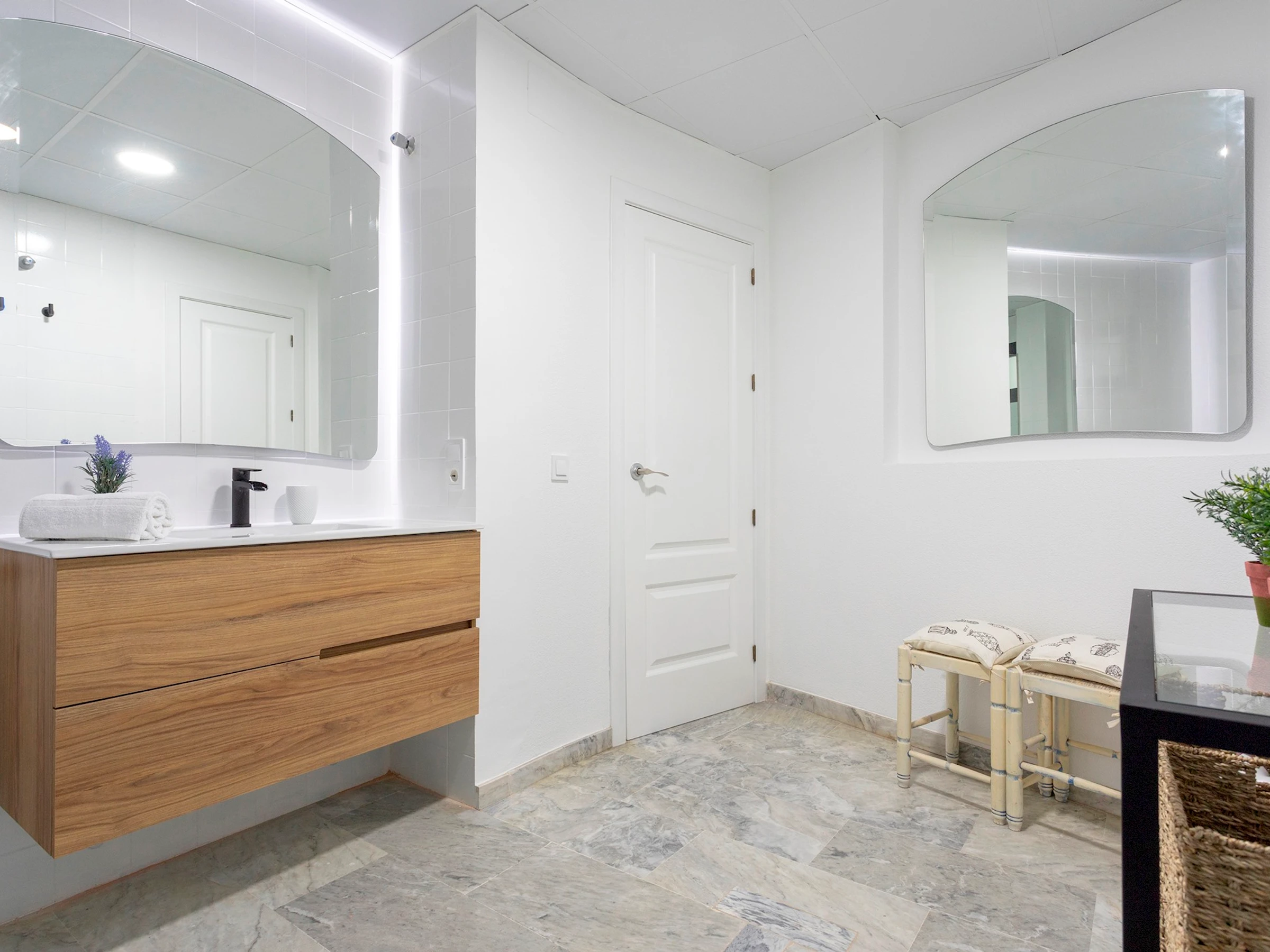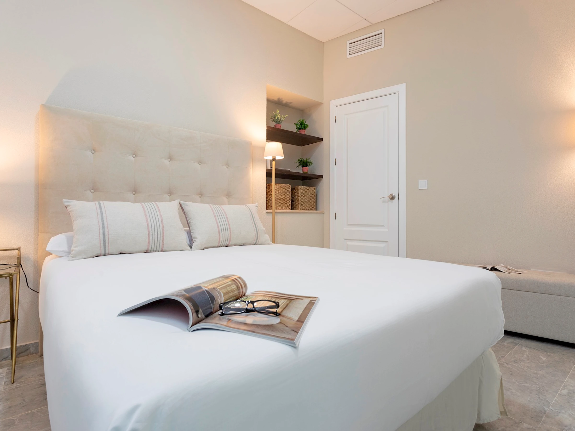 Al acceder a la vivienda, un recibidor con gran ventanal y vistas al patio da paso a un pasillo que conduce al corazón del apartamento: un salón espacioso con sofá, dos butacas, mesas auxiliares y una mesa de comedor para seis comensales. La cocina, moderna y funcional, cuenta con todos los electrodomésticos y menaje necesarios.