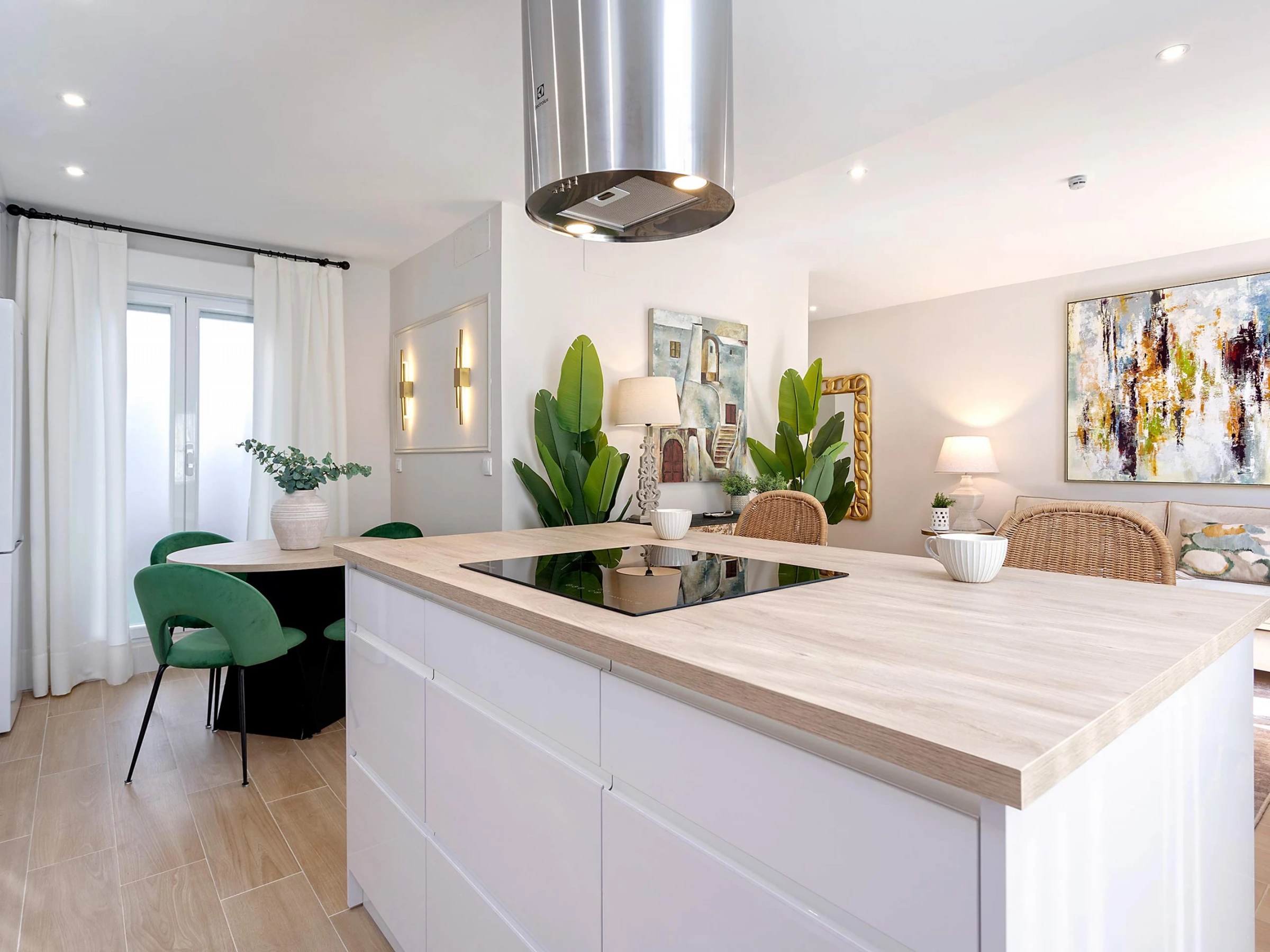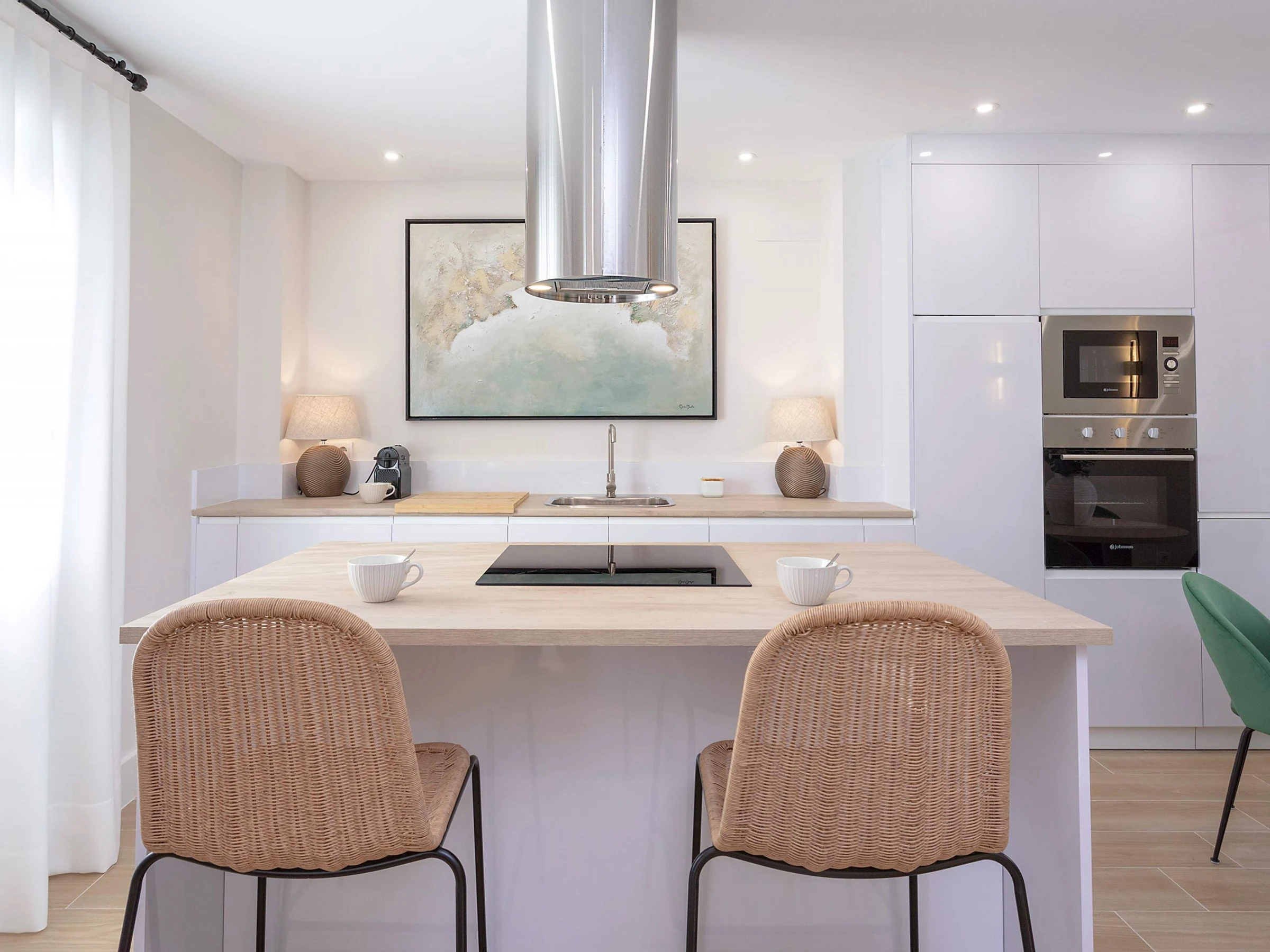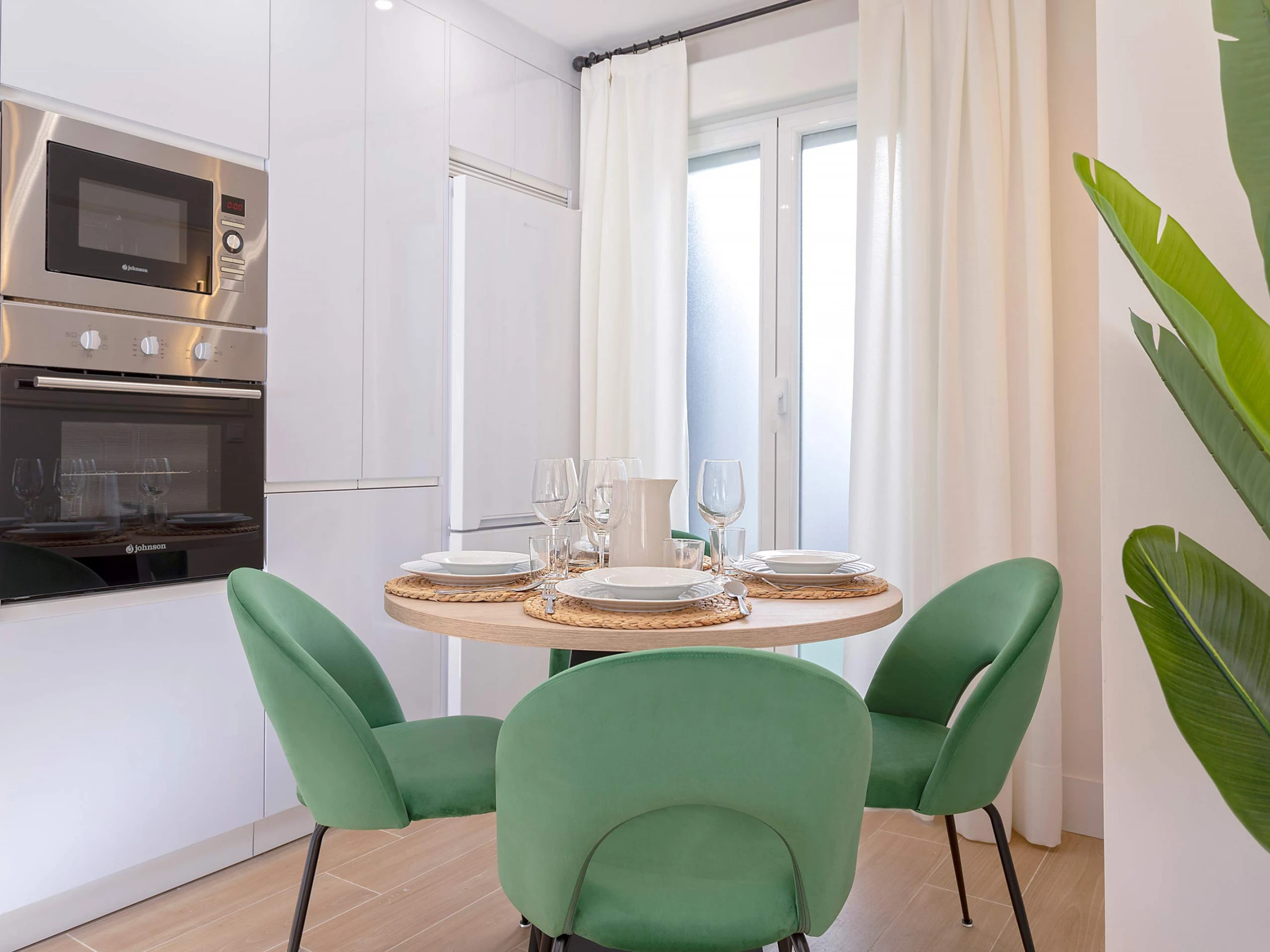 La cocina, abierta al salón-comedor, está totalmente equipada para disfrutar cocinando durante la estancia. El salón, espacioso y luminoso, es perfecto para descansar tras un día recorriendo la ciudad.