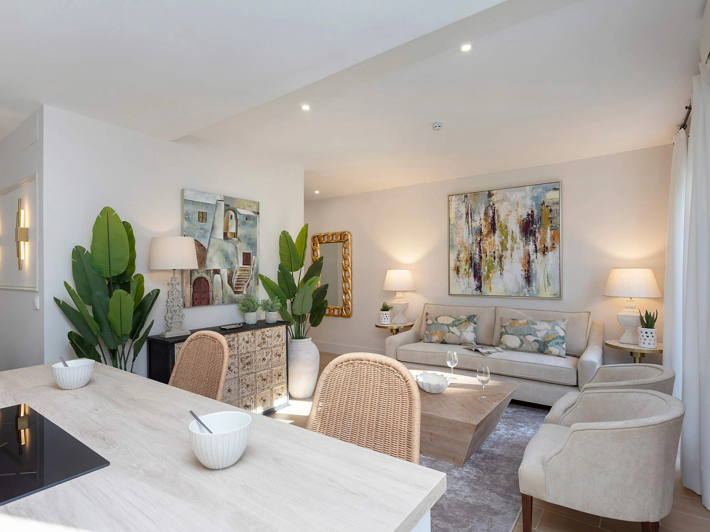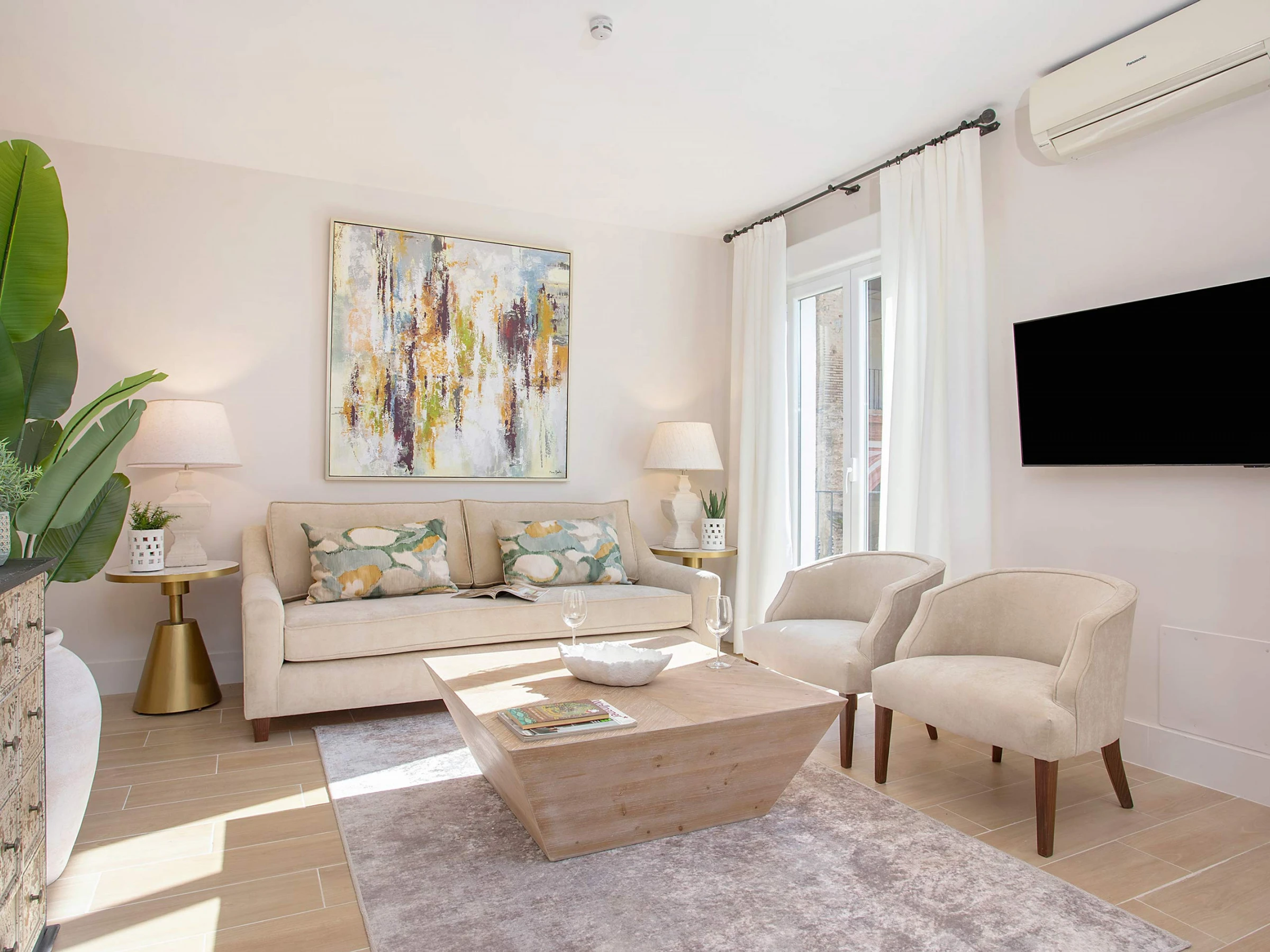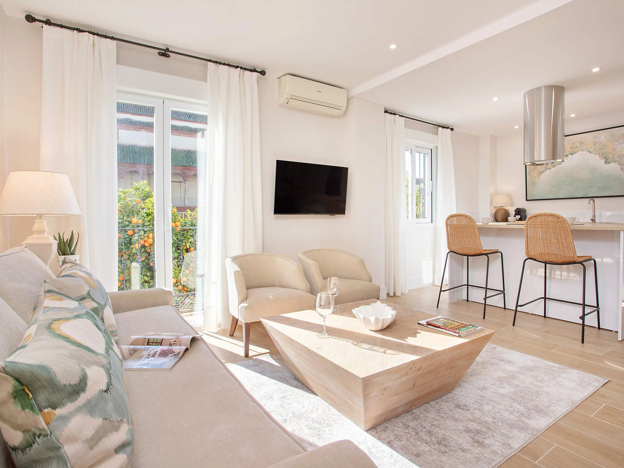 La cocina, abierta al salón-comedor, está totalmente equipada para disfrutar cocinando durante la estancia. El salón, espacioso y luminoso, es perfecto para descansar tras un día recorriendo la ciudad.