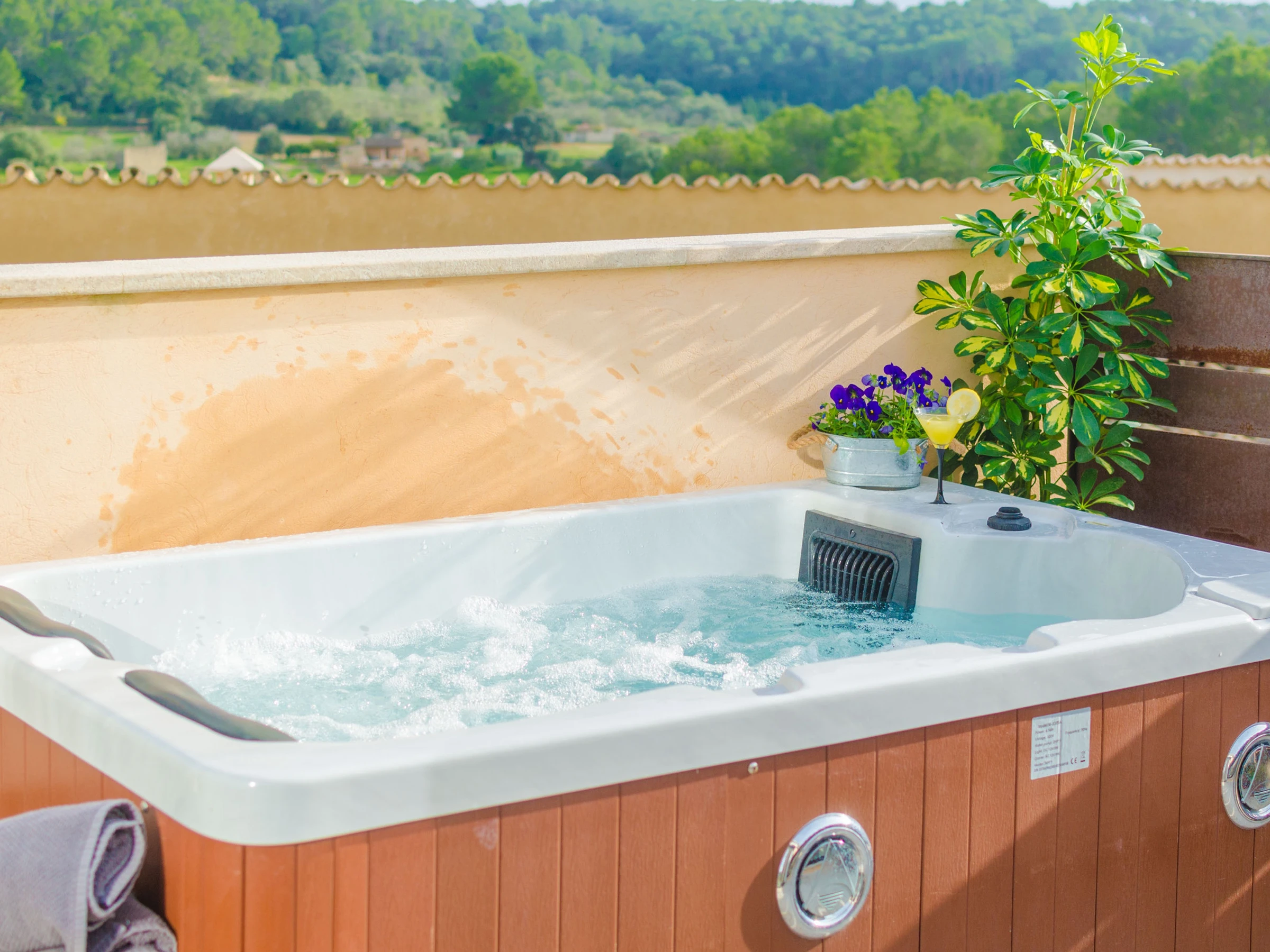 Justo a la entrada de la casa, una acogedora y bonita terraza de piedra te da la bienvenida. Es perfecta para disfrutar de un café cada mañana o de una buena copa de vino o champán cuando se pone el sol. Por otro lado, la terraza superior es aún mejor, ya que ofrece un maravilloso jacuzzi donde relajarse mientras admiras las impresionantes vistas a los campos forestales y dos tumbonas para tomar el sol. La temperatura del jacuzzi varía entre 15 y 43ºC.