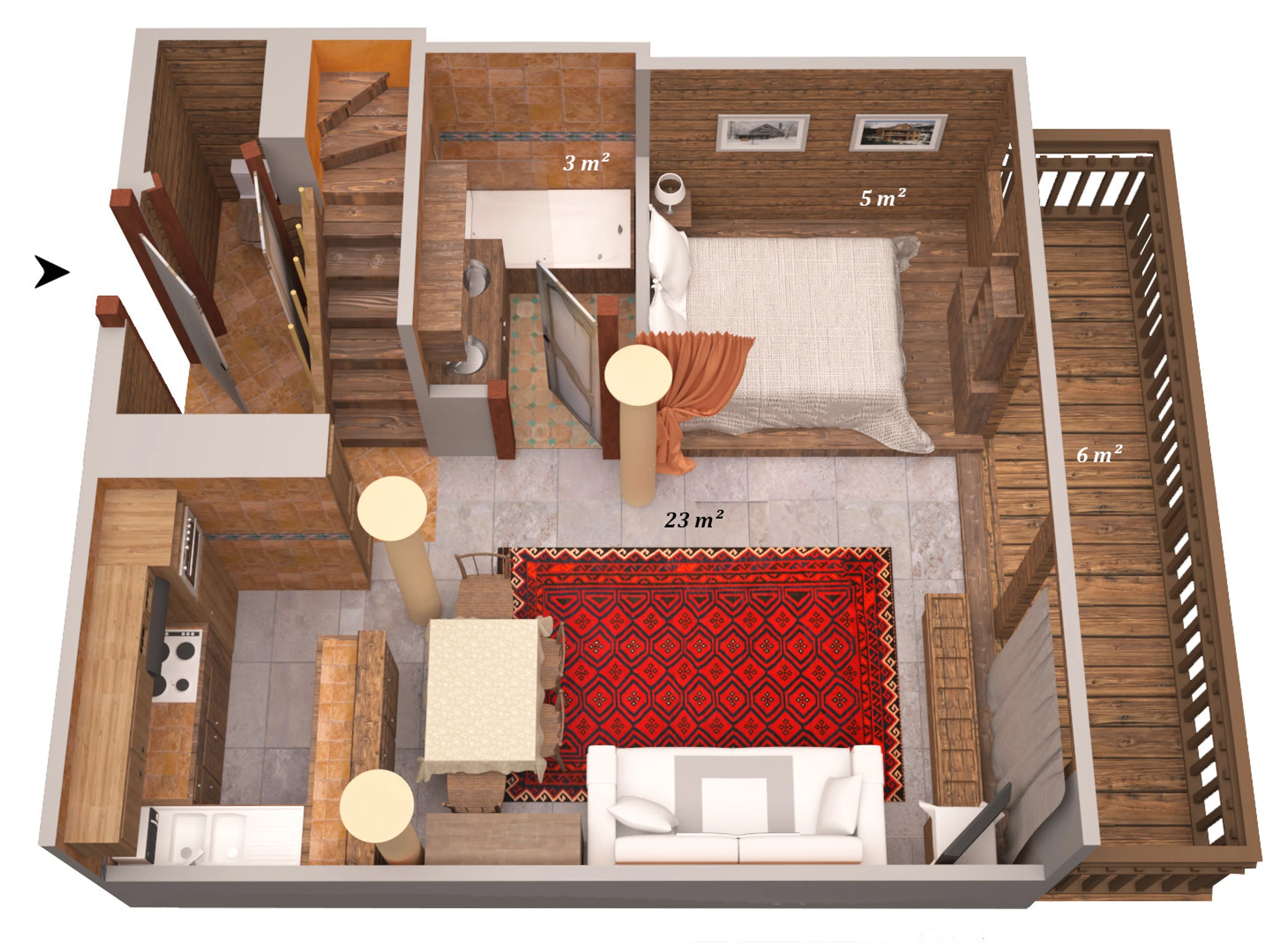 El 12R es un acogedor apartamento con orientación sur de 37 m² + 20 m² de entreplanta, con capacidad para 6 personas.