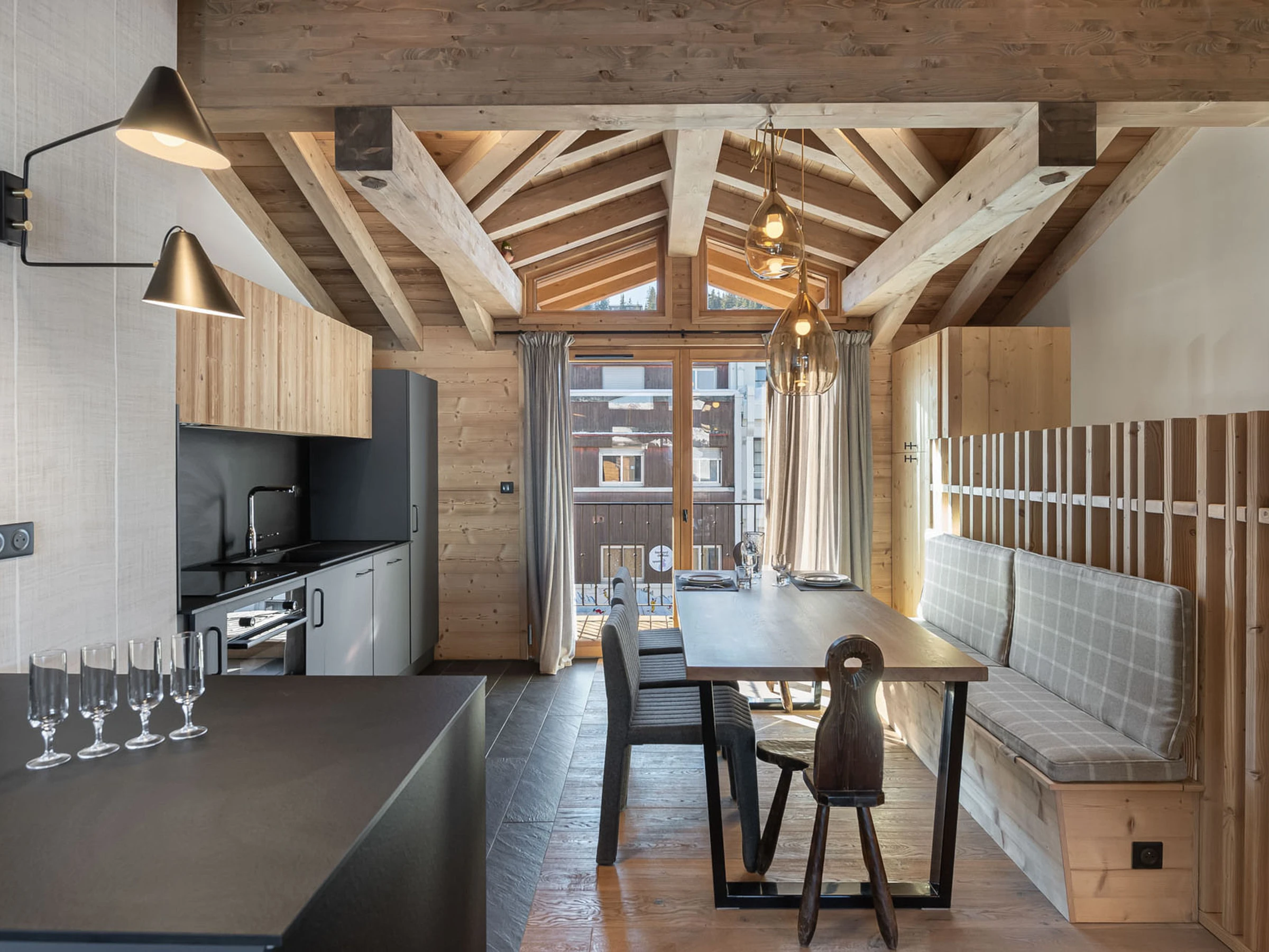 Dúplex de 90 m2, que puede alojar hasta 8 personas. 4 dormitorios y un amplio salón. Frente a la nieve y en el centro de Courchevel, cerca de todos los servicios, especialmente cerca de una tienda de comestibles y restaurantes locales. Pistas de esquí y remontes a 100m.