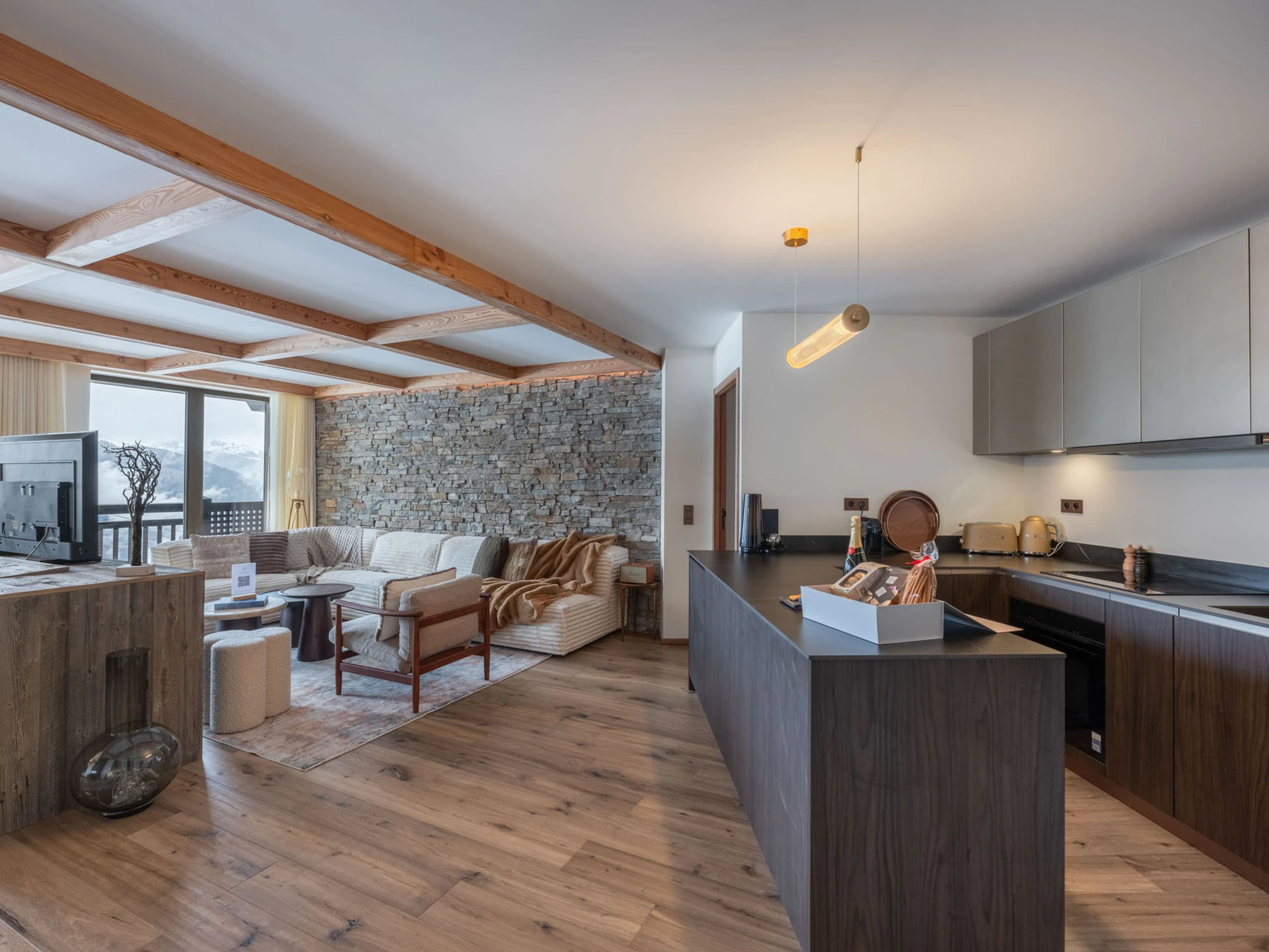 Apartamento nuevo de 126 m² para 6 adultos y 2 niños, con 3 dormitorios y un rincón de montaña. Las pistas de esquí están a los pies de la residencia y se accede por el guardaesquís.