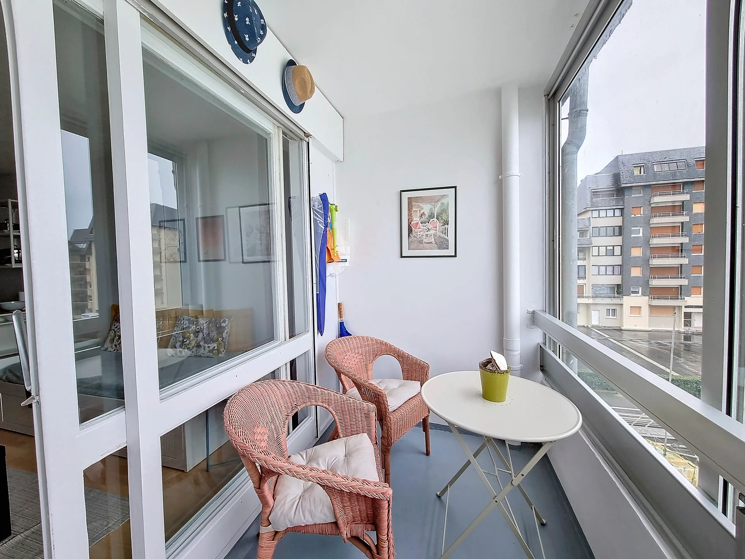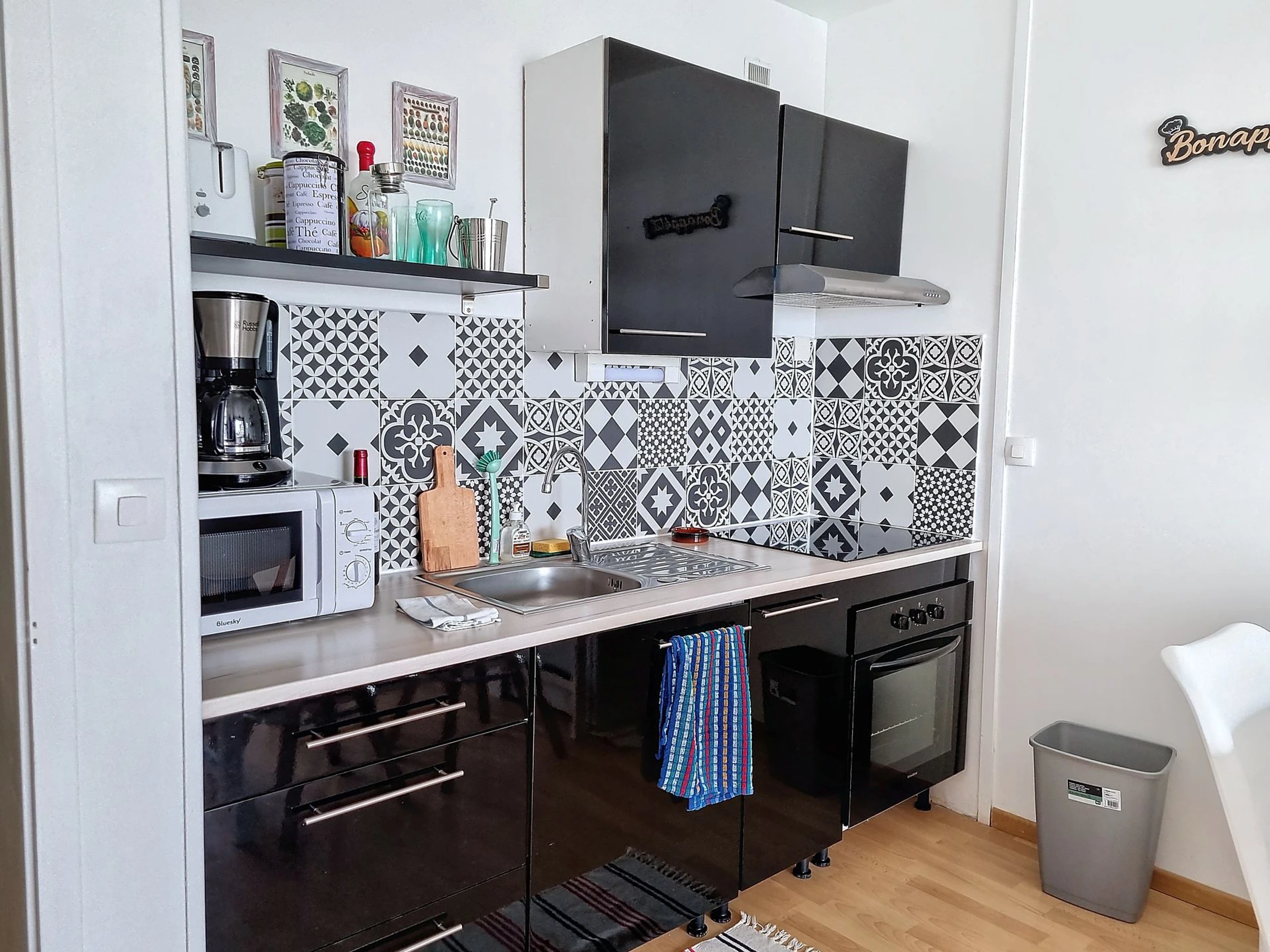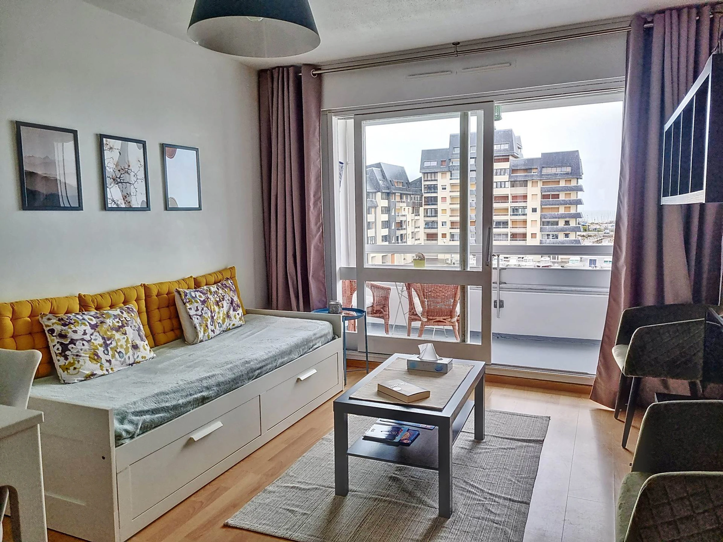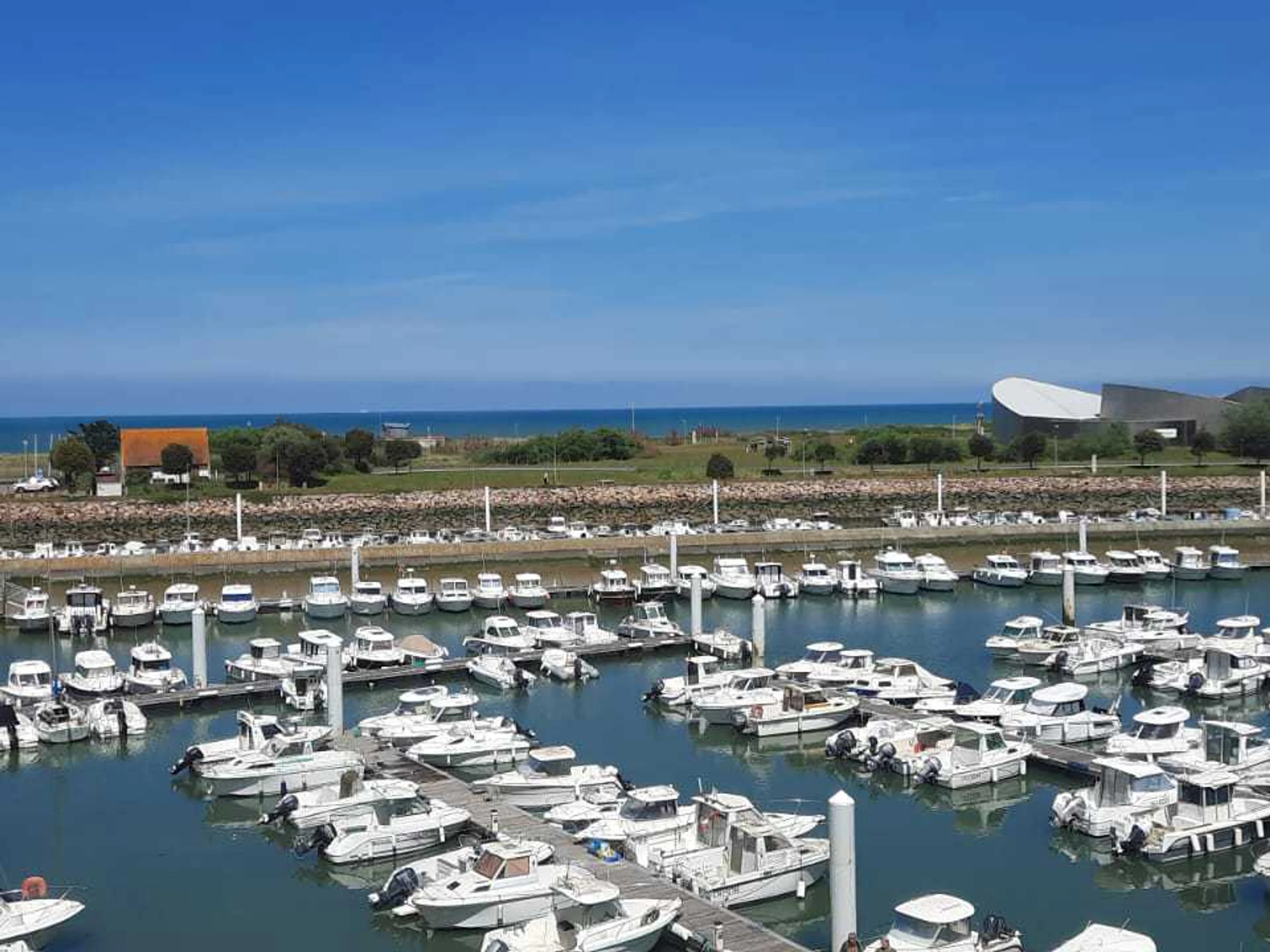 Apartamento vue mer situado en un troisième étage sin ascensor en una estación balnéaire a 200 mètres de la plage et du musée de JUNO BEACH que incluye una estancia con canapé iluminado para dos personas, dimensiones 160x190, una logia donnant sur le port de plaisance et una vue mer, Cocina abierta equipada con placa de inducción, frigorífico, cuatro, microondas, cafetera.