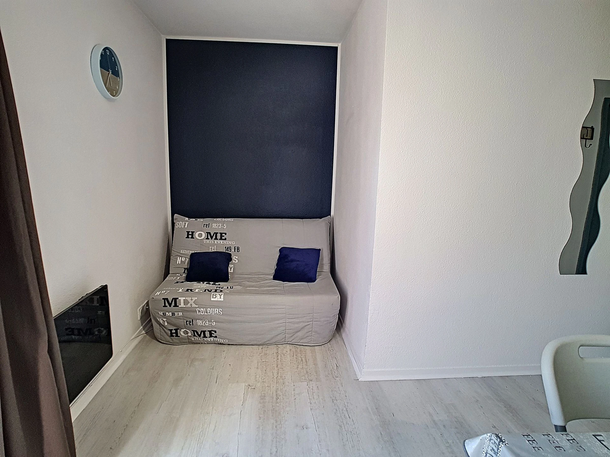 Une pièce de vie avec un balcon exposé Sud, un canapé convertible de 2 personnes 140*190, Télévision, coin repas