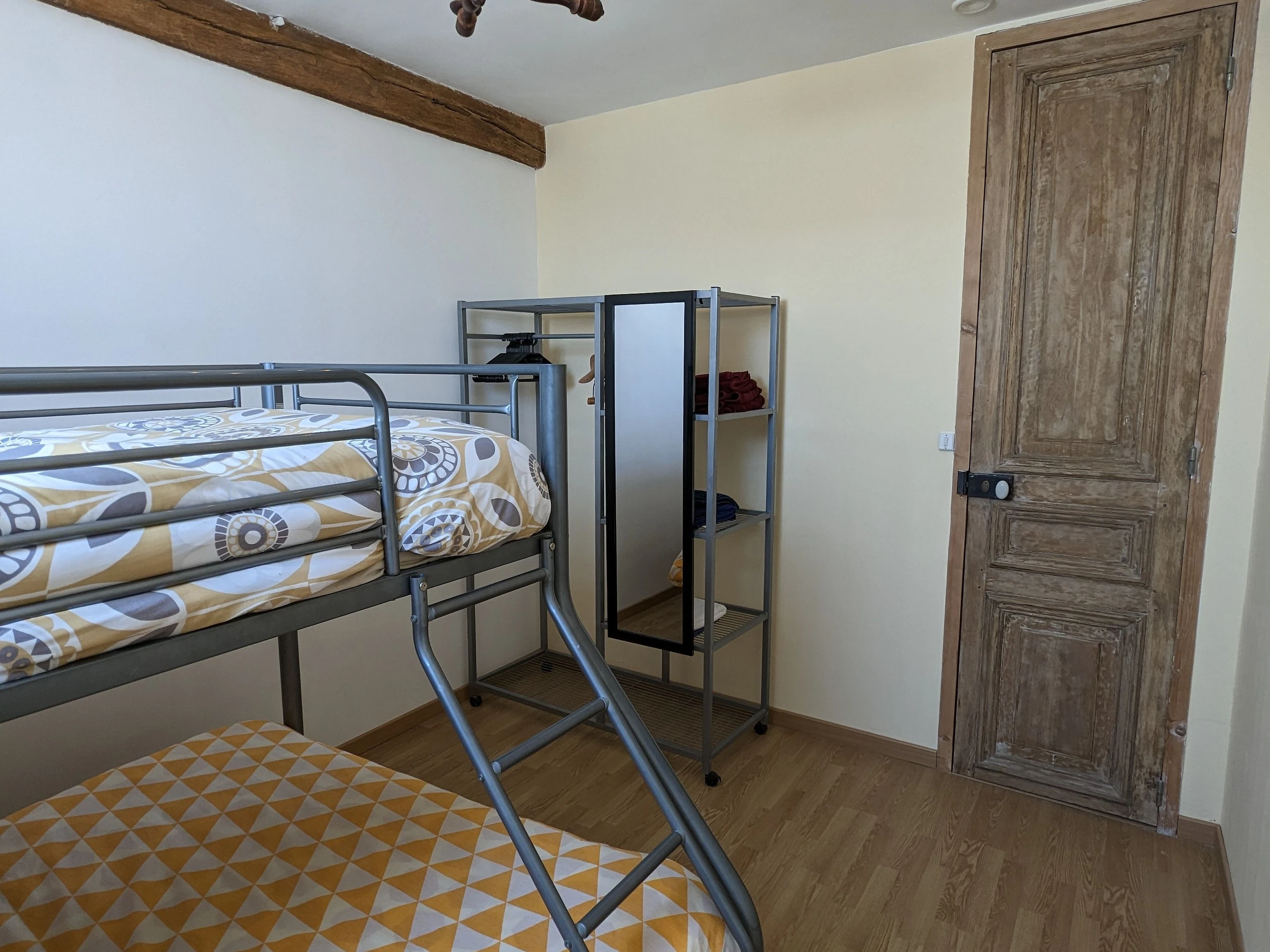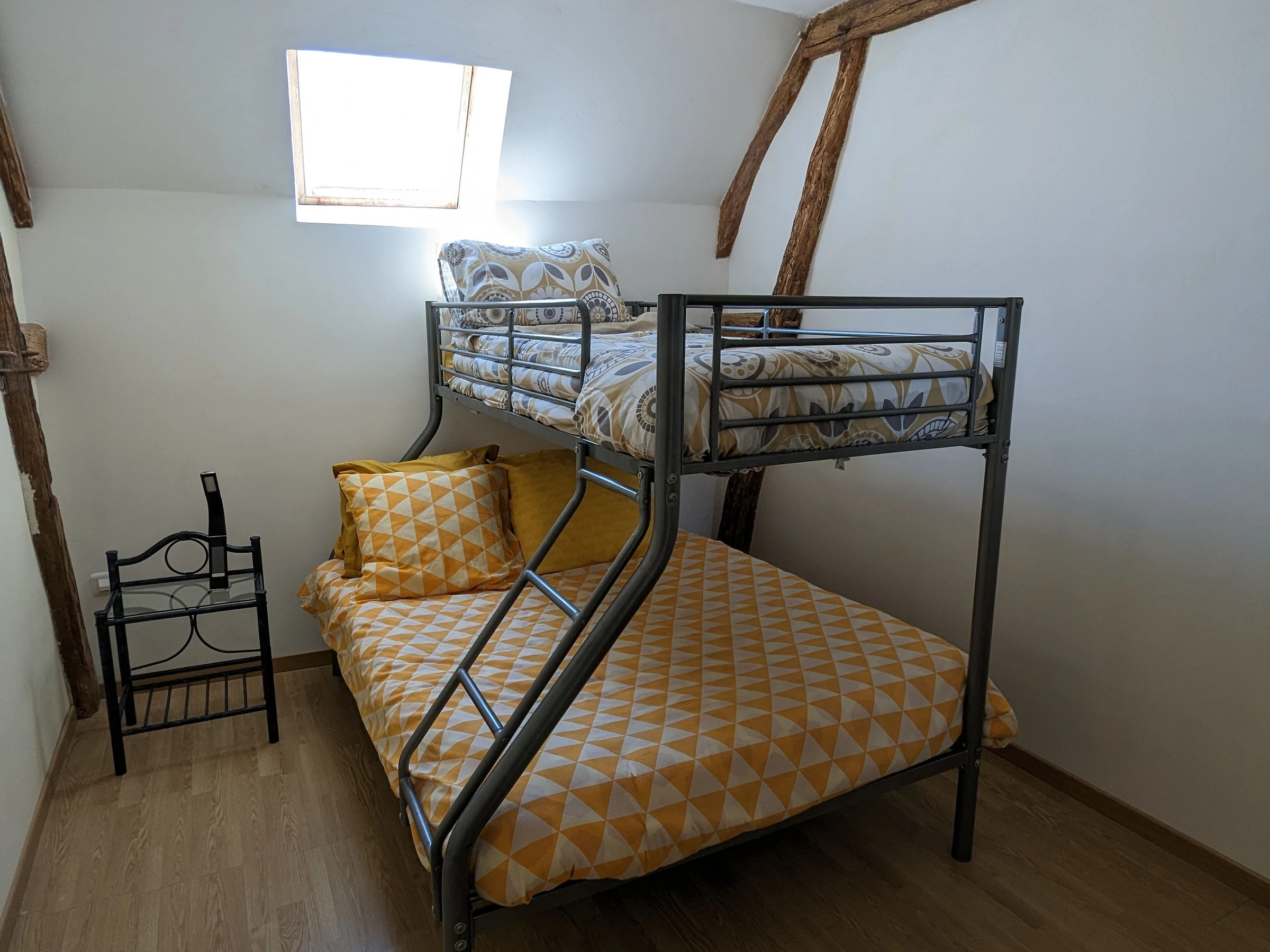 Arriba: 3 dormitorios, dos dormitorios con 1 cama de 140x190 cm cada uno y un dormitorio con una litera de 140x190 cm en la planta baja y una cama de 90x190 cm en la planta superior. Un cuarto de baño con wc.