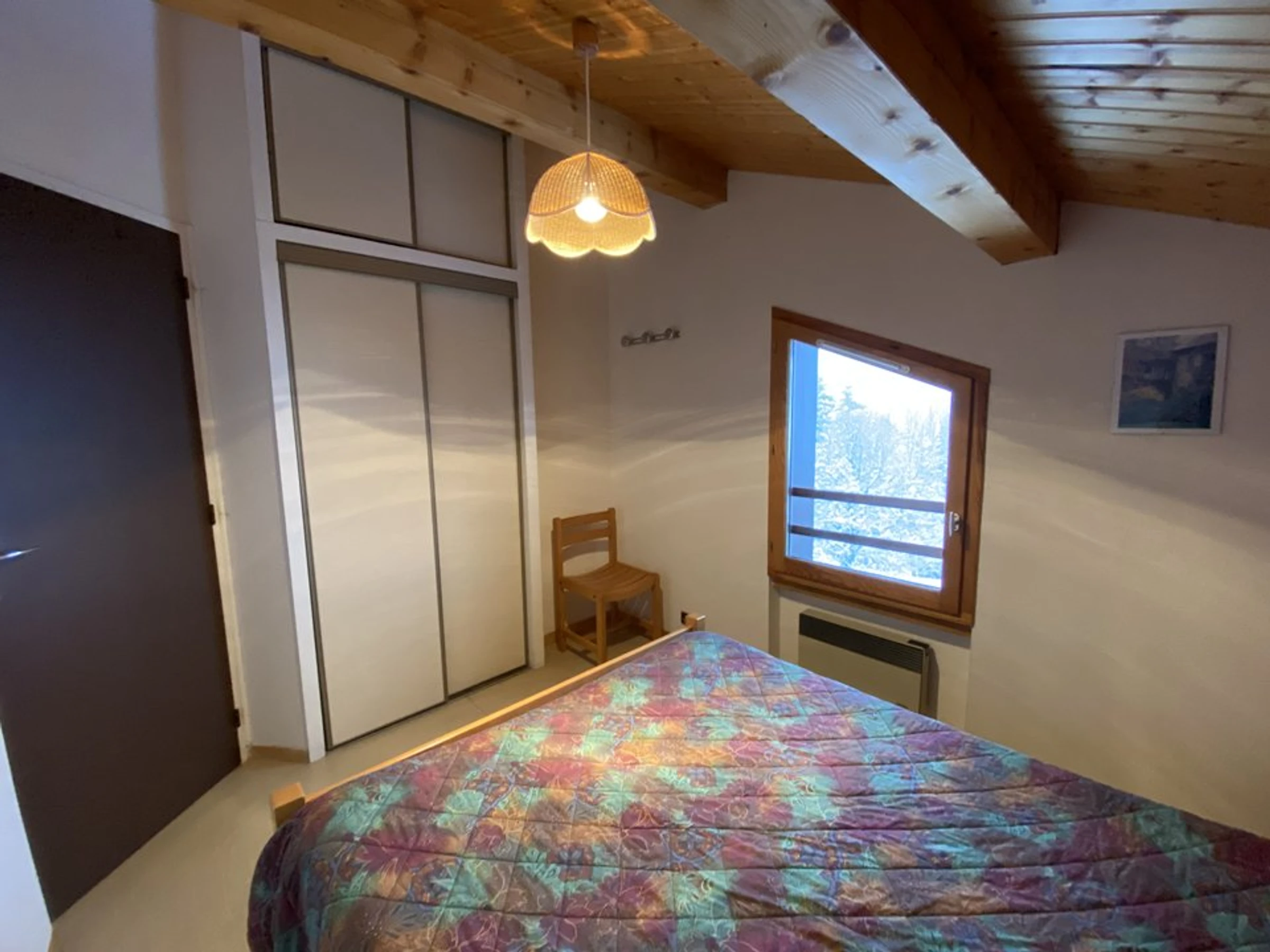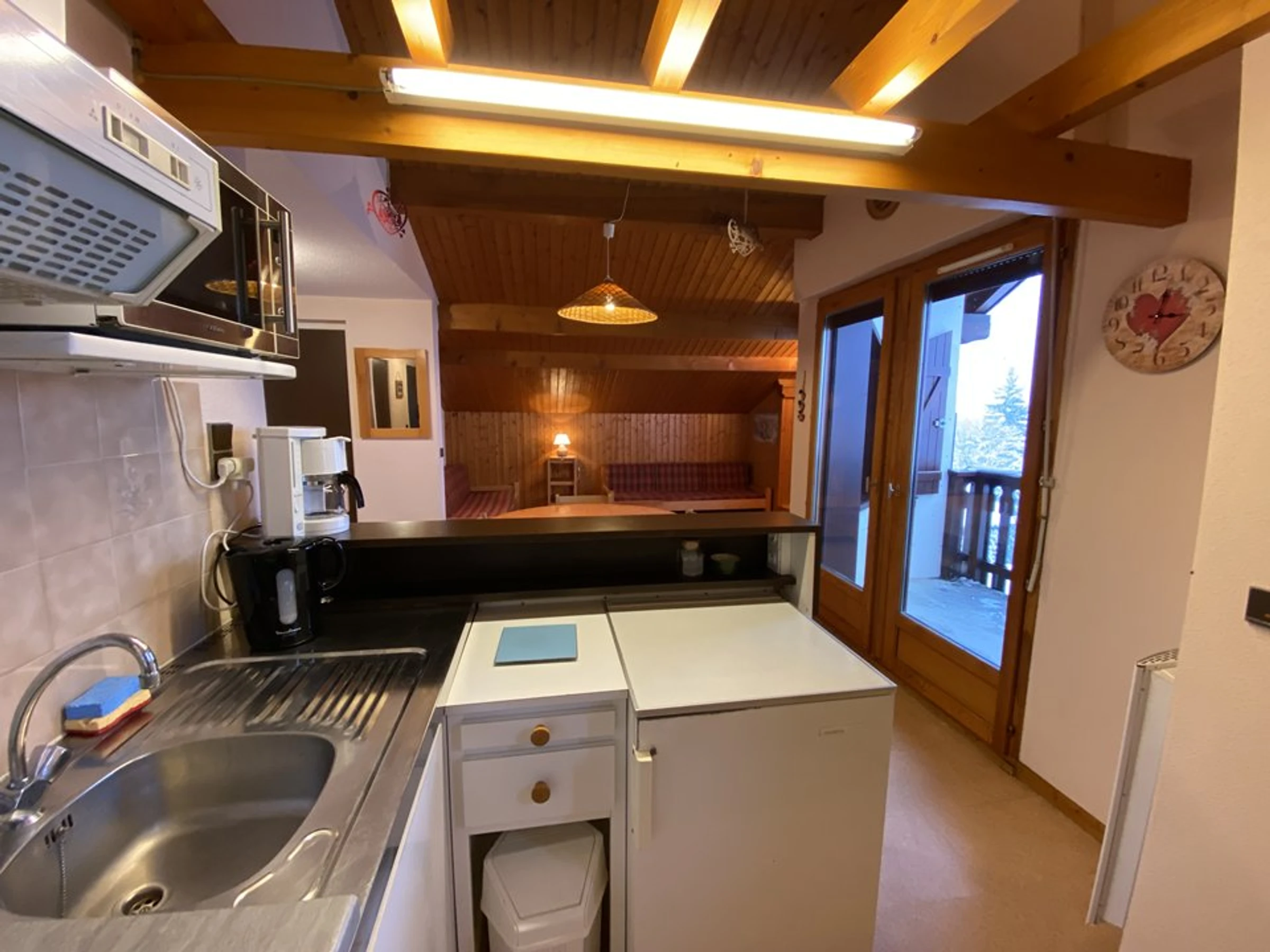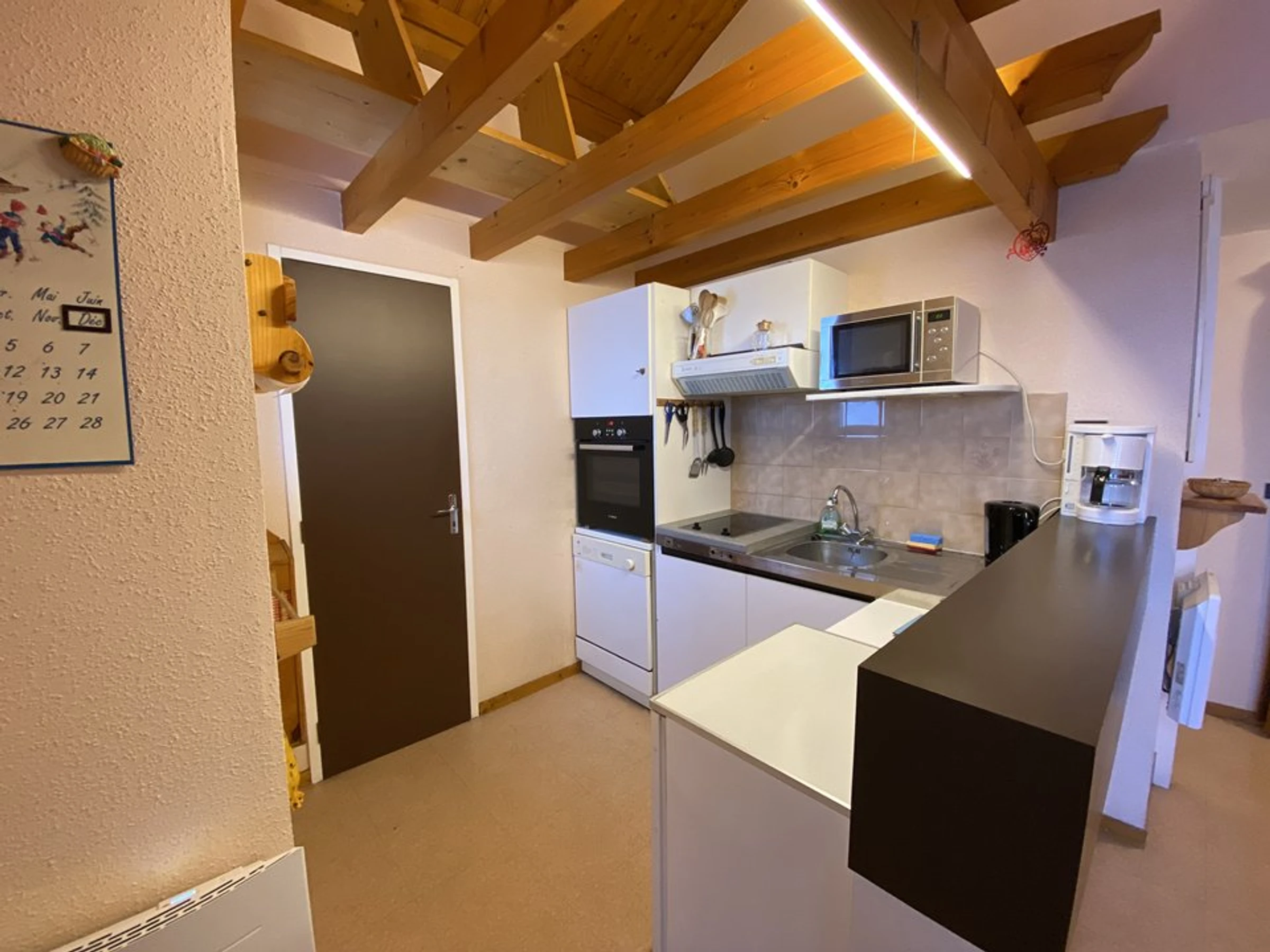 La entrada da al salón, con una cocina totalmente equipada (cafetera de filtro, horno, microondas, lavavajillas, etc.), comedor y sala de estar con TV y acceso al balcón orientado al suroeste. Vistas a las montañas de Charvin.