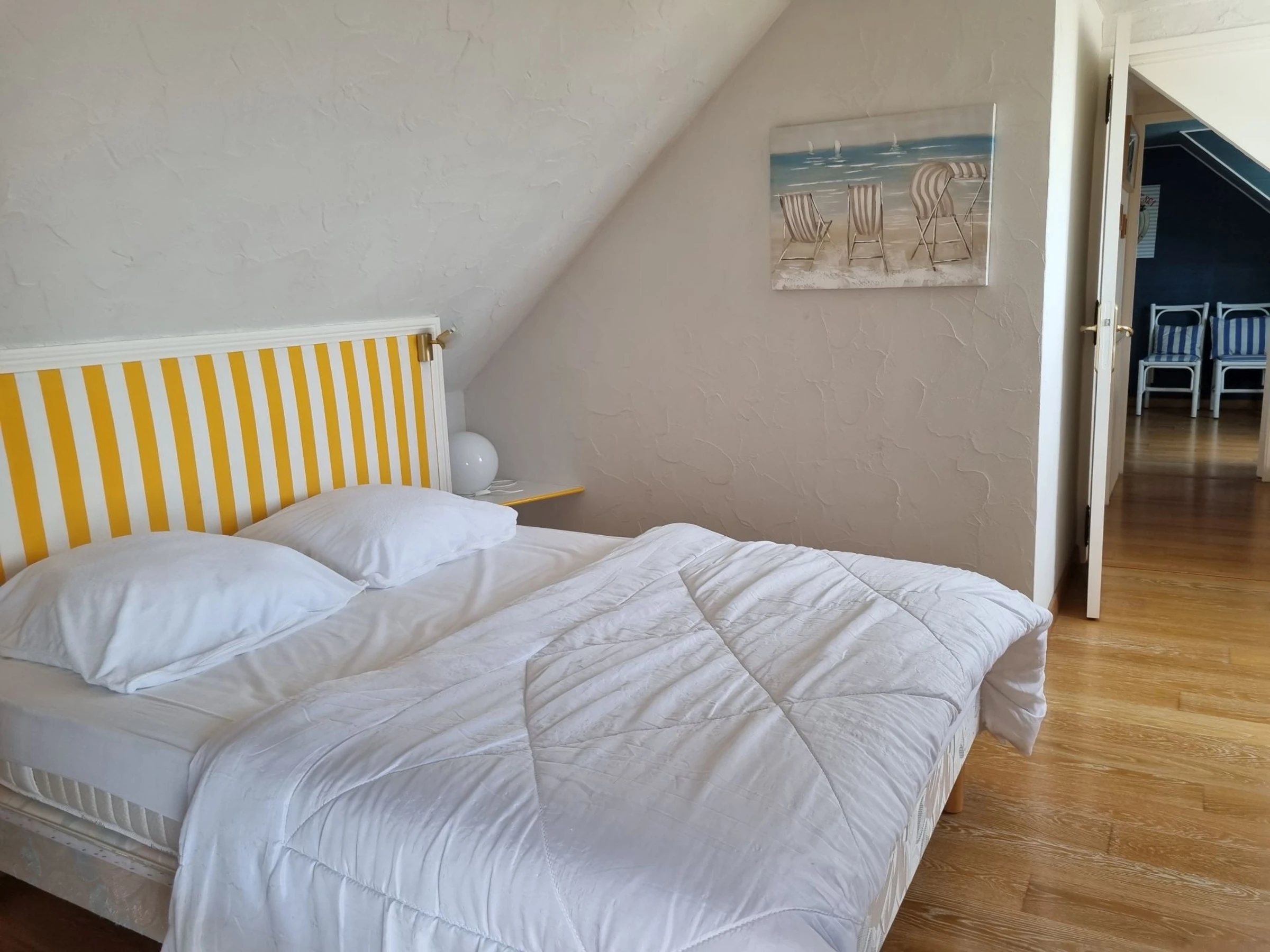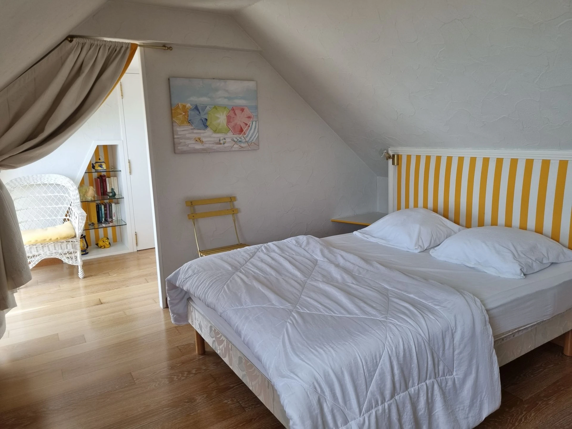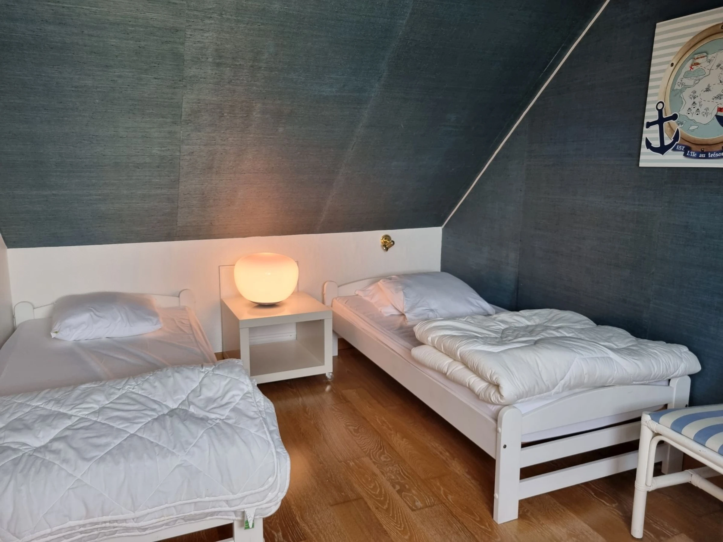 En la planta superior: un tercer dormitorio con dos camas individuales (90 cm), un cuarto de ducha con inodoro y un cuarto dormitorio con cama de matrimonio (140 cm) y armario.