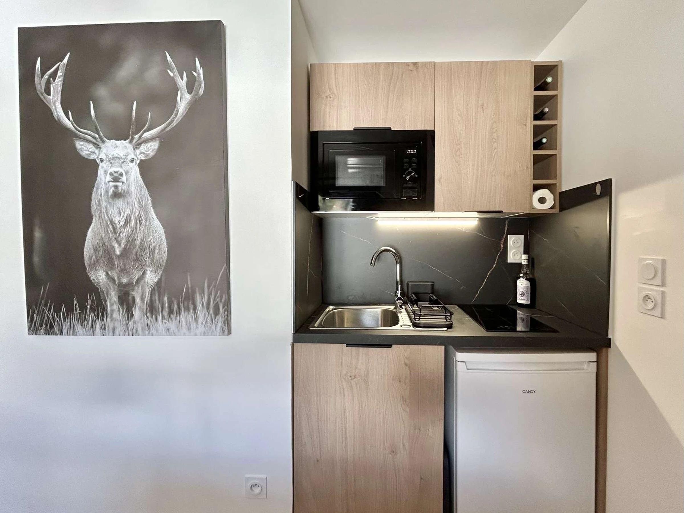 Este apartamento, completamente renovado y ubicado en la planta -1 (nivel del jardín), consta de un recibidor con un dormitorio con una litera (dos camas individuales) de 80 x 190 cm (la litera superior no es apta para niños menores de 6 años), un dormitorio con una cama doble de 140 x 200 cm, un baño con ducha, un aseo independiente y una cocina-salón de concepto abierto con sofá, televisión y acceso a una terraza orientada al oeste.
