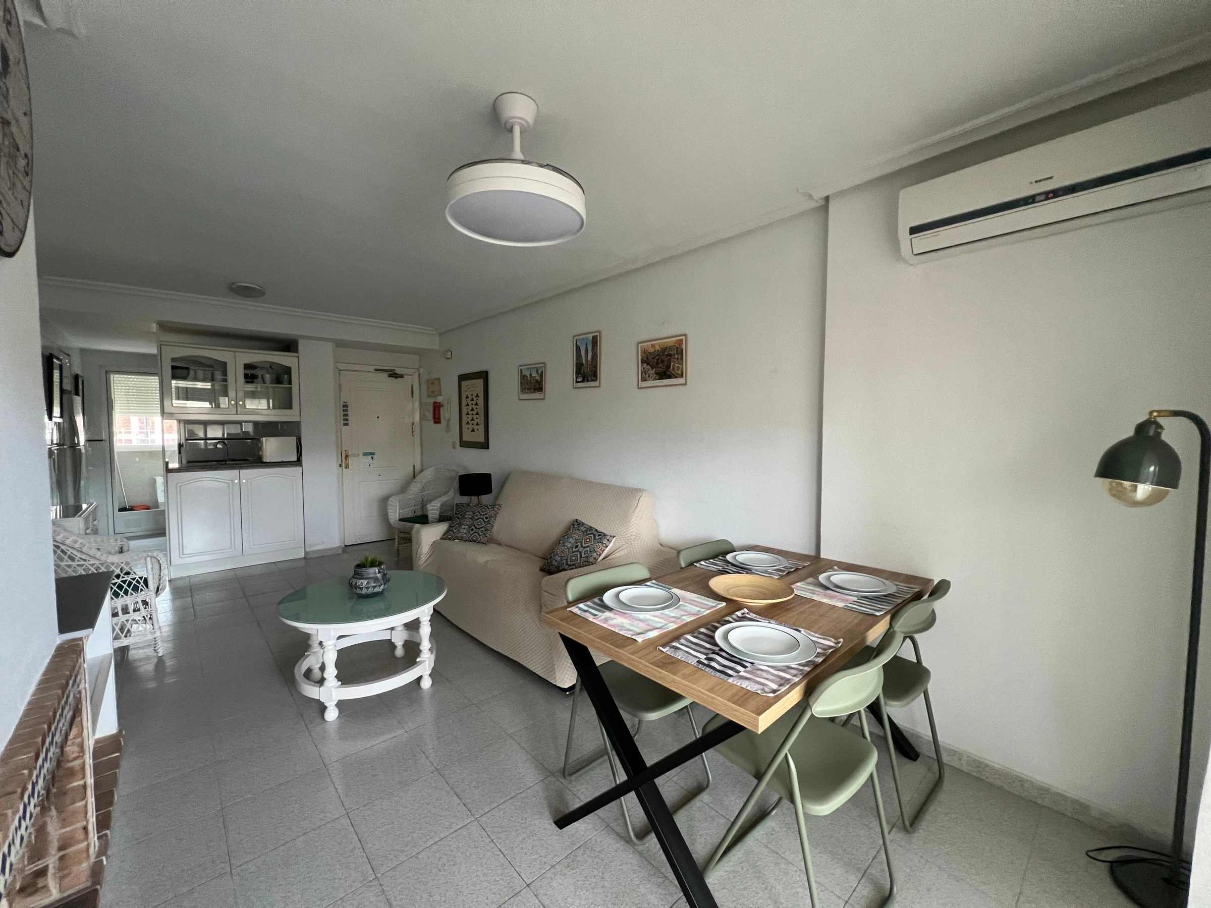 En el interior del apartamento, encontrará un cómodo salón/comedor con aire acondicionado, televisión y sofá. También dispone de 2 dormitorios y 1 cuarto de baño, así como una galería con lavadora.