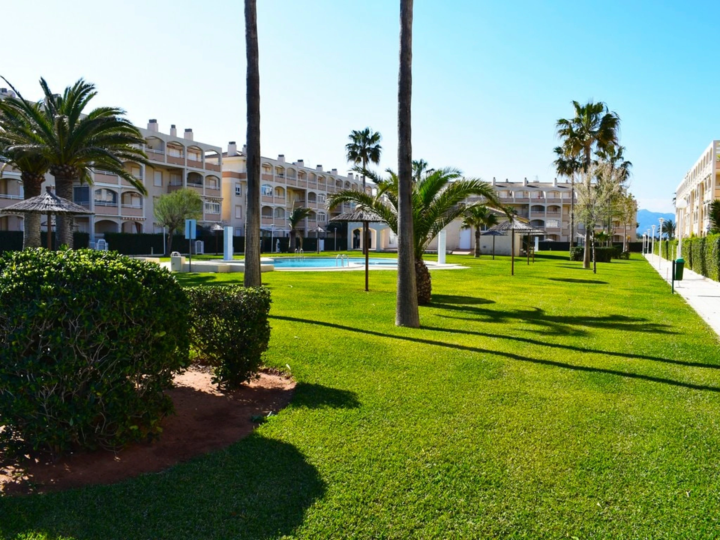En cuanto a las comodidades exteriores, el apartamento ofrece una urbanización vallada, dos piscinas comunitarias en forma de laguna, dos piscinas para niños, un jardín comunitario con césped y árboles, un parque infantil. Además, hay una plaza de parking cubierta asignada a la vivienda.