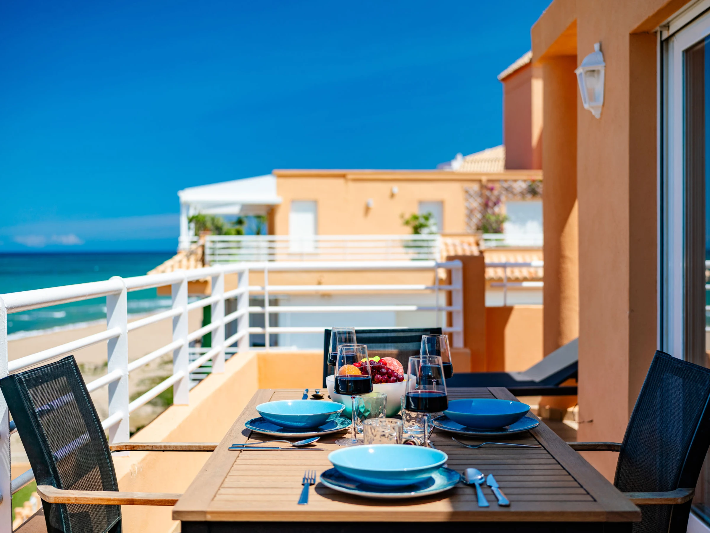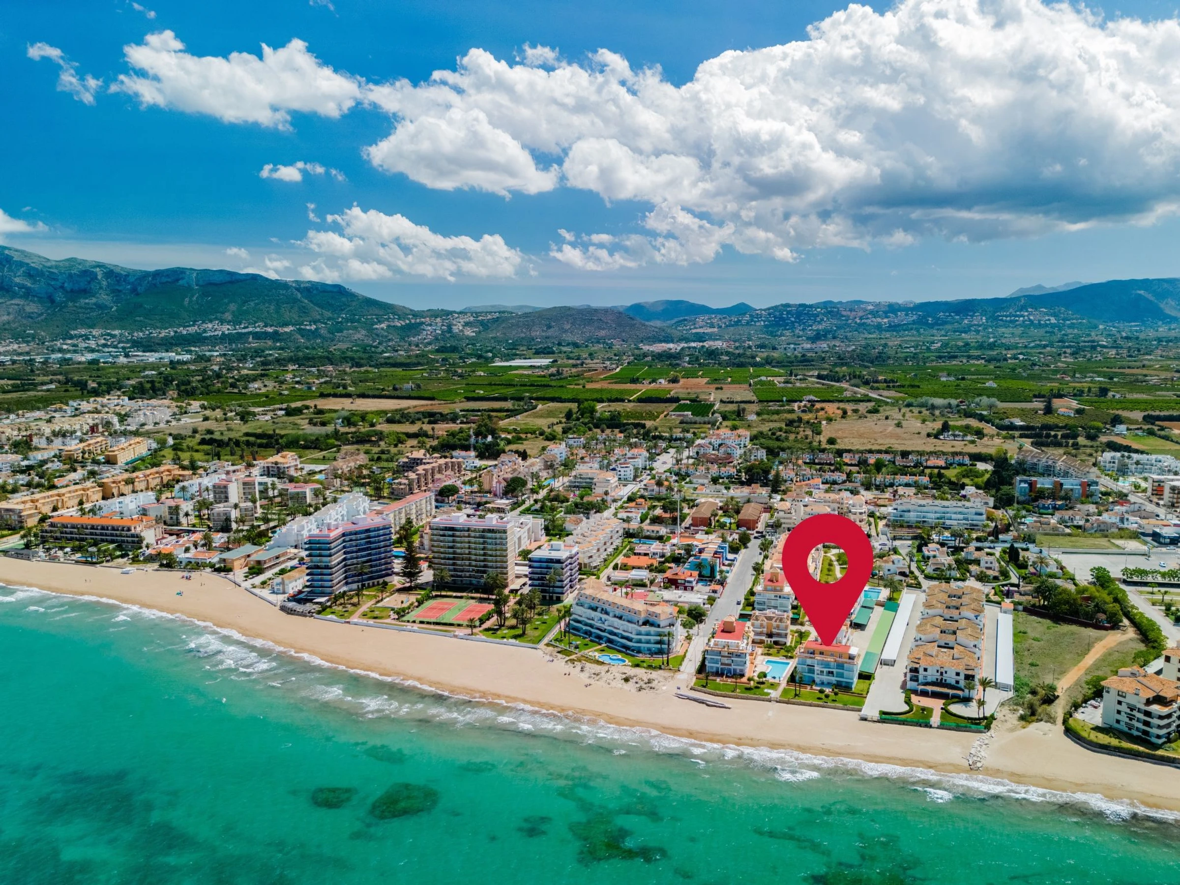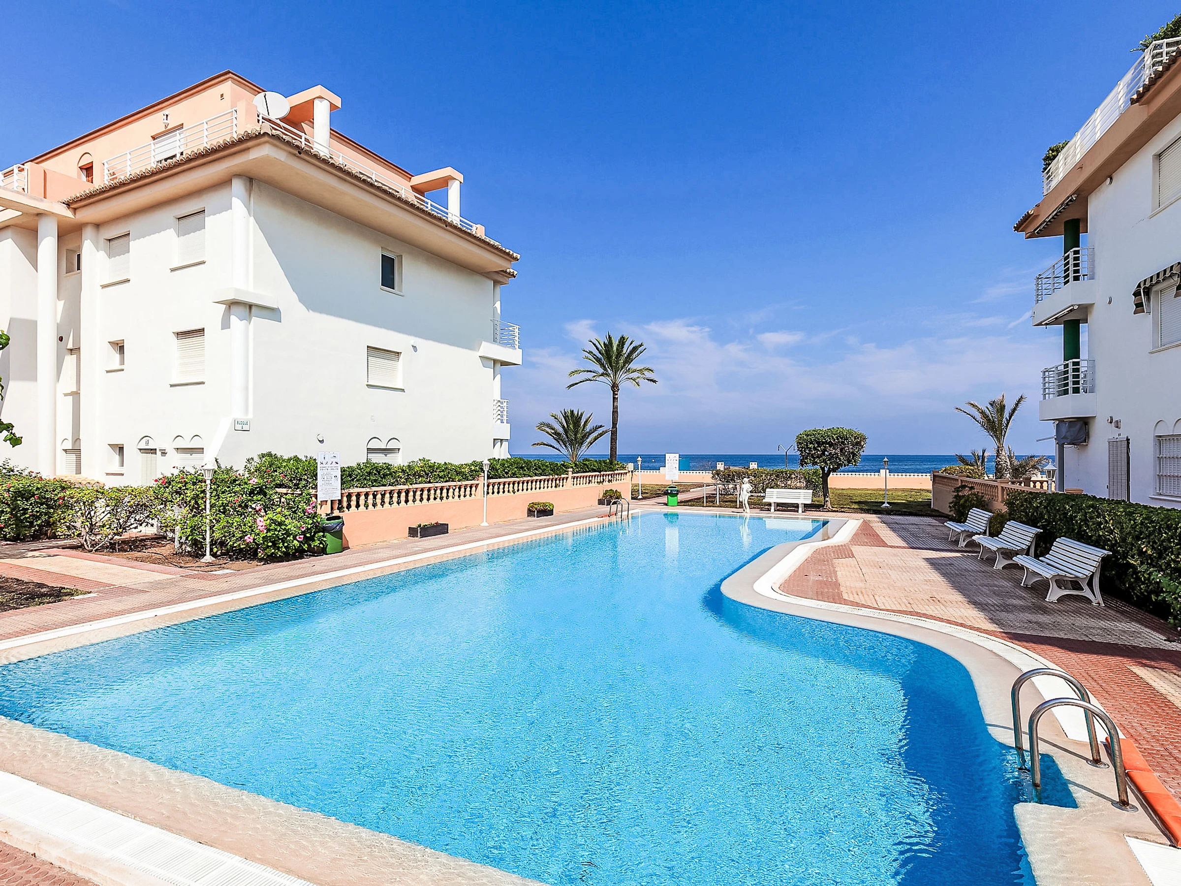Les Marines a 4 km de Dénia: Casa de apartamentos "Talima". En el distrito Les Marines, a 50 m del mar, a 15 m de la playa, acceso directo a la playa, en una calle sin salida. Comunitario: jardín (vallado) con césped, piscina (16 x 8 m, 75 - 250 cm de profundidad, Disponible por temporada: [hidden] - [hidden] Ducha exterior. Supermercado 450 m, restaurante 200 m, bar, café, parada autobús 450 m, estación de tren 6.4 km, terminal marítima 5.4 km, playa de arena 30 m.