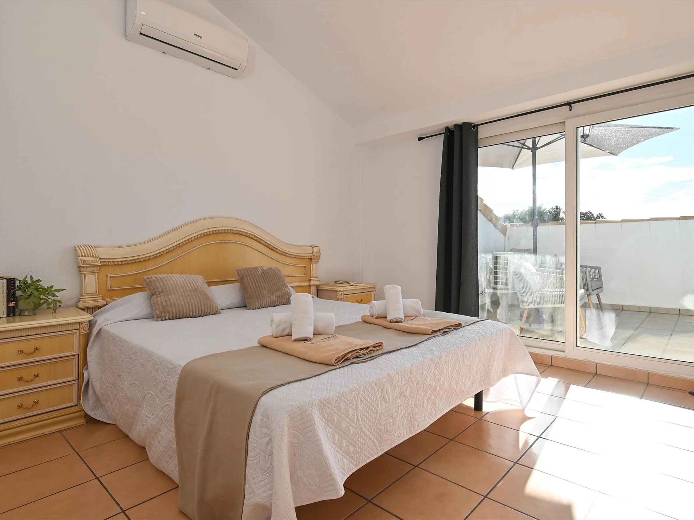 Dormitorios y baños2 dormitorios con aire acondicionado, cada uno con cama de matrimonio (200 x 160 cm)2 baños, cada uno con lavabo, ducha y WC