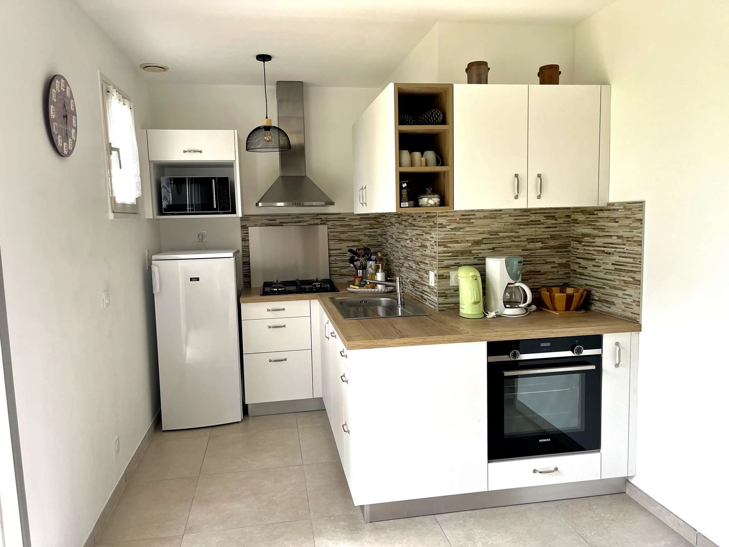 Cocina americana (horno a gas, frigorífico, 4 quemadores a gas, microondas, tostadora, cafetera)