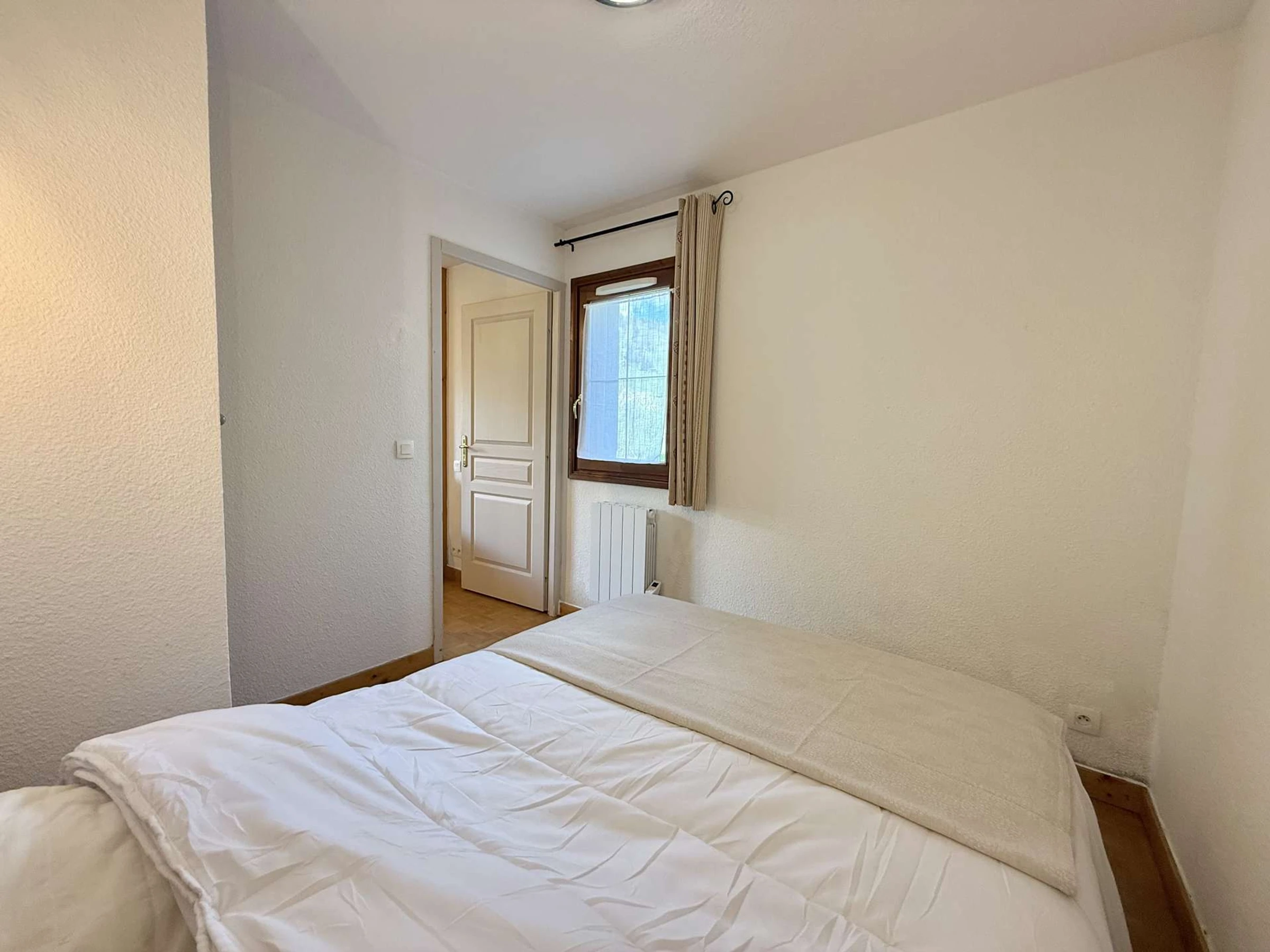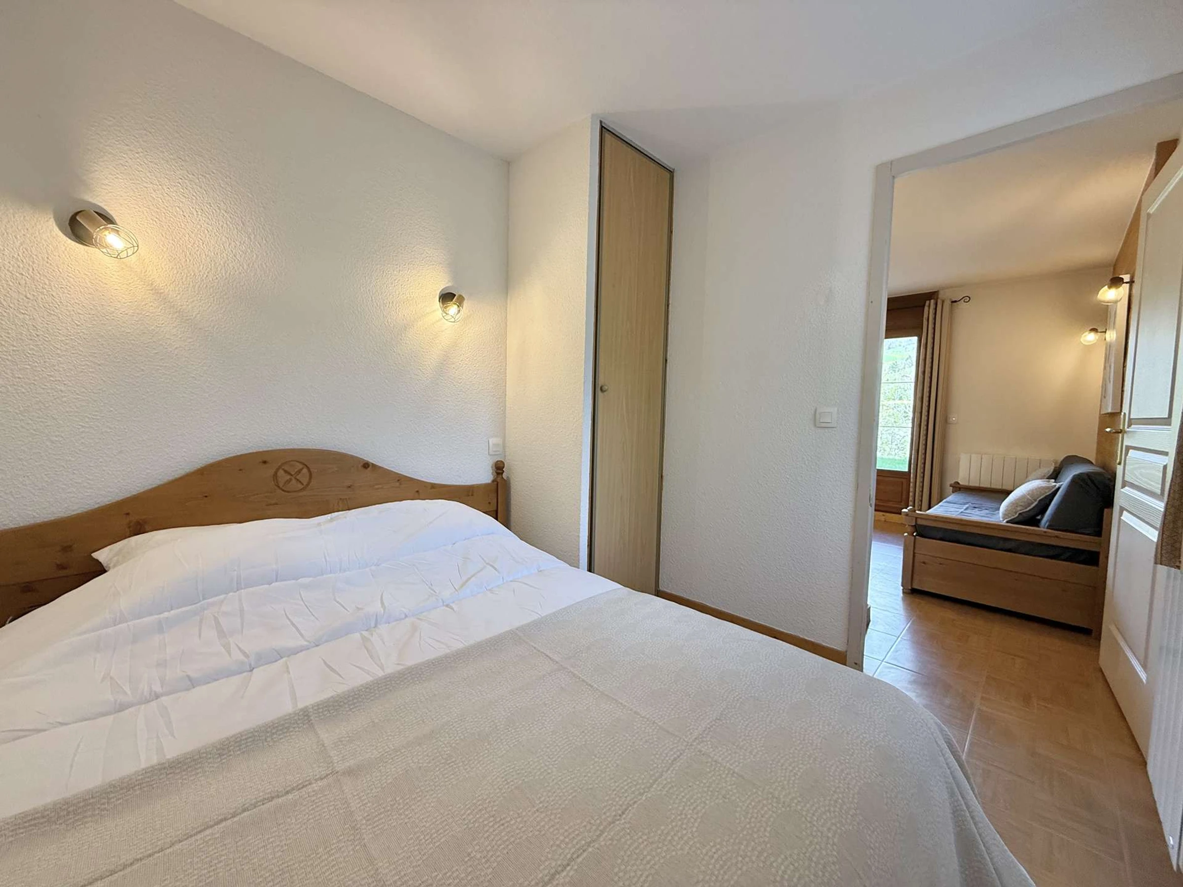 Situado en la planta baja de la residencia (acceso al apartamento: dos tramos de escaleras), este apartamento de montaña, de aproximadamente 27 m², consta de un salón con sofá cama para dos personas, una cocina totalmente equipada abierta al comedor y la sala de estar, un dormitorio con cama de matrimonio, un baño con bañera y un aseo independiente.