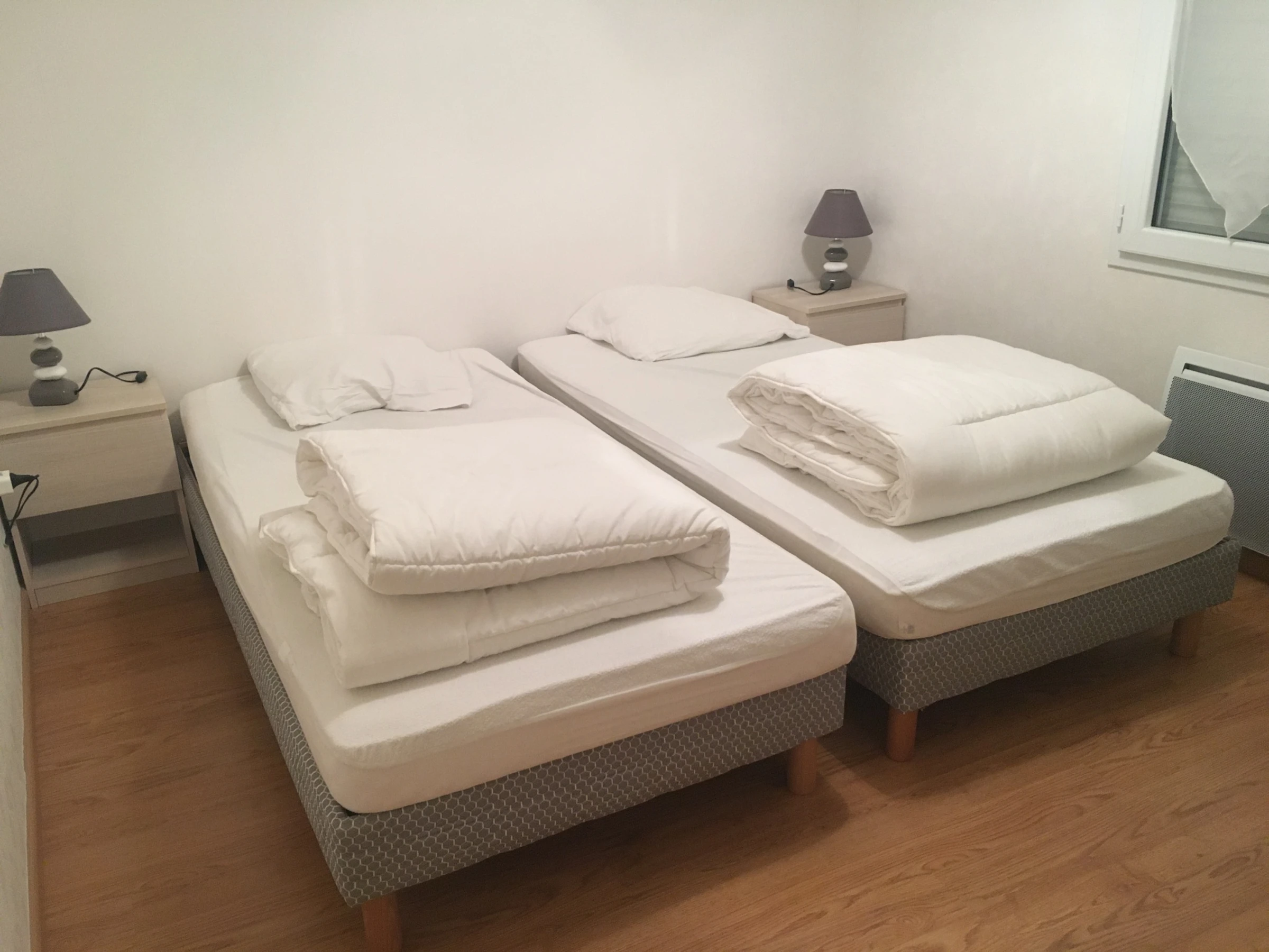 Dos dormitorios: uno con cama de matrimonio (160 cm) y el otro con dos camas individuales (90 cm).