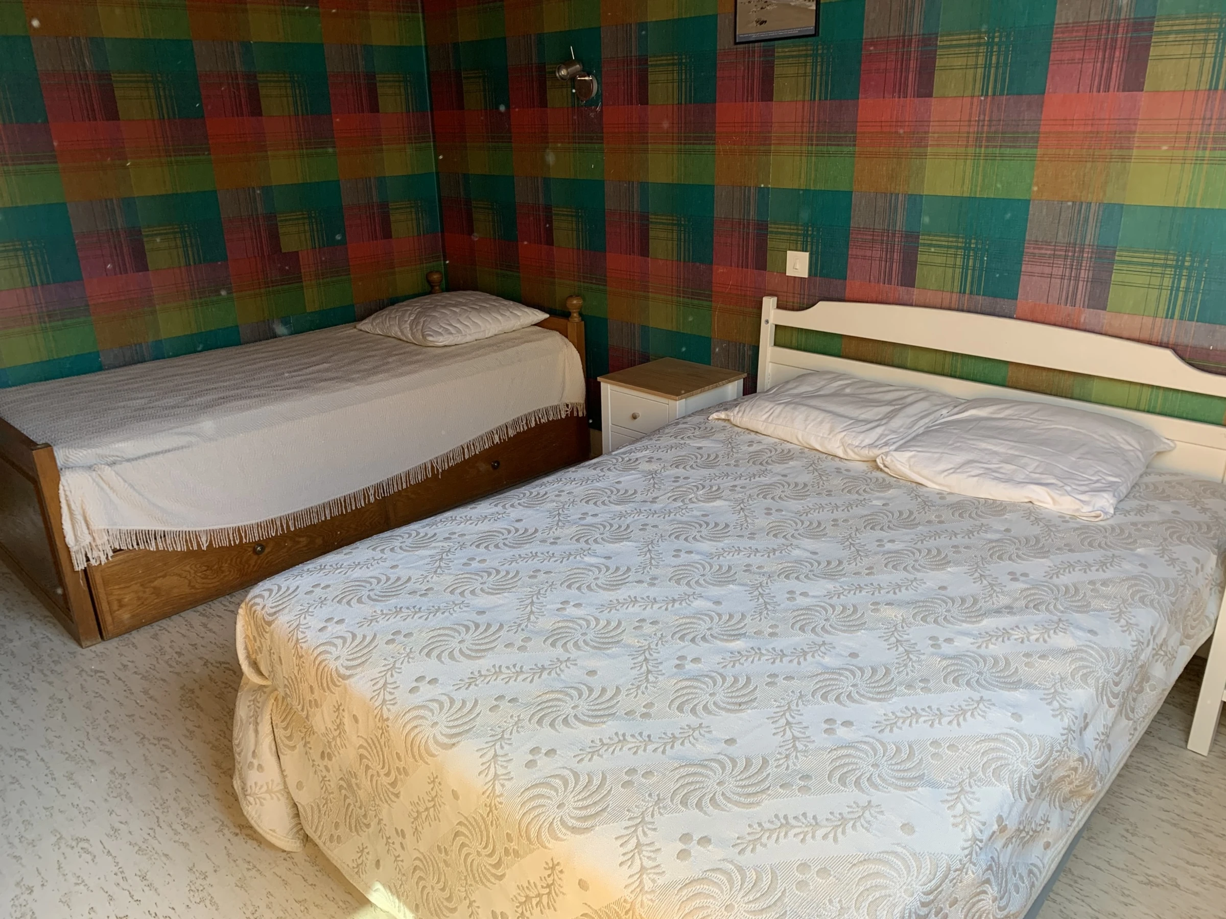 Arriba, 1 baño con WC, 1 dormitorio con cama de matrimonio de 140 cm y 1 cama individual de 90 cm.