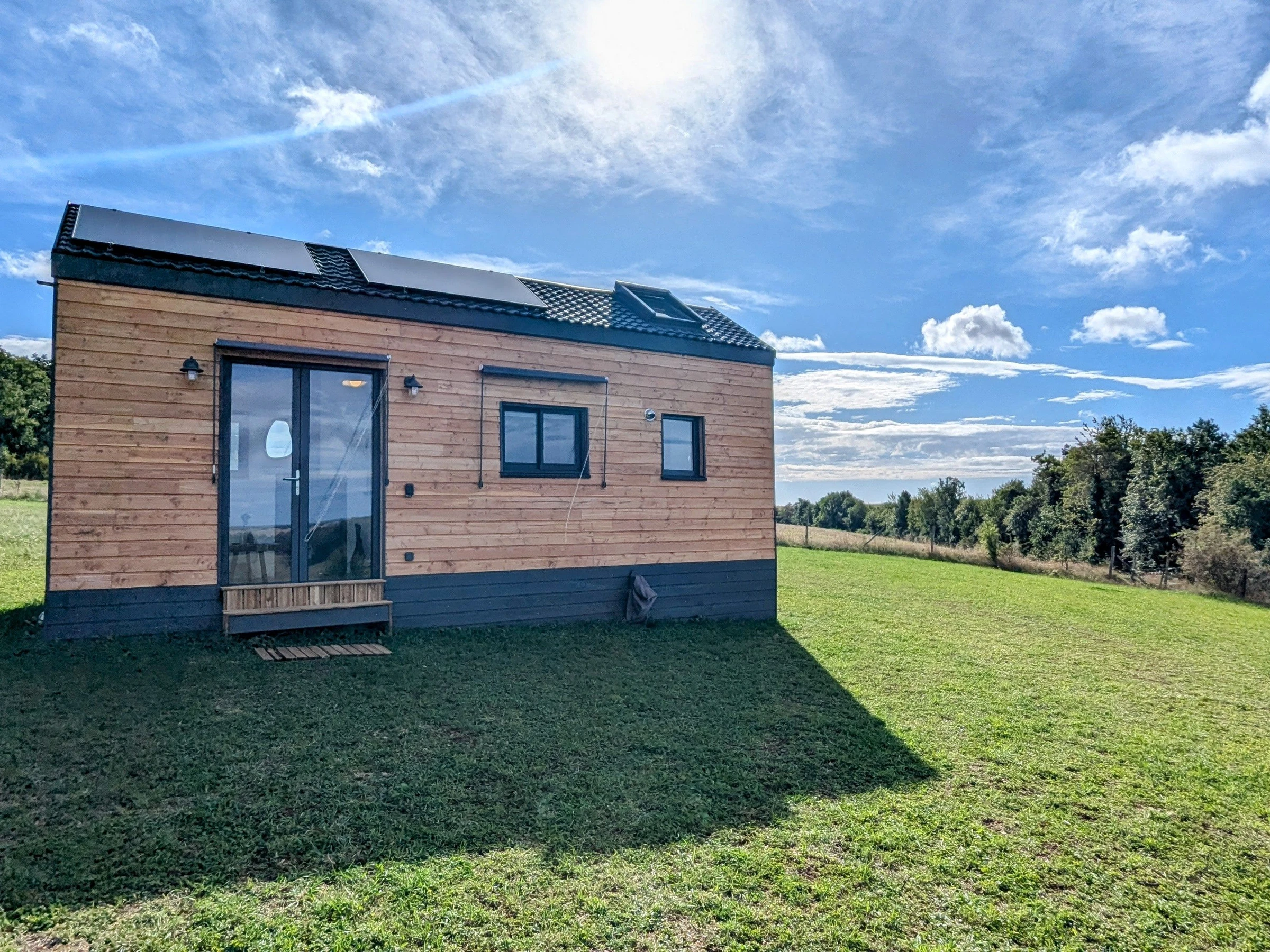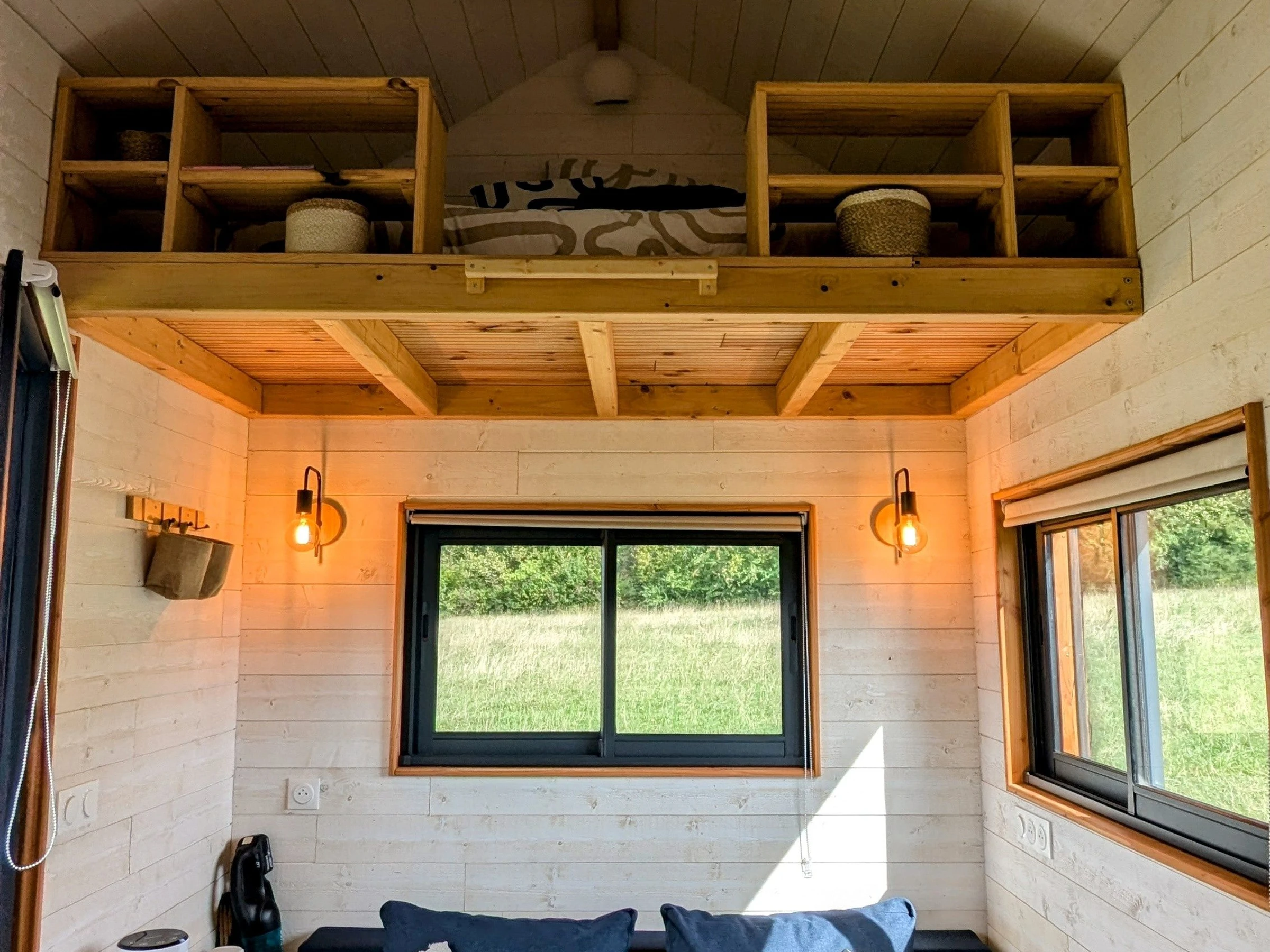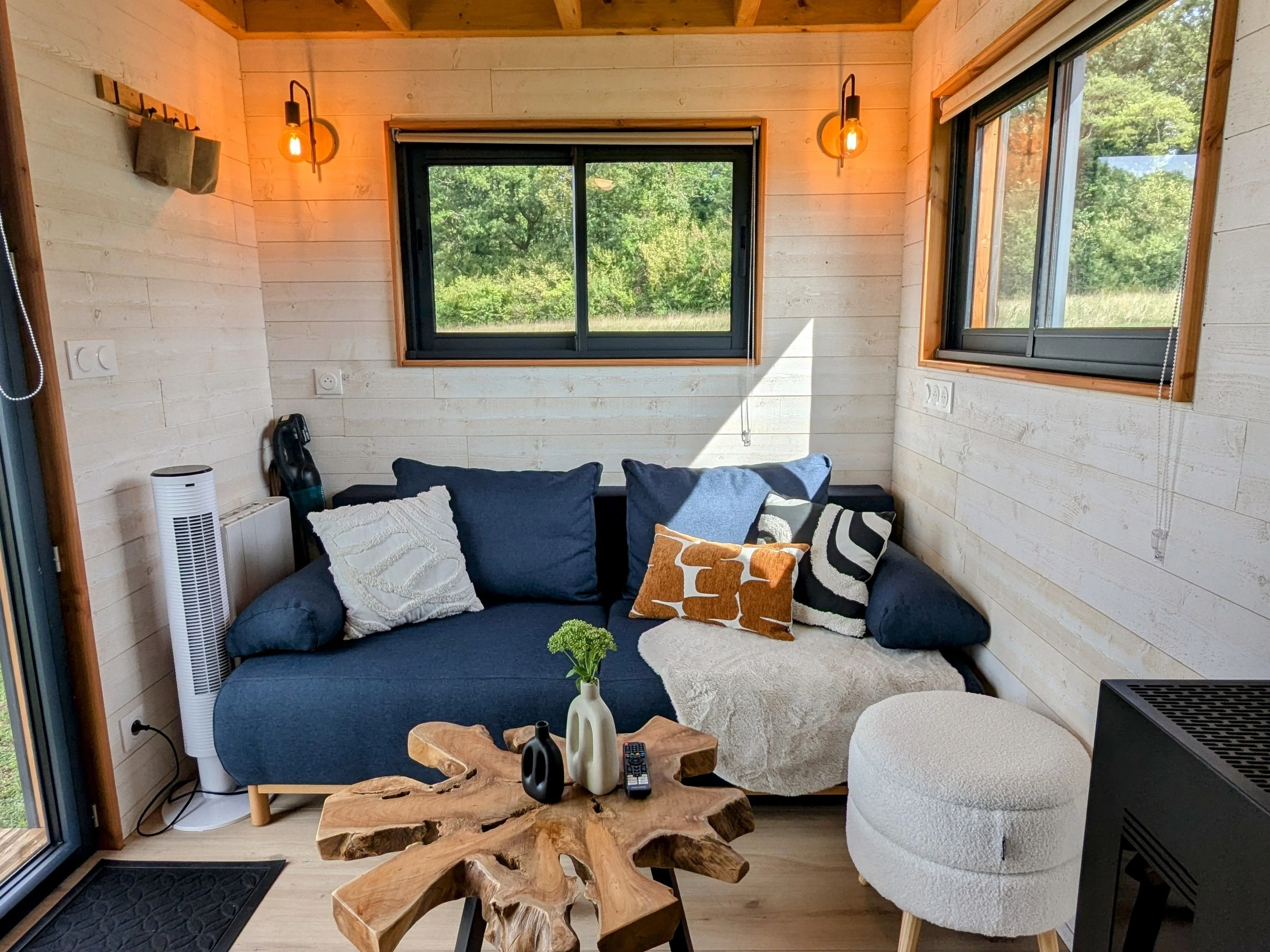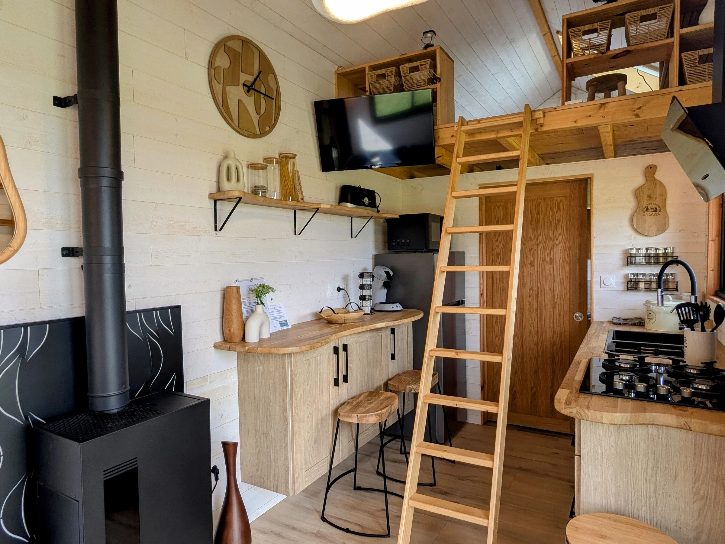 En plena naturaleza, en la cima de una colina con vistas a 3 estanques (2 de pesca y 1 para nadar), las Tiny-Houses du Valdor ofrecen dos minicasas ecológicas, 100% autónomas (sin conexión a la red eléctrica, paneles solares y baños secos). "L'Envolée", con su decoración cuidada y cálida, ofrece: cocina equipada, abierta al salón (sofá cama de excelente calidad), baño con ducha grande, lavabo e inodoro seco. Productos naturales para la higiene corporal y capilar. En la entreplanta, dormitorio abuhardillado con una cama de 140 cm (acceso por escalera), segunda zona de descanso con una cama de 80 cm (acceso por escalera). Televisión. Wifi (a veces un poco inestable). Estufa de pellets en invierno y aire acondicionado en verano (uso moderado). Alojamiento no apto para personas con movilidad reducida. Exterior: mesa de picnic, sombrilla, barbacoa, 2 tumbonas. Acceso directo a los estanques por un pequeño sendero forestal. Aparcamiento privado.