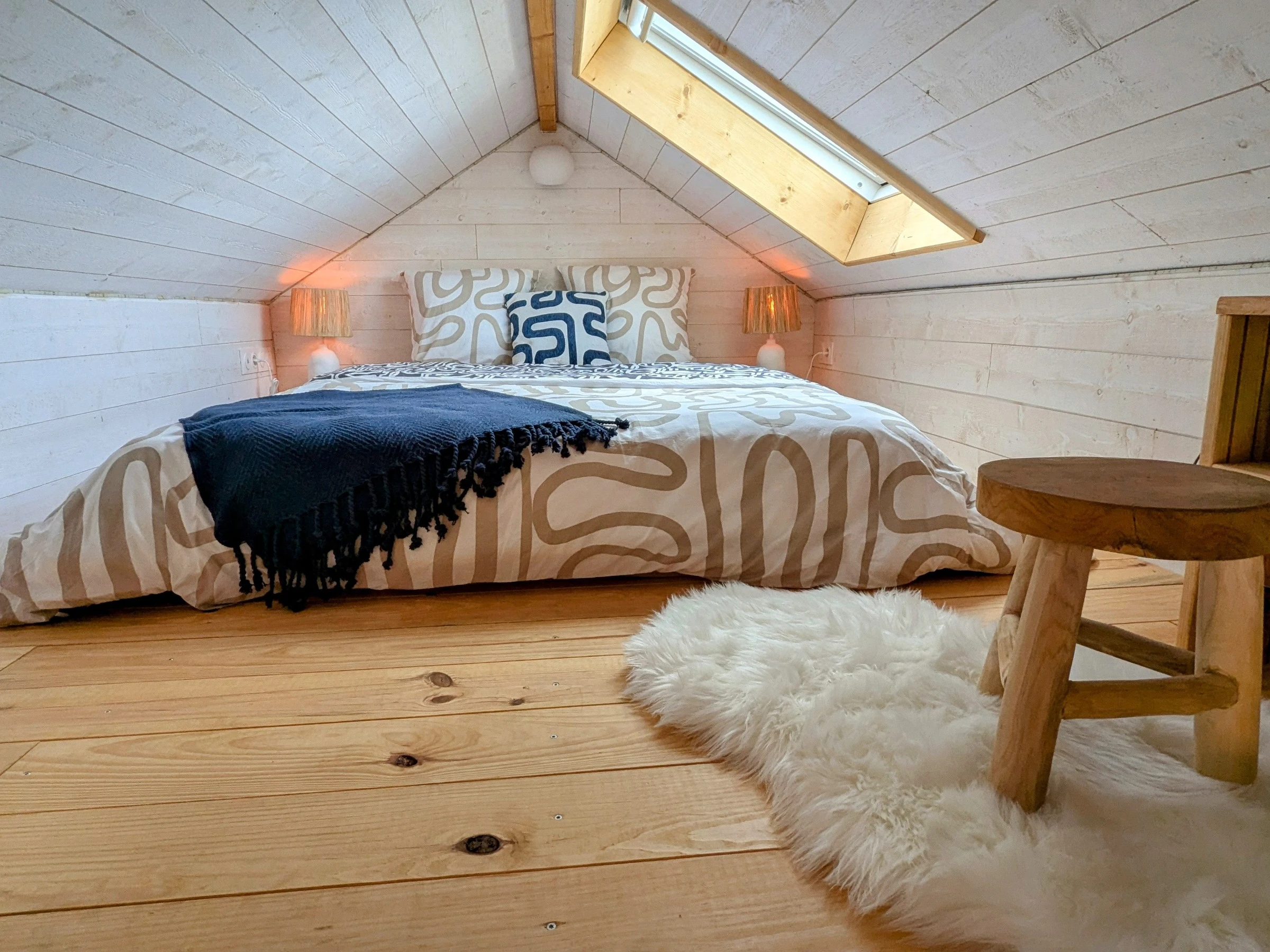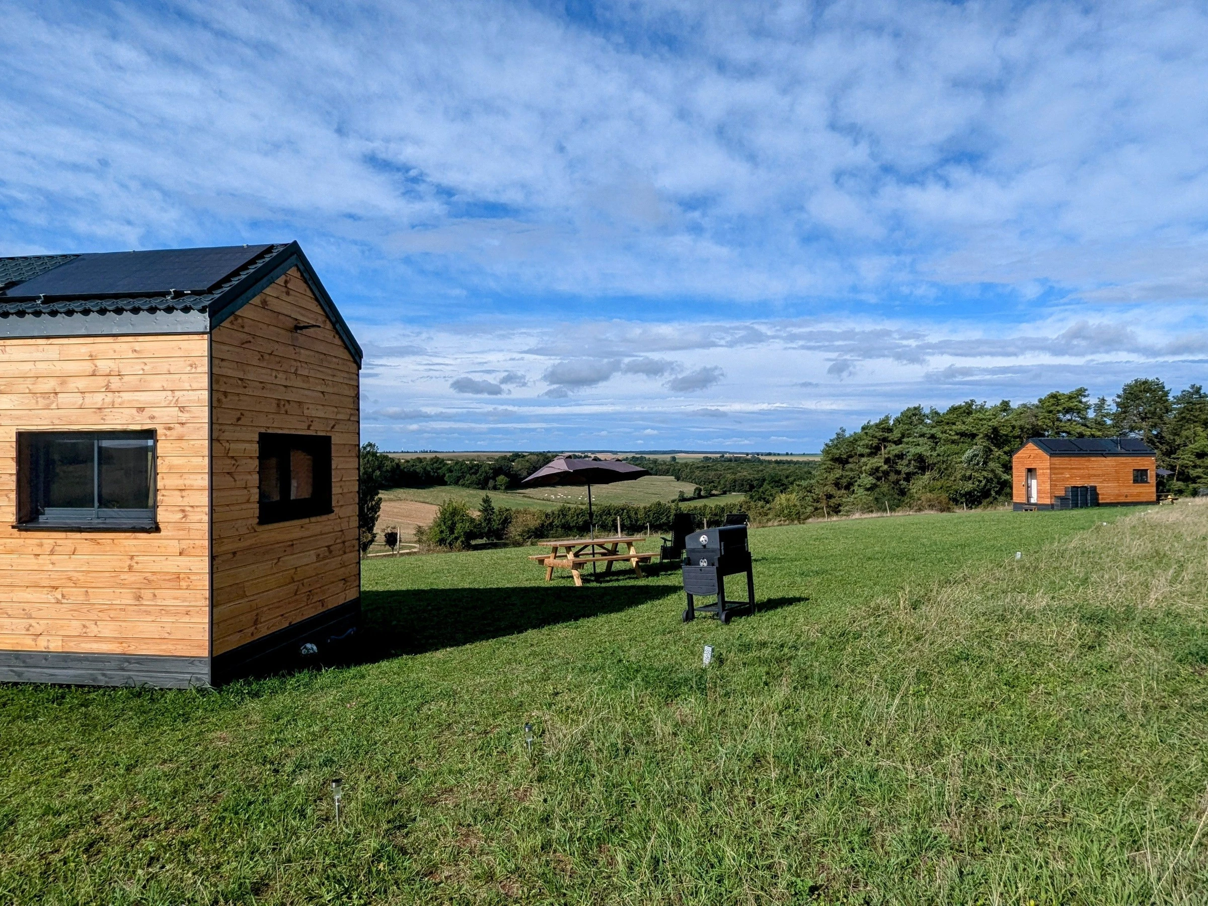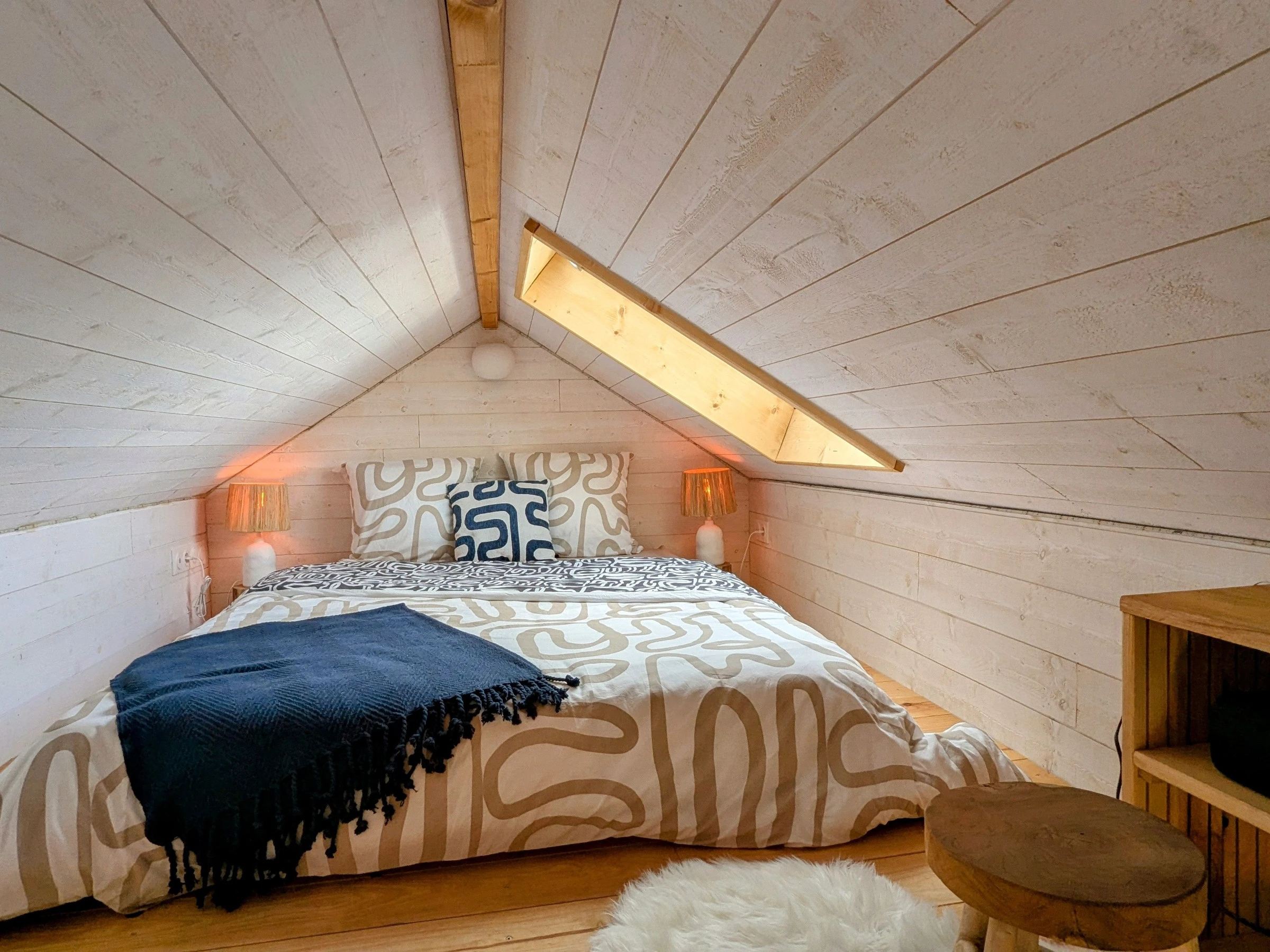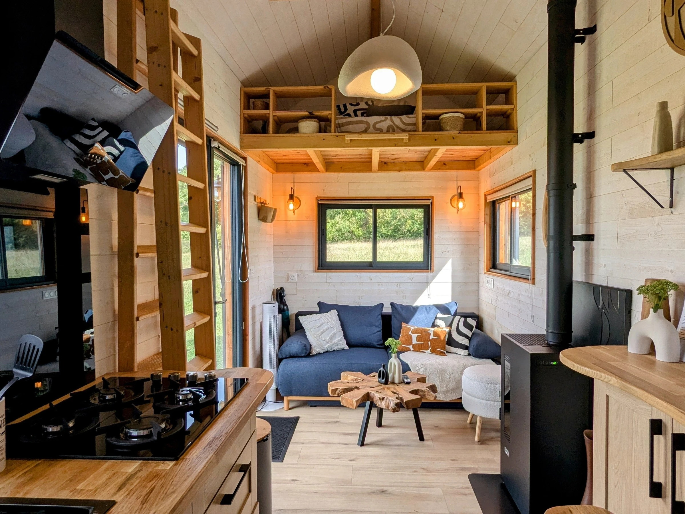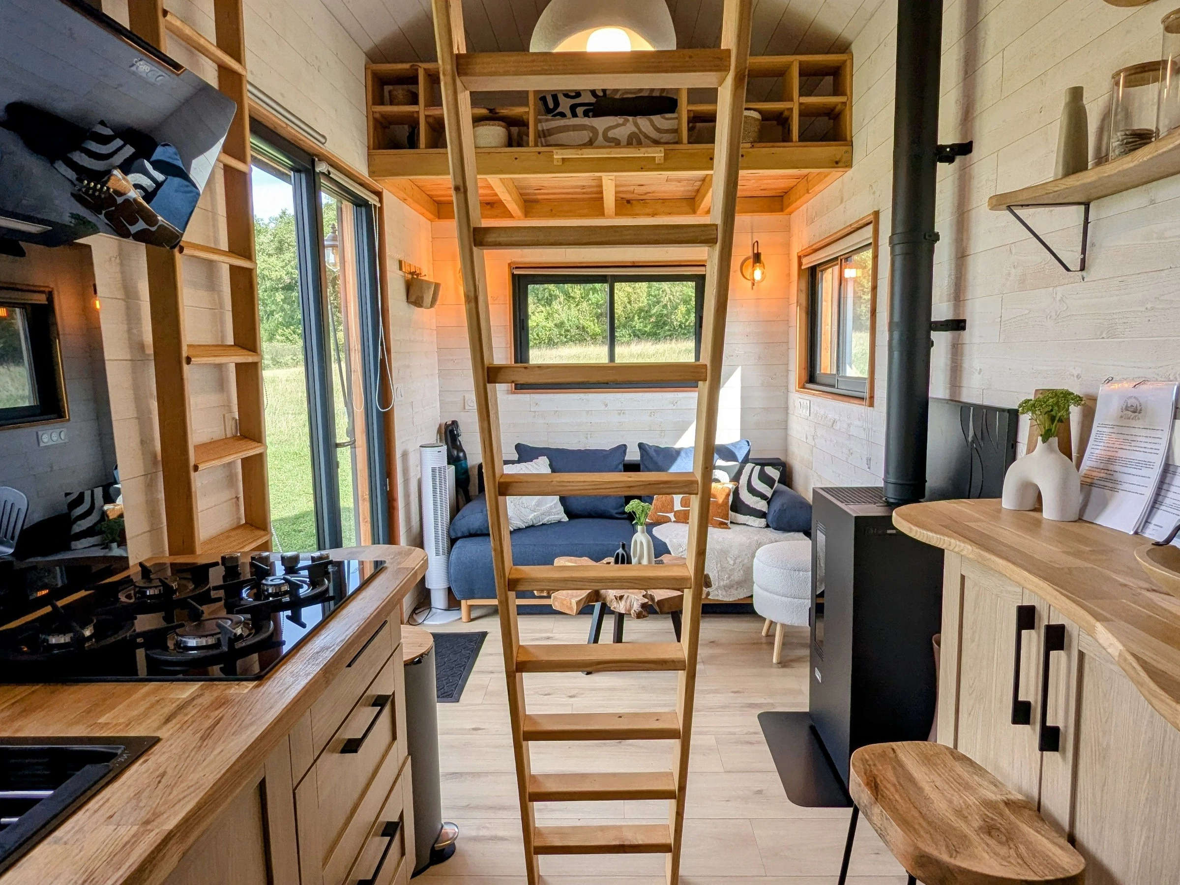 En plena naturaleza, en la cima de una colina con vistas a 3 estanques (2 de pesca y 1 para nadar), las Tiny-Houses du Valdor ofrecen dos minicasas ecológicas, 100% autónomas (sin conexión a la red eléctrica, paneles solares y baños secos). "L'Envolée", con su decoración cuidada y cálida, ofrece: cocina equipada, abierta al salón (sofá cama de excelente calidad), baño con ducha grande, lavabo e inodoro seco. Productos naturales para la higiene corporal y capilar. En la entreplanta, dormitorio abuhardillado con una cama de 140 cm (acceso por escalera), segunda zona de descanso con una cama de 80 cm (acceso por escalera). Televisión. Wifi (a veces un poco inestable). Estufa de pellets en invierno y aire acondicionado en verano (uso moderado). Alojamiento no apto para personas con movilidad reducida. Exterior: mesa de picnic, sombrilla, barbacoa, 2 tumbonas. Acceso directo a los estanques por un pequeño sendero forestal. Aparcamiento privado.