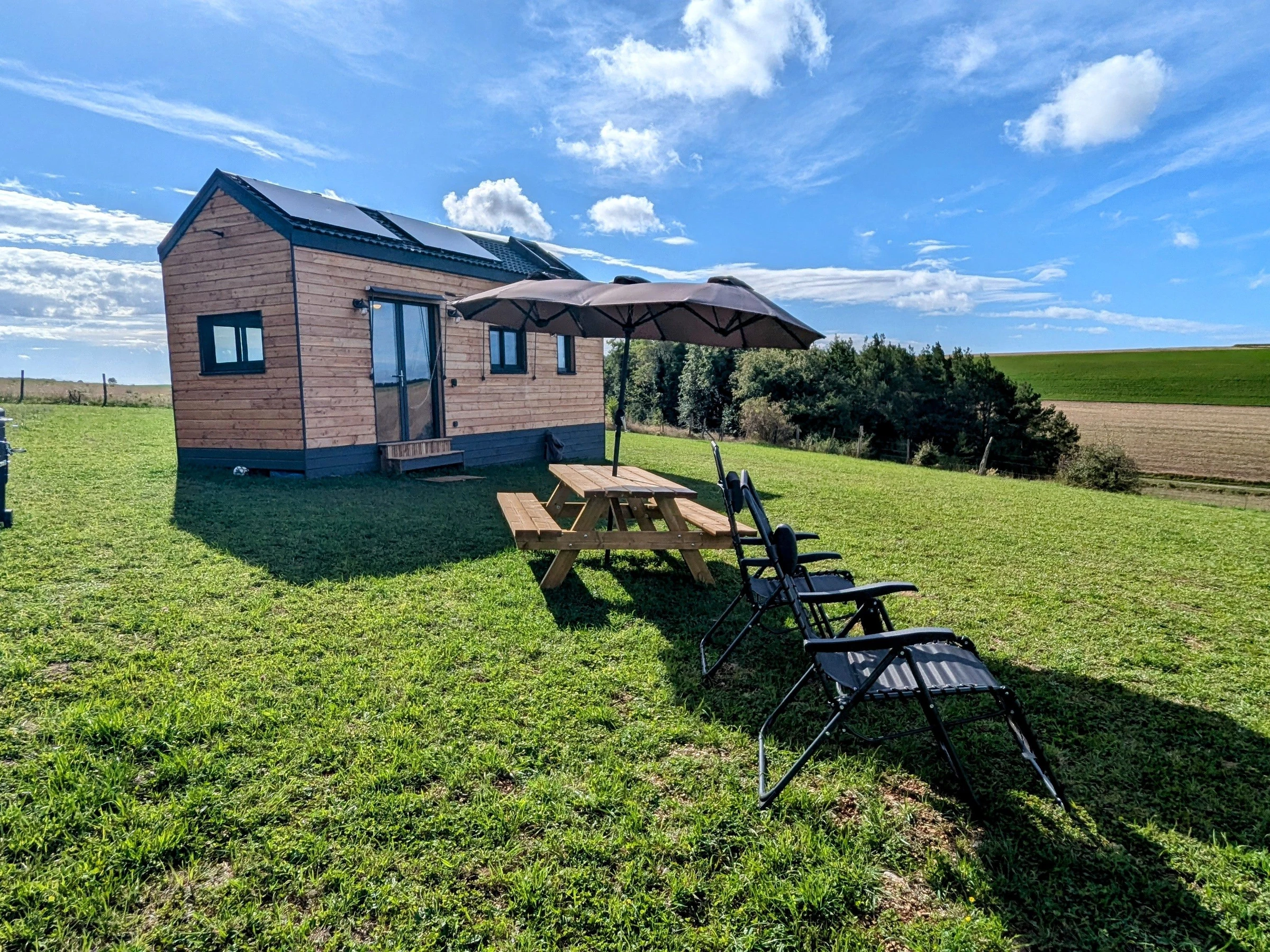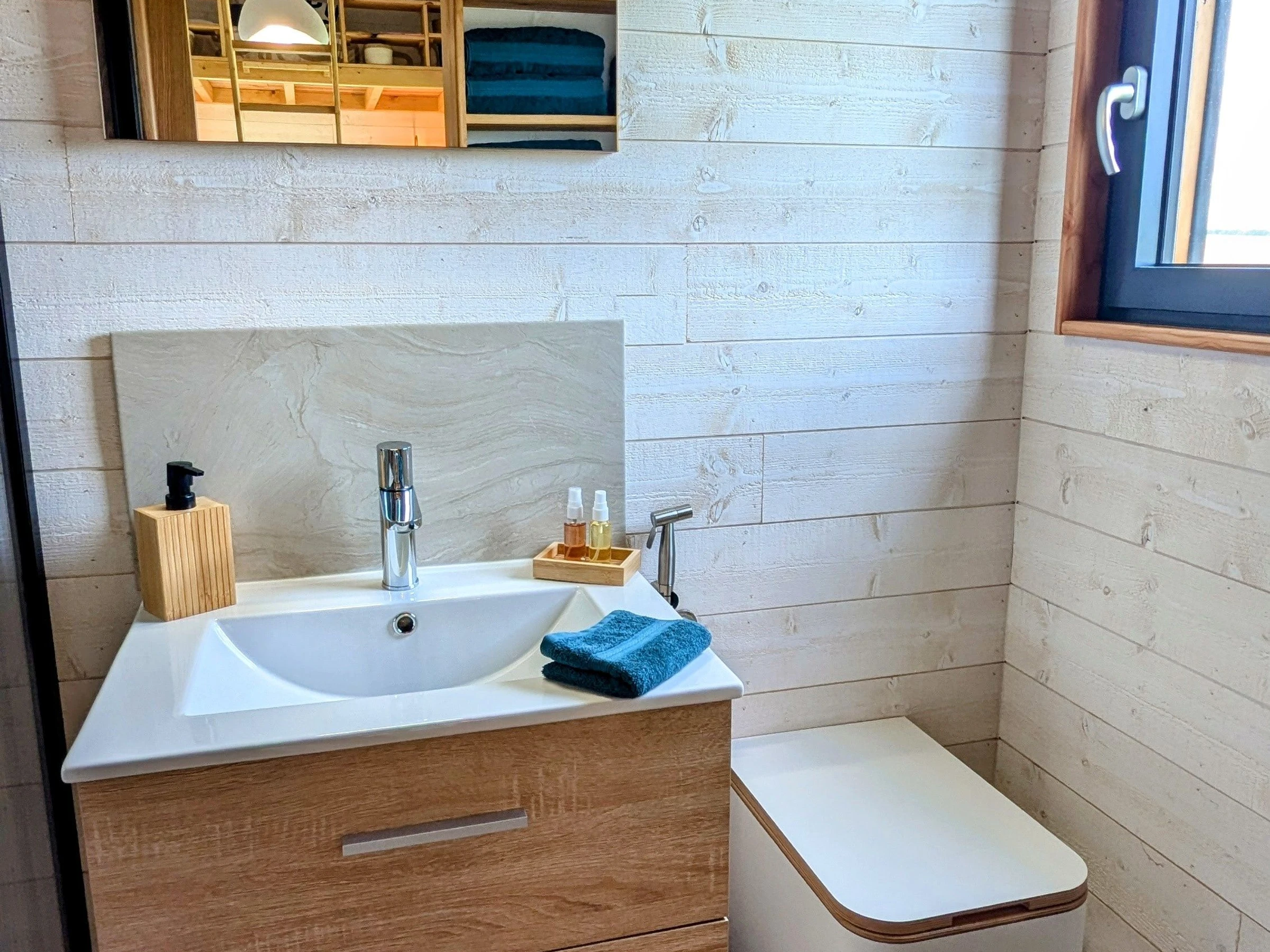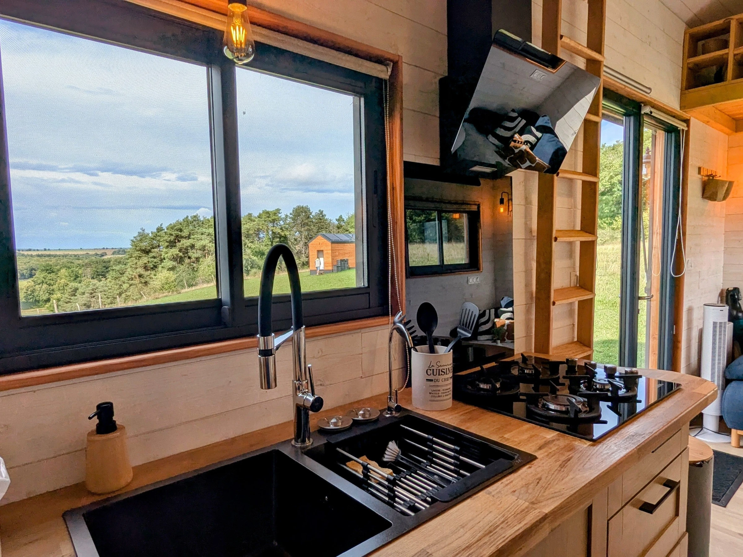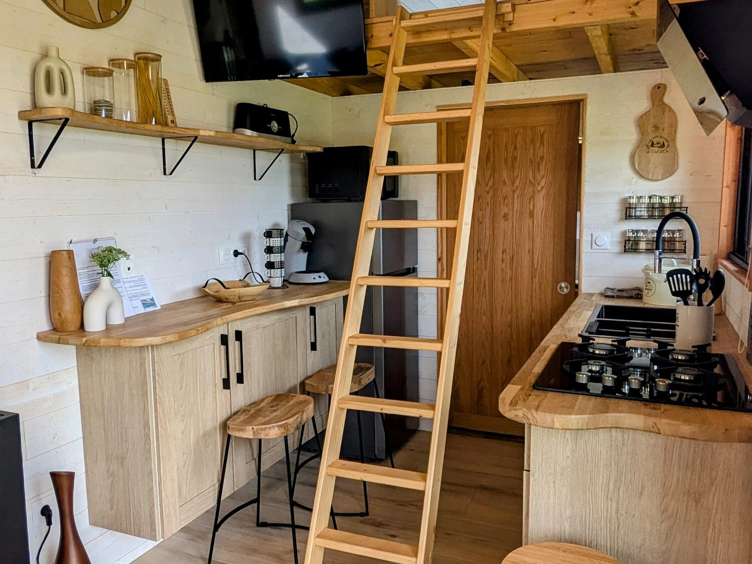 En plena naturaleza, en la cima de una colina con vistas a 3 estanques (2 de pesca y 1 para nadar), las Tiny-Houses du Valdor ofrecen dos minicasas ecológicas, 100% autónomas (sin conexión a la red eléctrica, paneles solares y baños secos). "L'Envolée", con su decoración cuidada y cálida, ofrece: cocina equipada, abierta al salón (sofá cama de excelente calidad), baño con ducha grande, lavabo e inodoro seco. Productos naturales para la higiene corporal y capilar. En la entreplanta, dormitorio abuhardillado con una cama de 140 cm (acceso por escalera), segunda zona de descanso con una cama de 80 cm (acceso por escalera). Televisión. Wifi (a veces un poco inestable). Estufa de pellets en invierno y aire acondicionado en verano (uso moderado). Alojamiento no apto para personas con movilidad reducida. Exterior: mesa de picnic, sombrilla, barbacoa, 2 tumbonas. Acceso directo a los estanques por un pequeño sendero forestal. Aparcamiento privado.