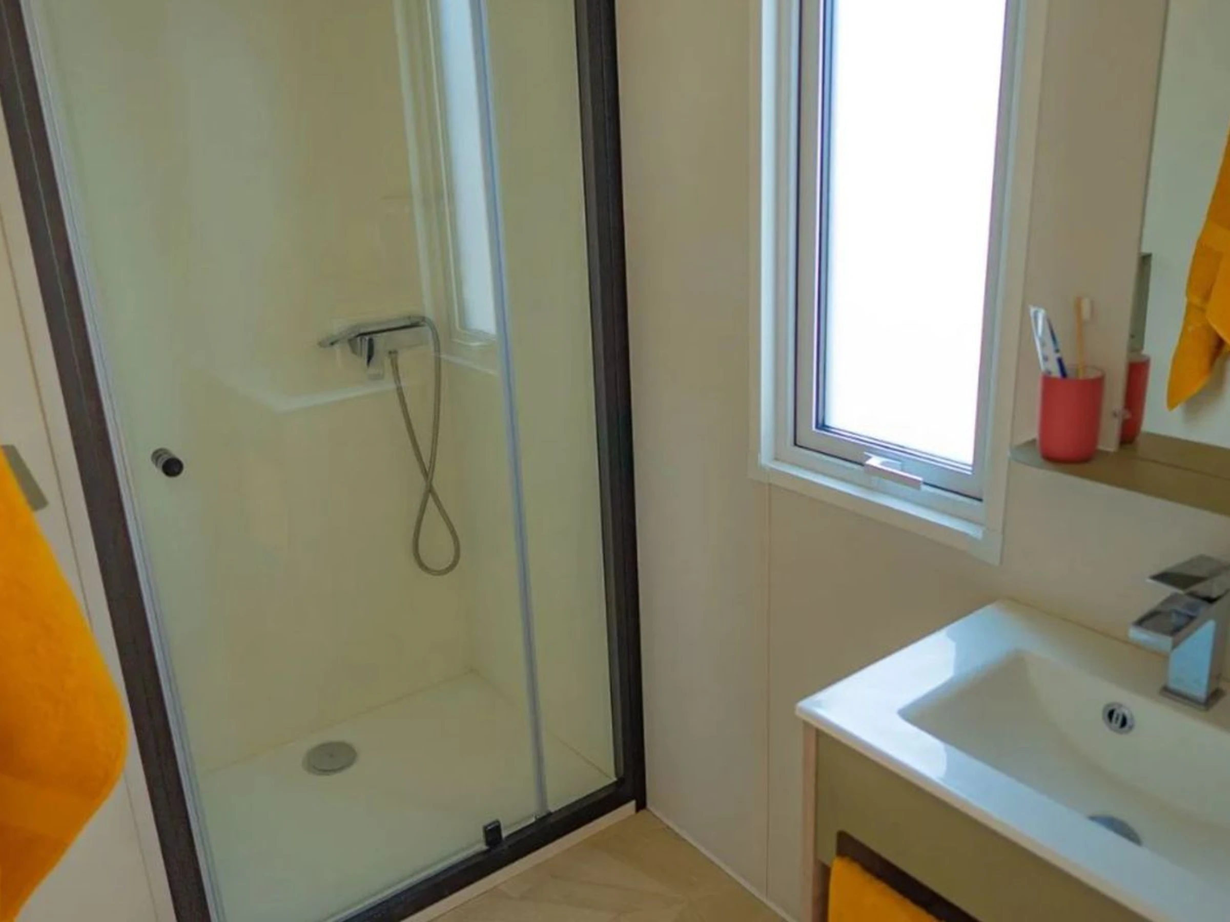 - Bloque sanitario con ducha, inodoro y lavadora (ficha: 5 € / cápsula de detergente: 0,70 €)